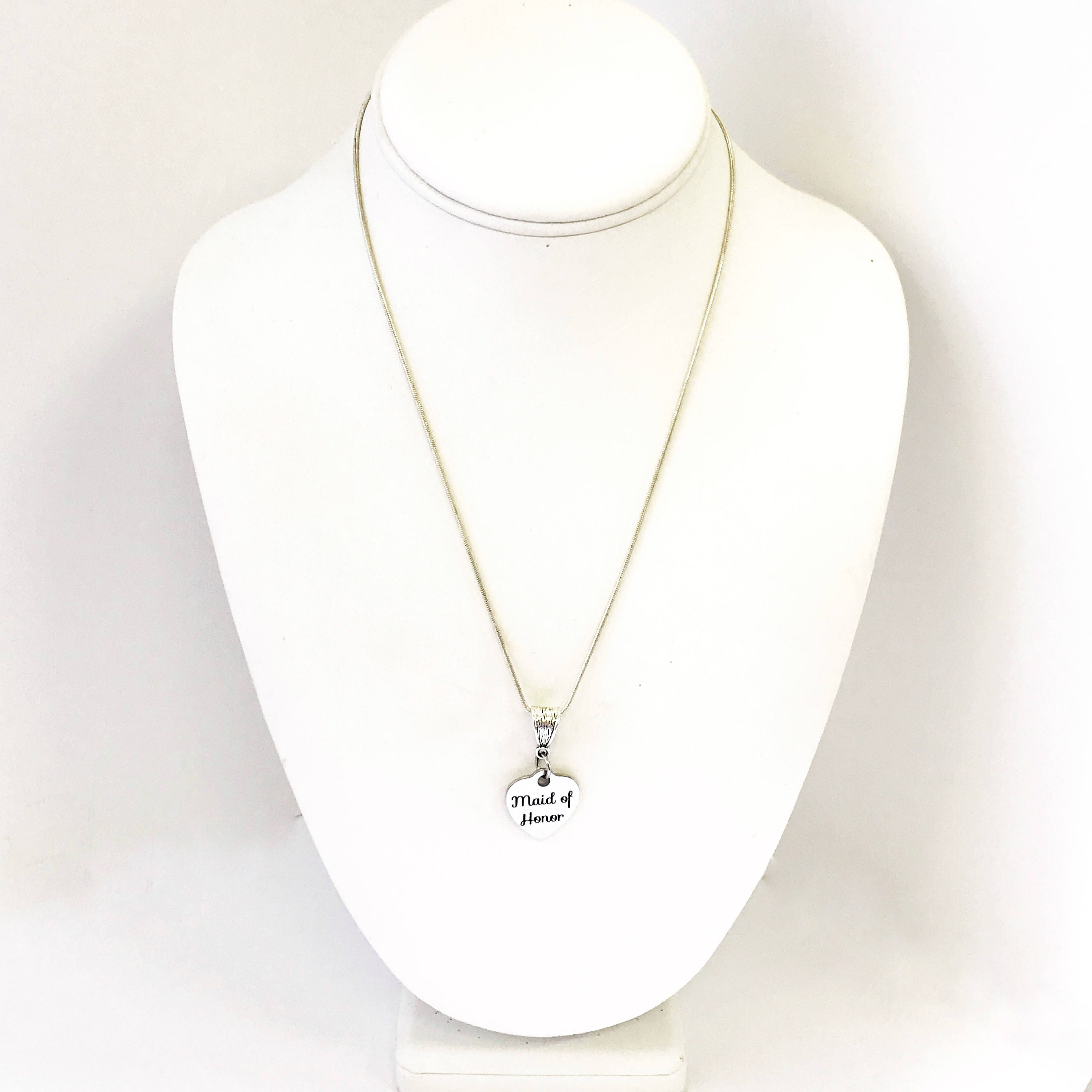 This is a beautiful stainless steel laser engraved pendant with "Maid Of Honor" on your choice of a 16, 18, 20, 22, 24, 26, 28 or 30 inch sterling silver plated snake chain. This would make a beautiful gift to give your maid of honor on your wedding day.