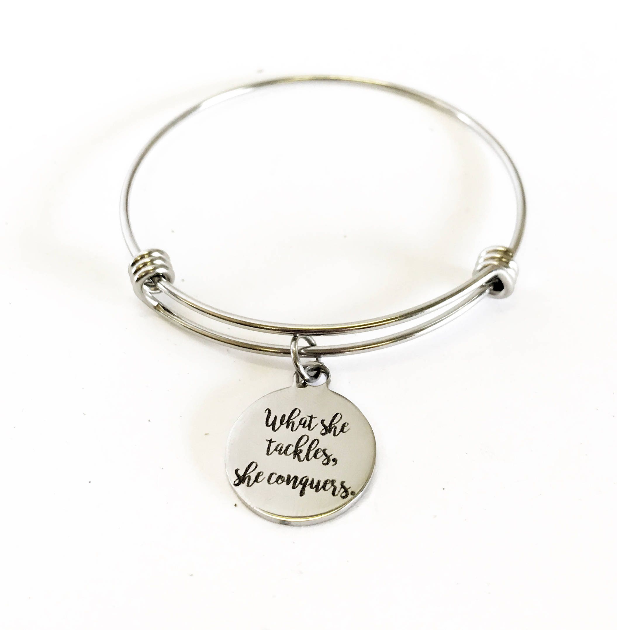 Looking for a motivational jewelry gift? This is a beautiful bangle bracelet with a laser engraved stainless steel charm that has "seize the day" on it. All components are made of high quality stainless steel so there is no worry of tarnish or color changing.