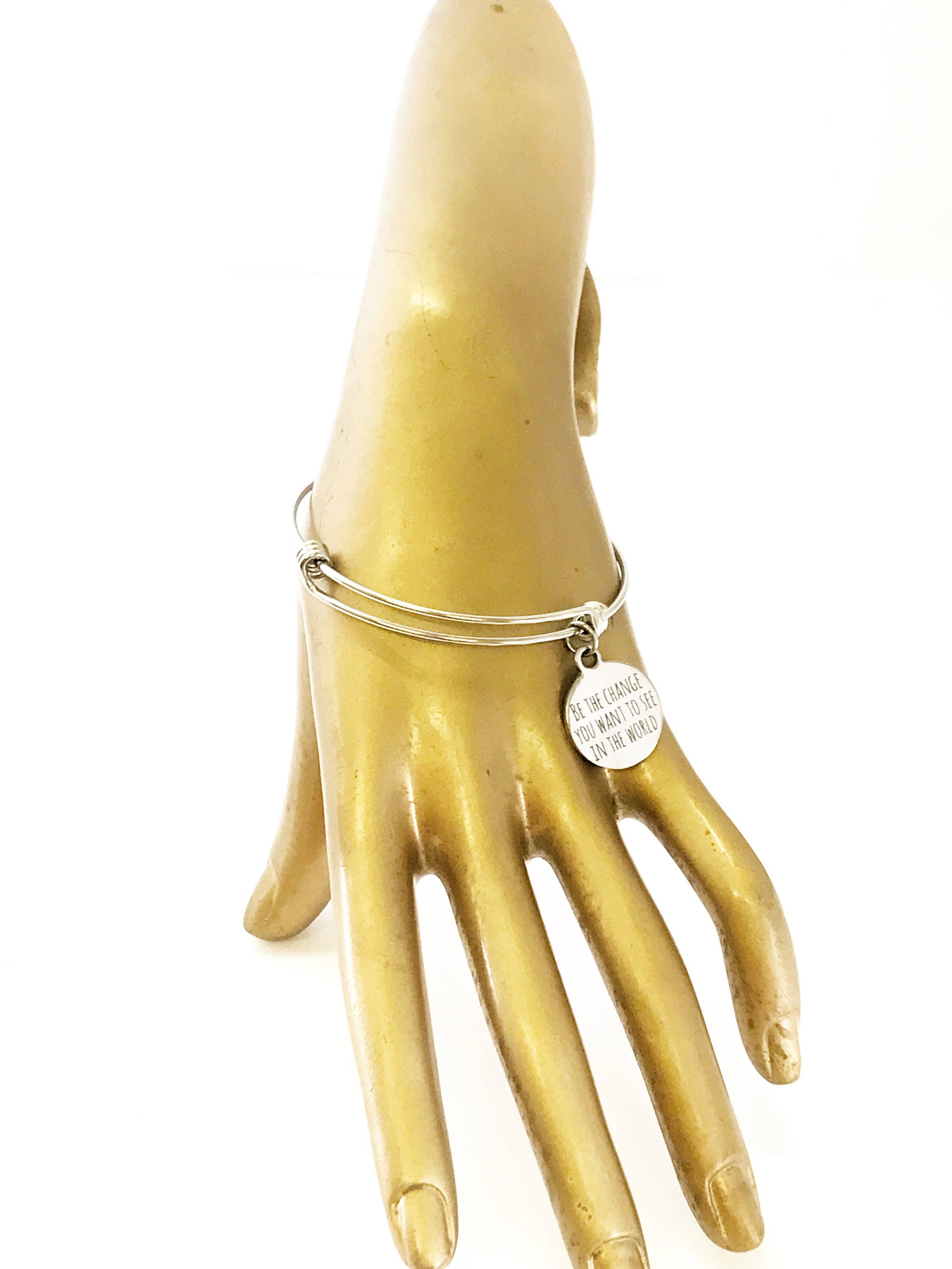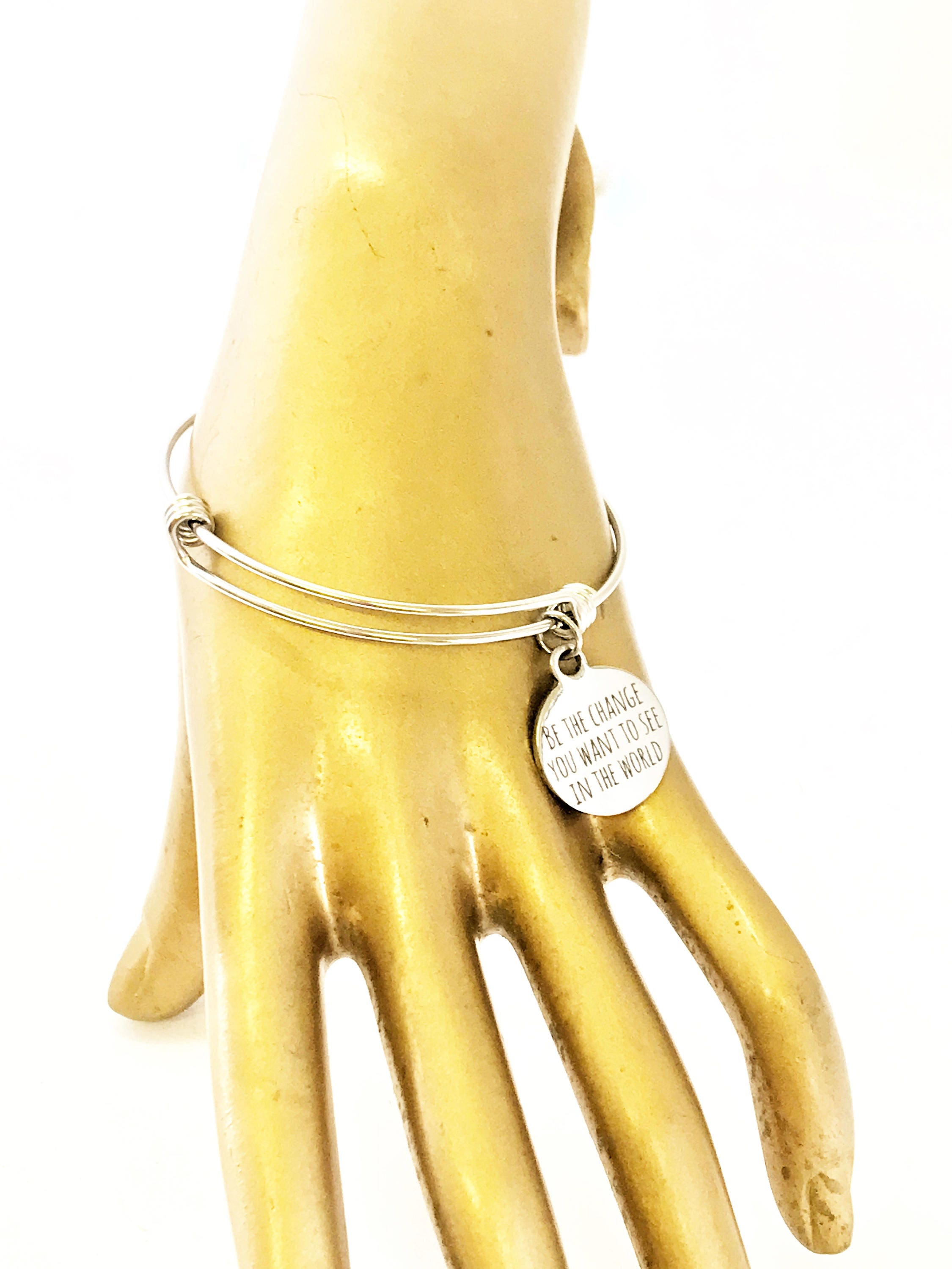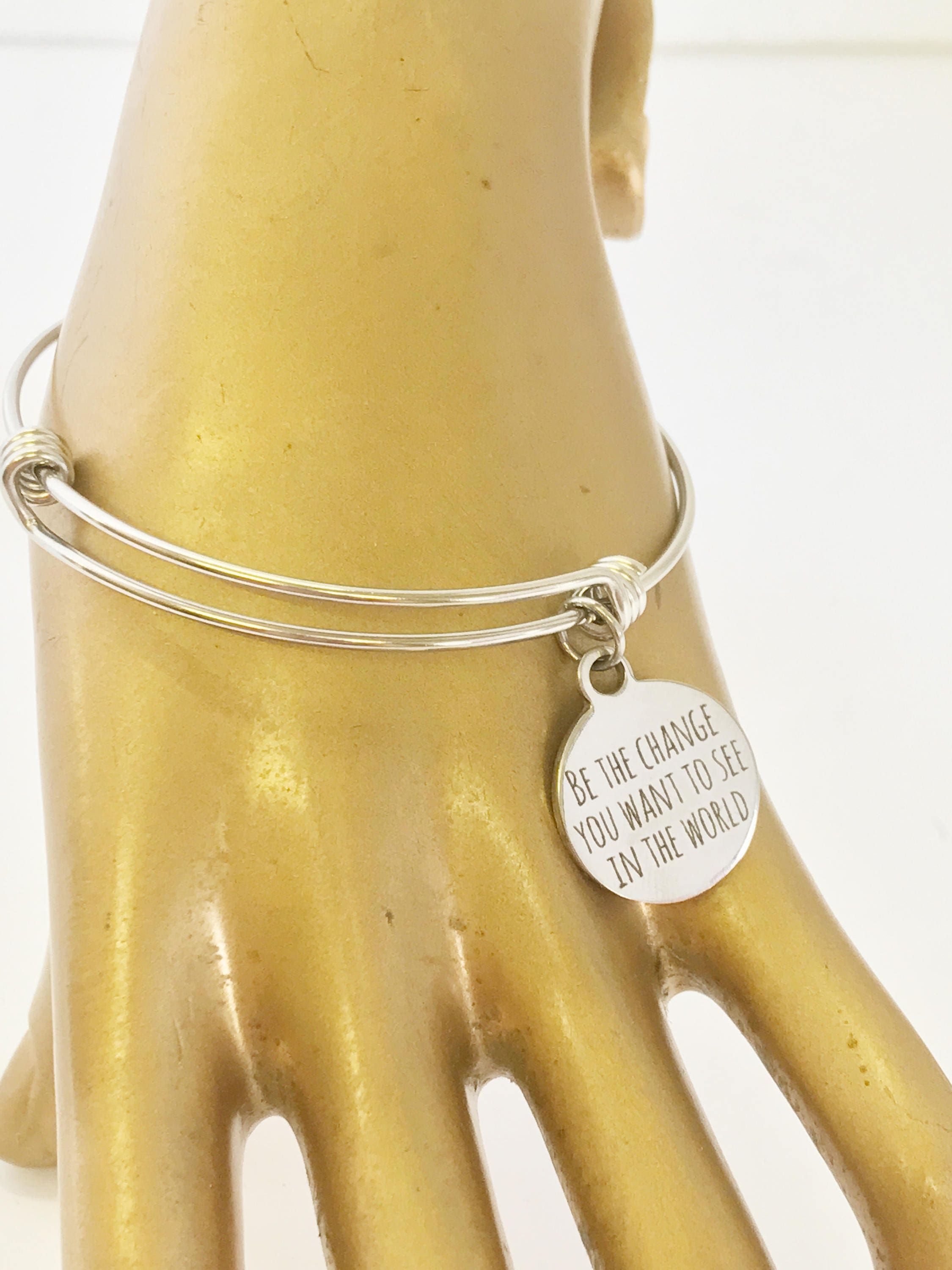 This is a beautiful bangle bracelet with a laser engraved stainless steel charm that has "Be the change you want to see in the world" on it. All components are made of high quality stainless steel so there is no worry of tarnish or color changing.