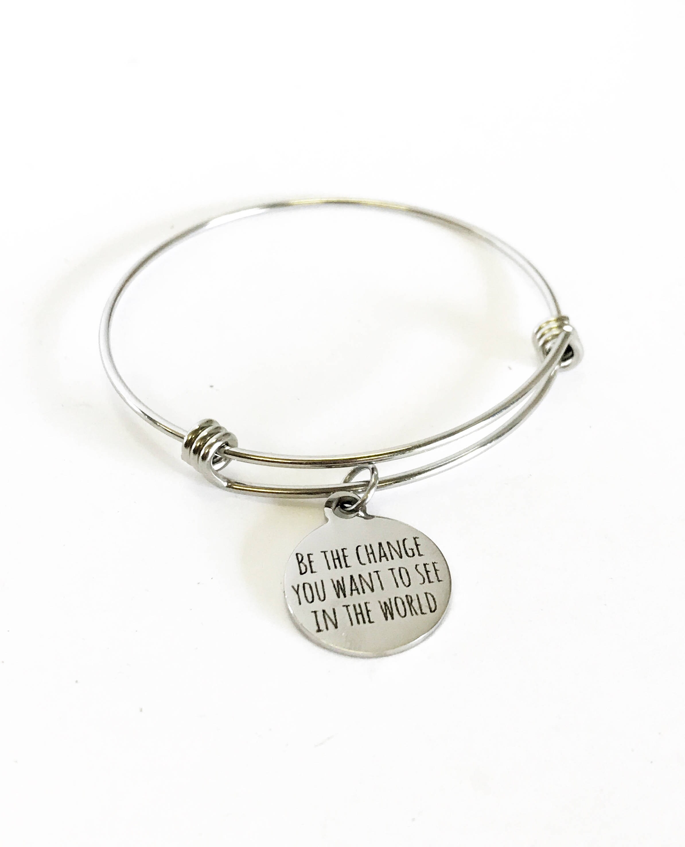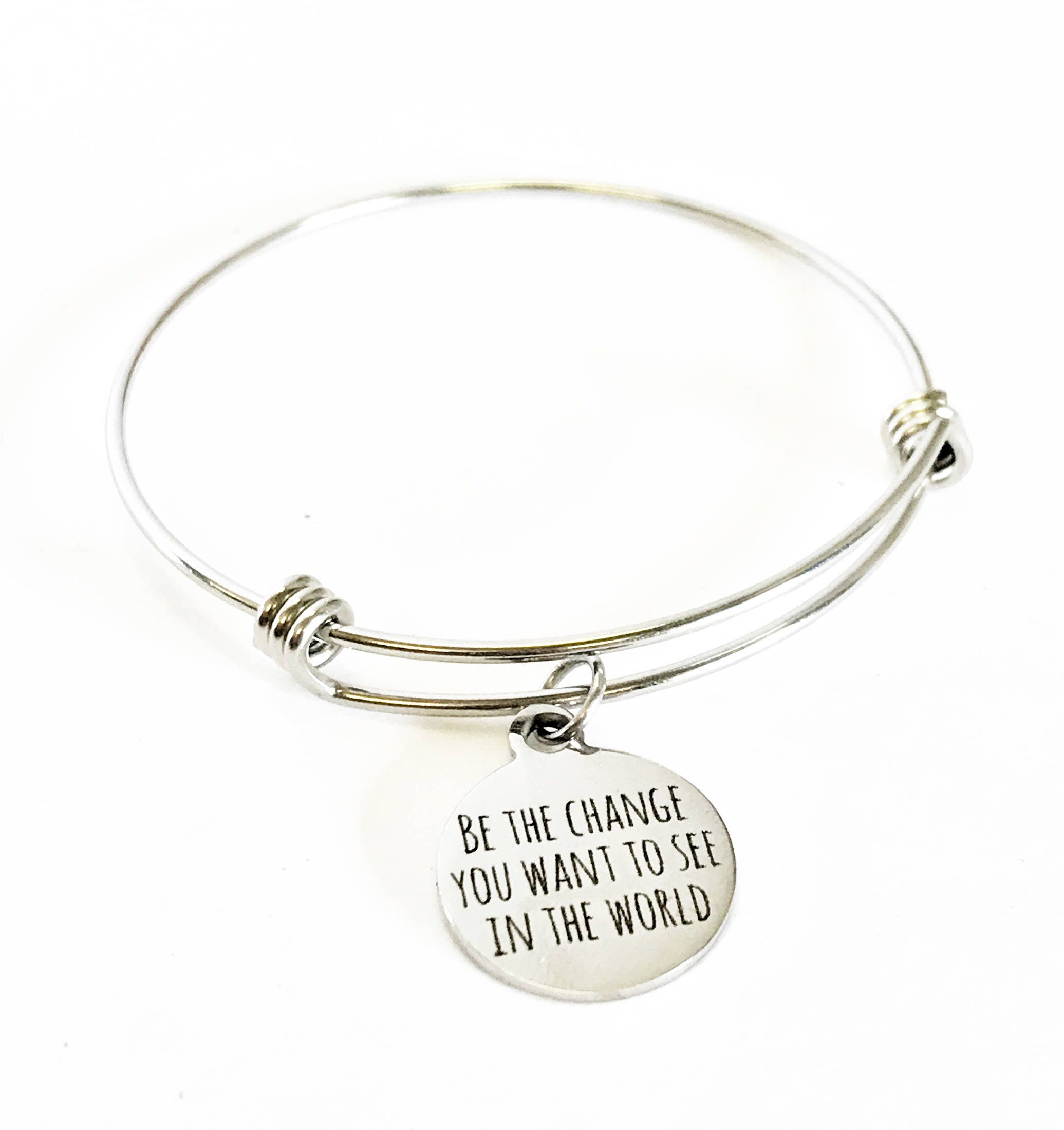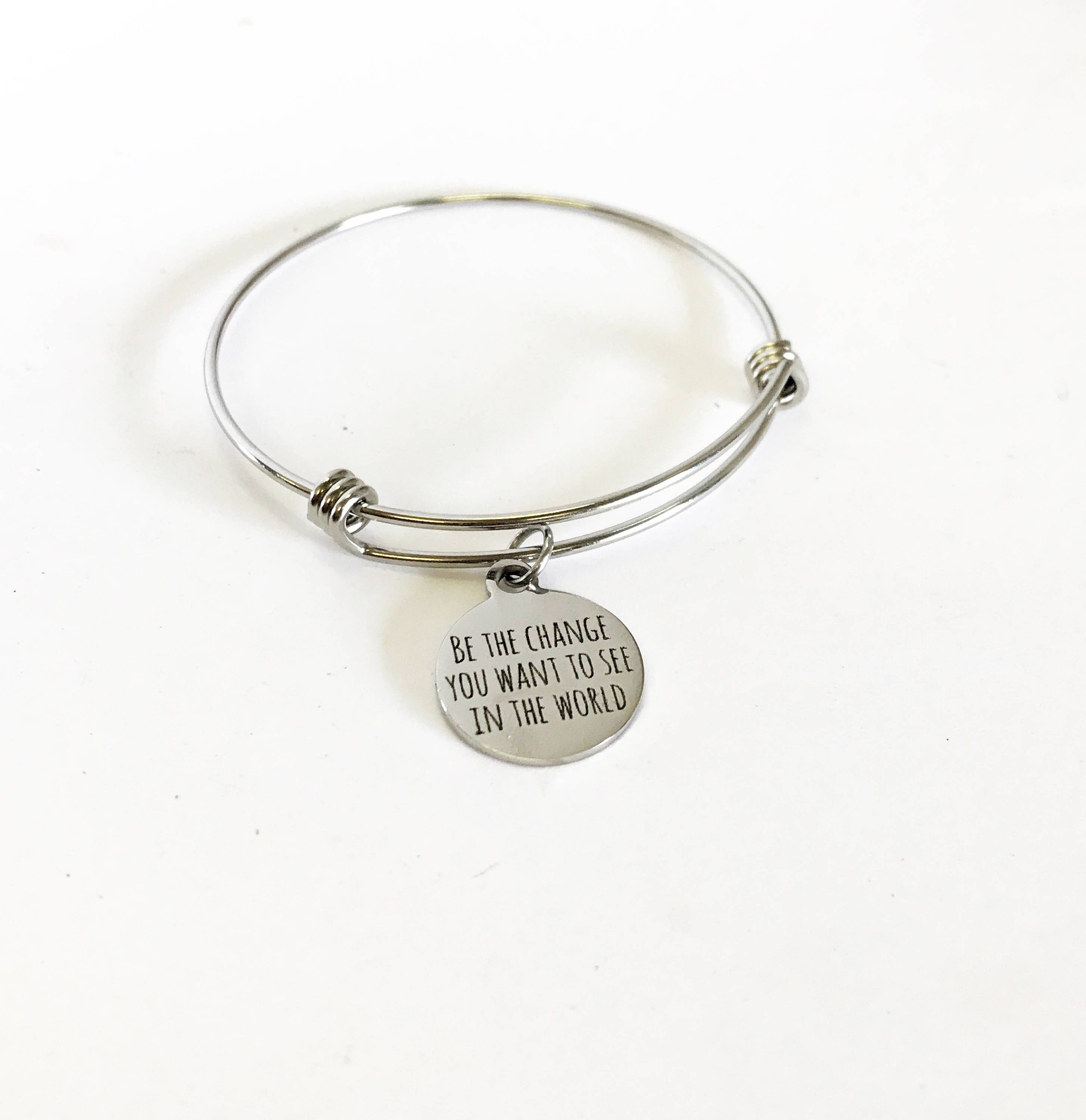 This is a beautiful bangle bracelet with a laser engraved stainless steel charm that has "Be the change you want to see in the world" on it. All components are made of high quality stainless steel so there is no worry of tarnish or color changing.