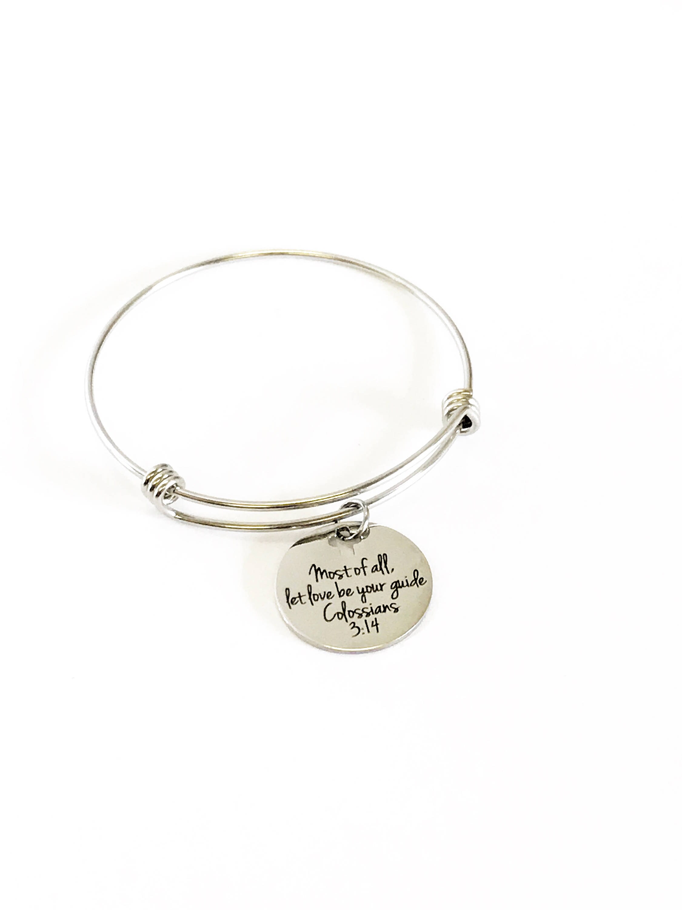 This is a beautiful bangle bracelet with a laser engraved stainless steel charm that has "Most of all let love be your guide" from Colossians 3:14 on it. All components are made of high quality stainless steel so there is no worry of tarnish or color changing.