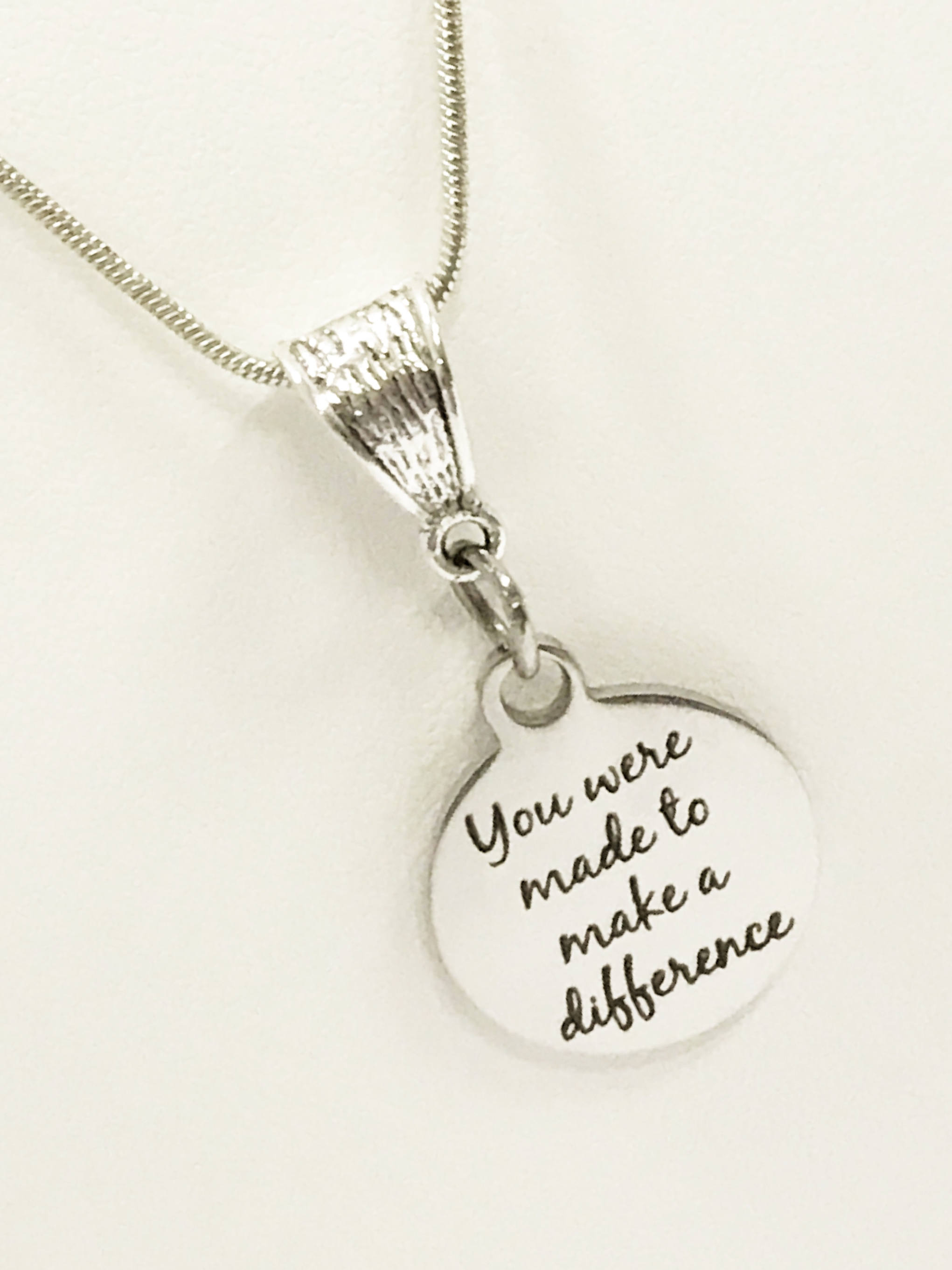 This is a stainless steel laser engraved pendant on a sterling silver plated chain. The pendant has "You were made to make a difference" on it. This pendant is available on your choice of 16, 18, 20, 22, 24, 26, 28 or 30 inch chain. The pendant is also available for individual purchase if you have another chain on which you would like to wear it.