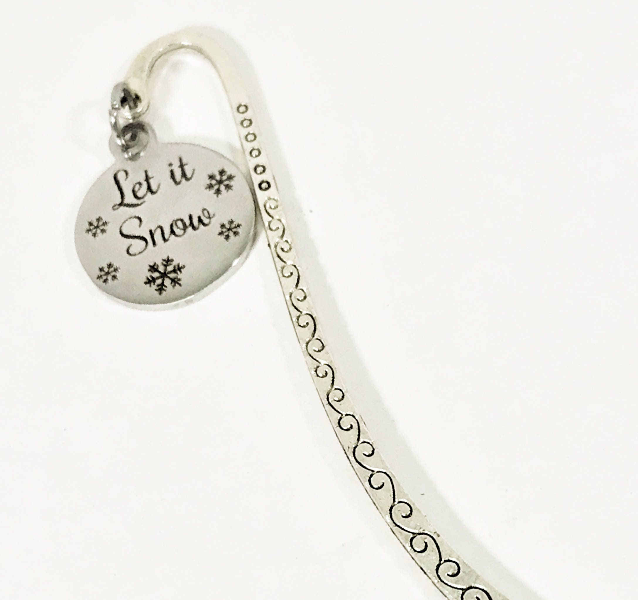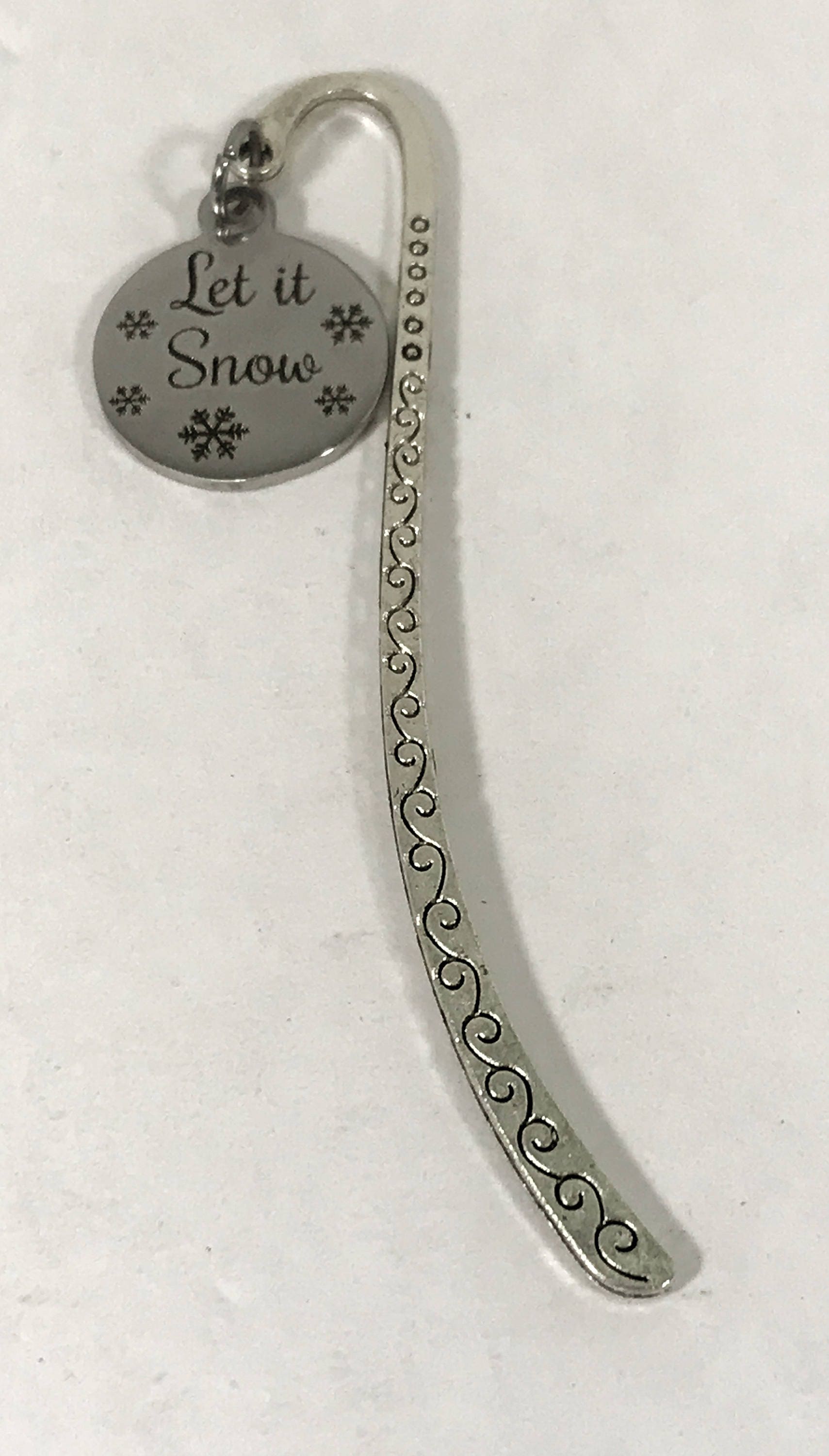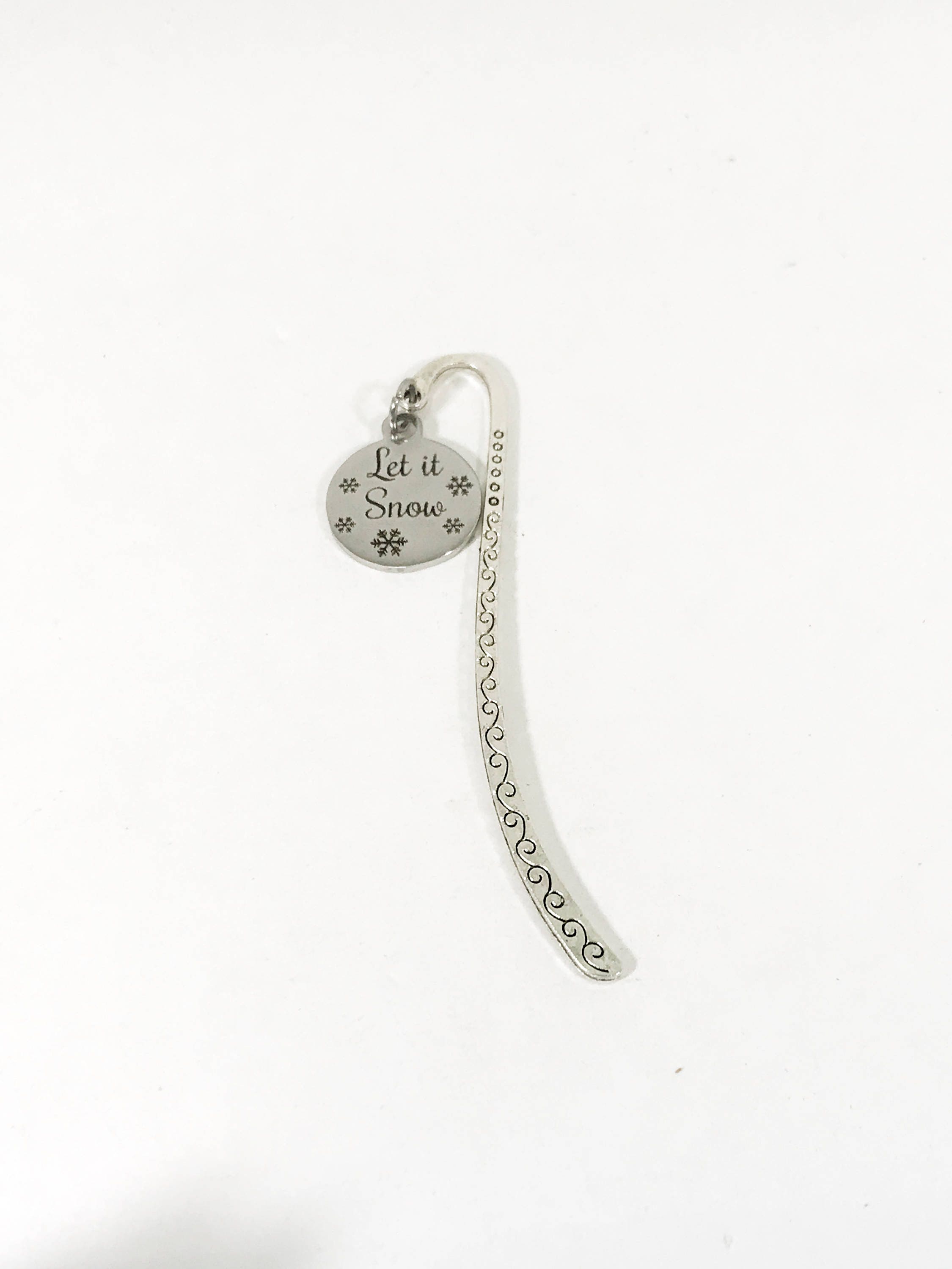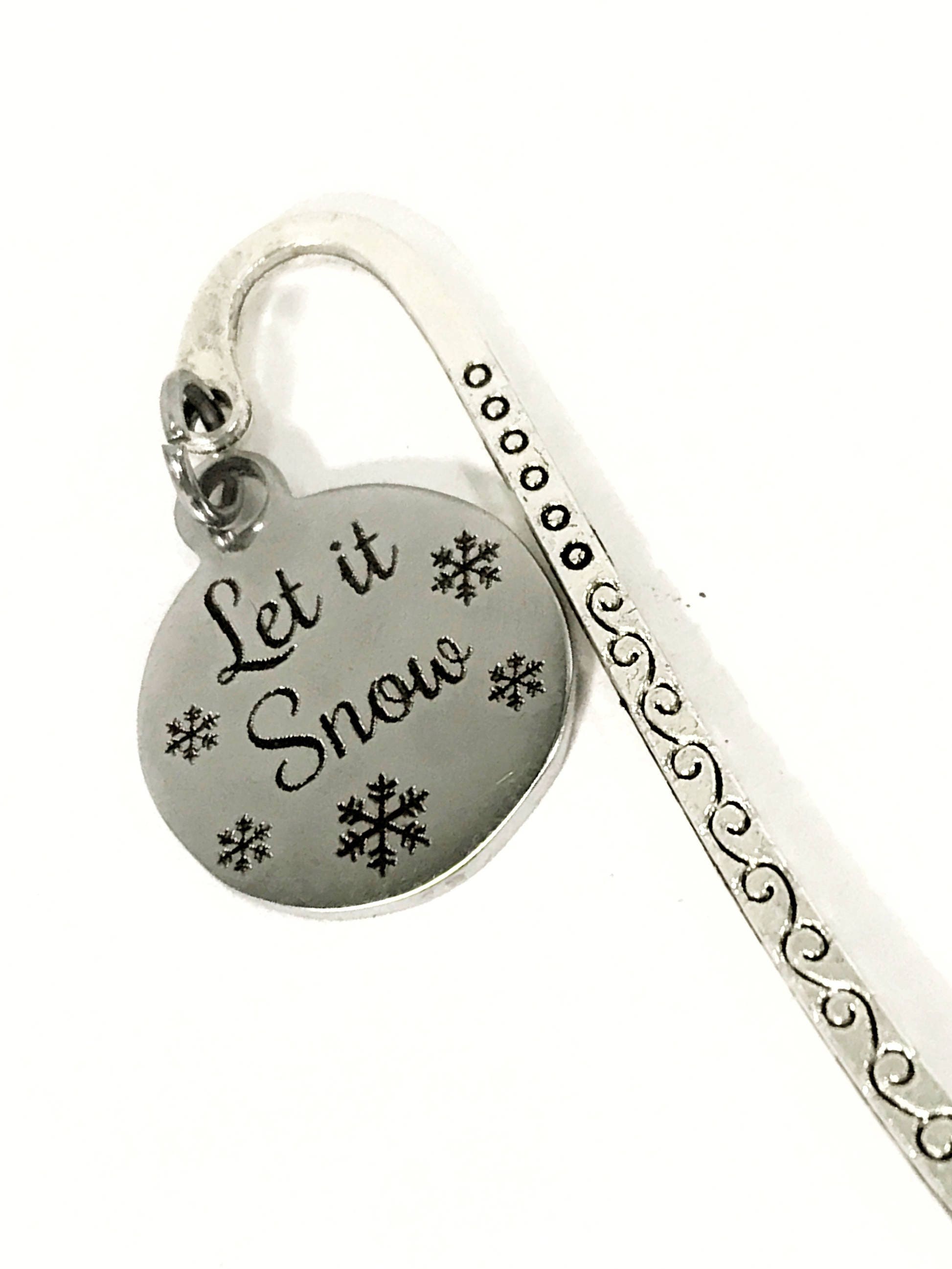 Do you love to curl up with a good book by a fire on a snowy winter day? If so, this is the perfect bookmark for you! It has a "Let it snow" stainless steel laser engraved charm on a metal bookmark. The bookmark measures approx. 3.3 Inches in length.