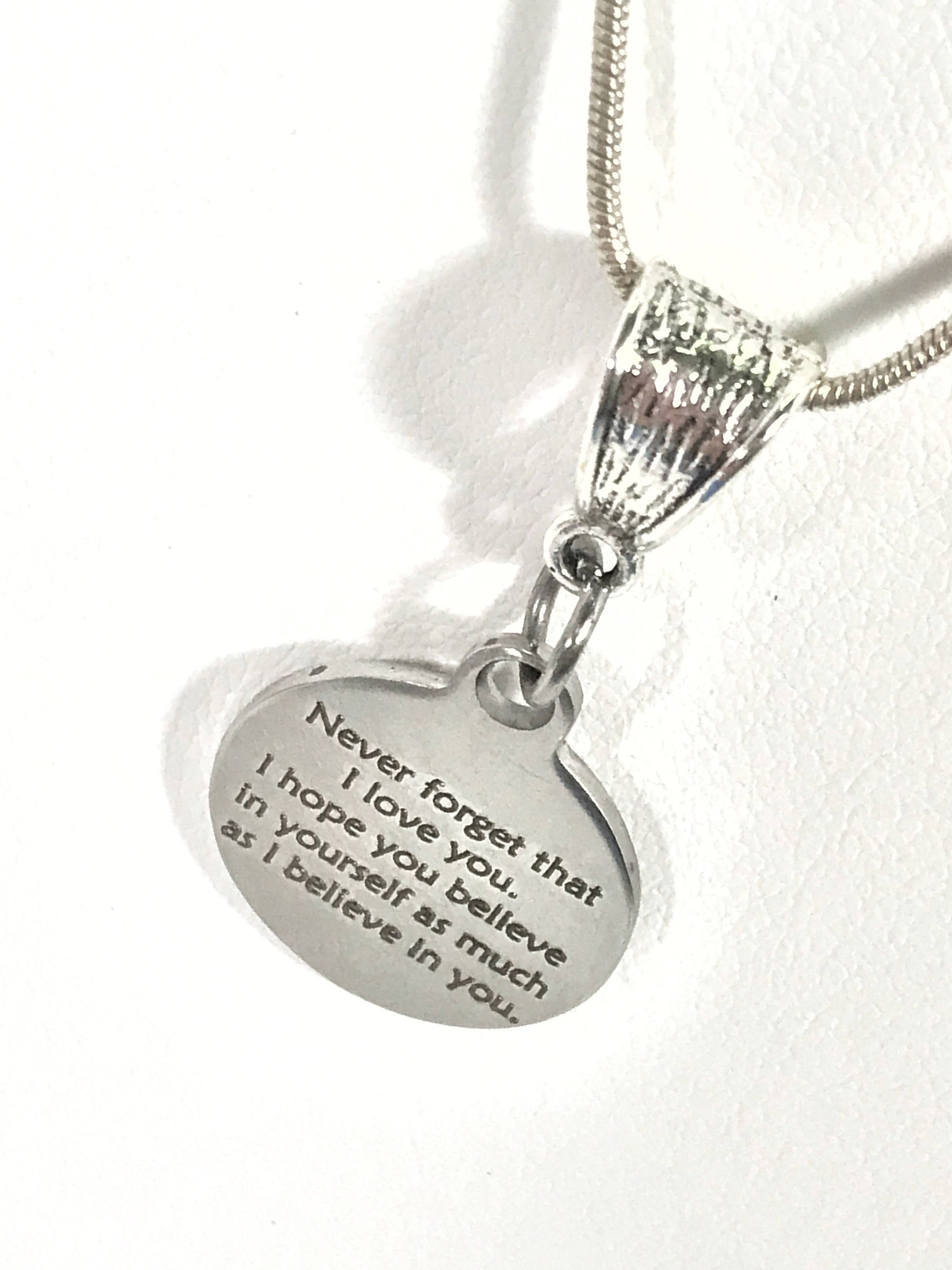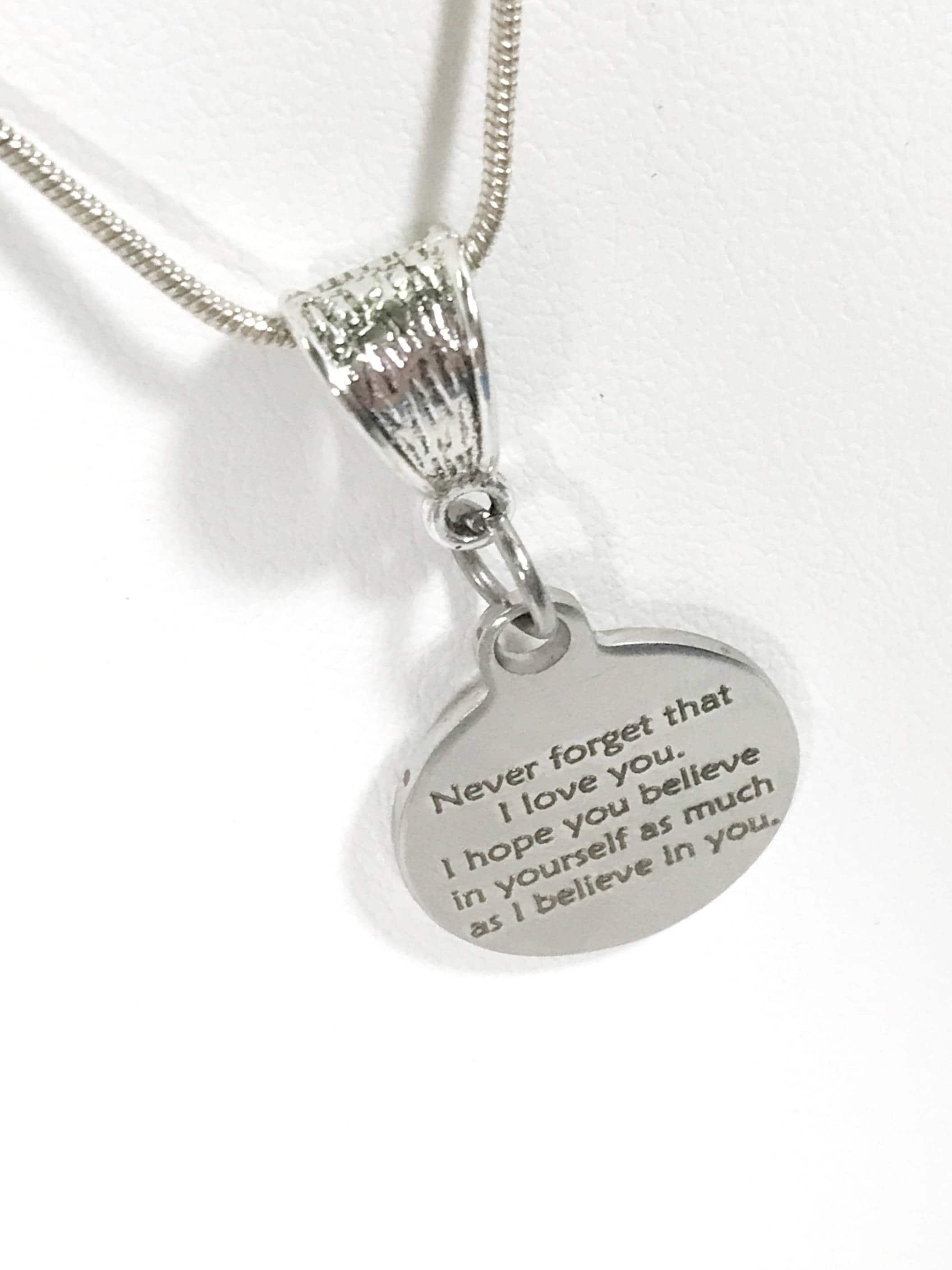 This is a stainless steel laser engraved pendant on a silver plated snake chain. The pendant says the following: