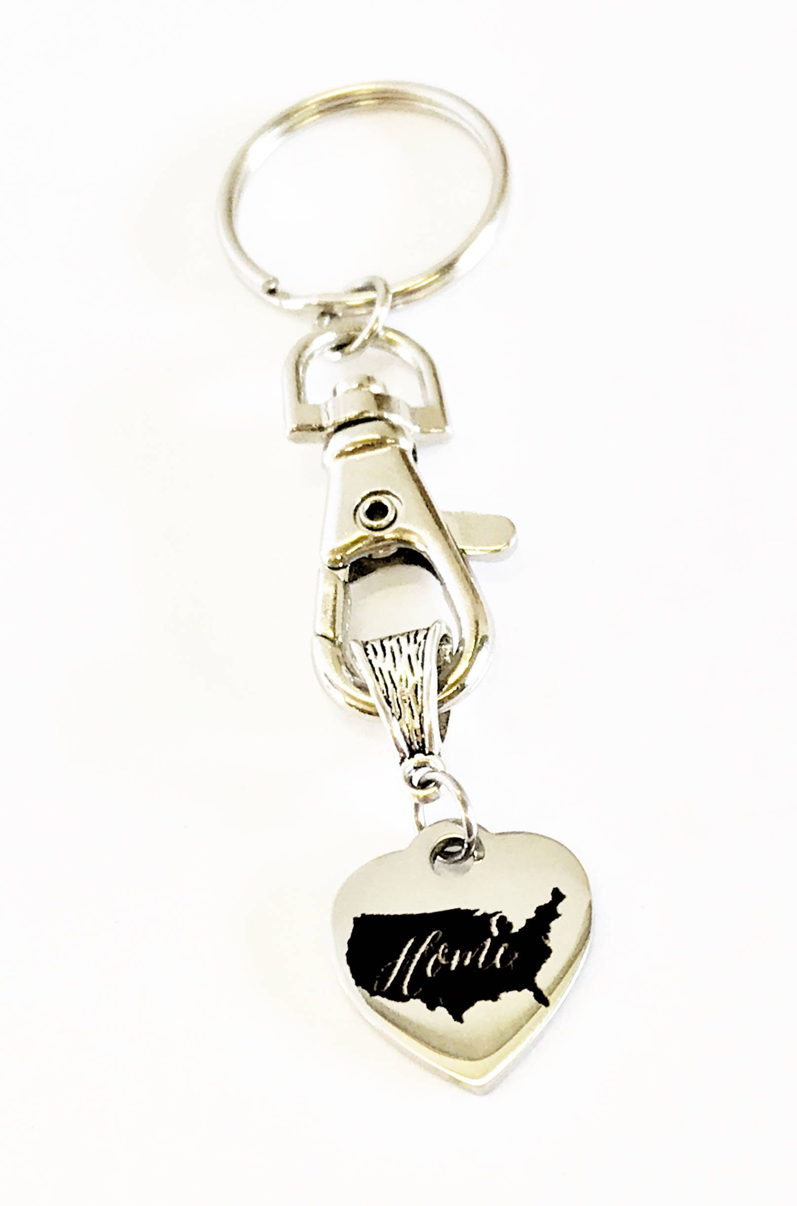 This is a great patriotic gift keychain with a heart shaped laser engraved charm that has the outline of the USA with the word "Home" in it.