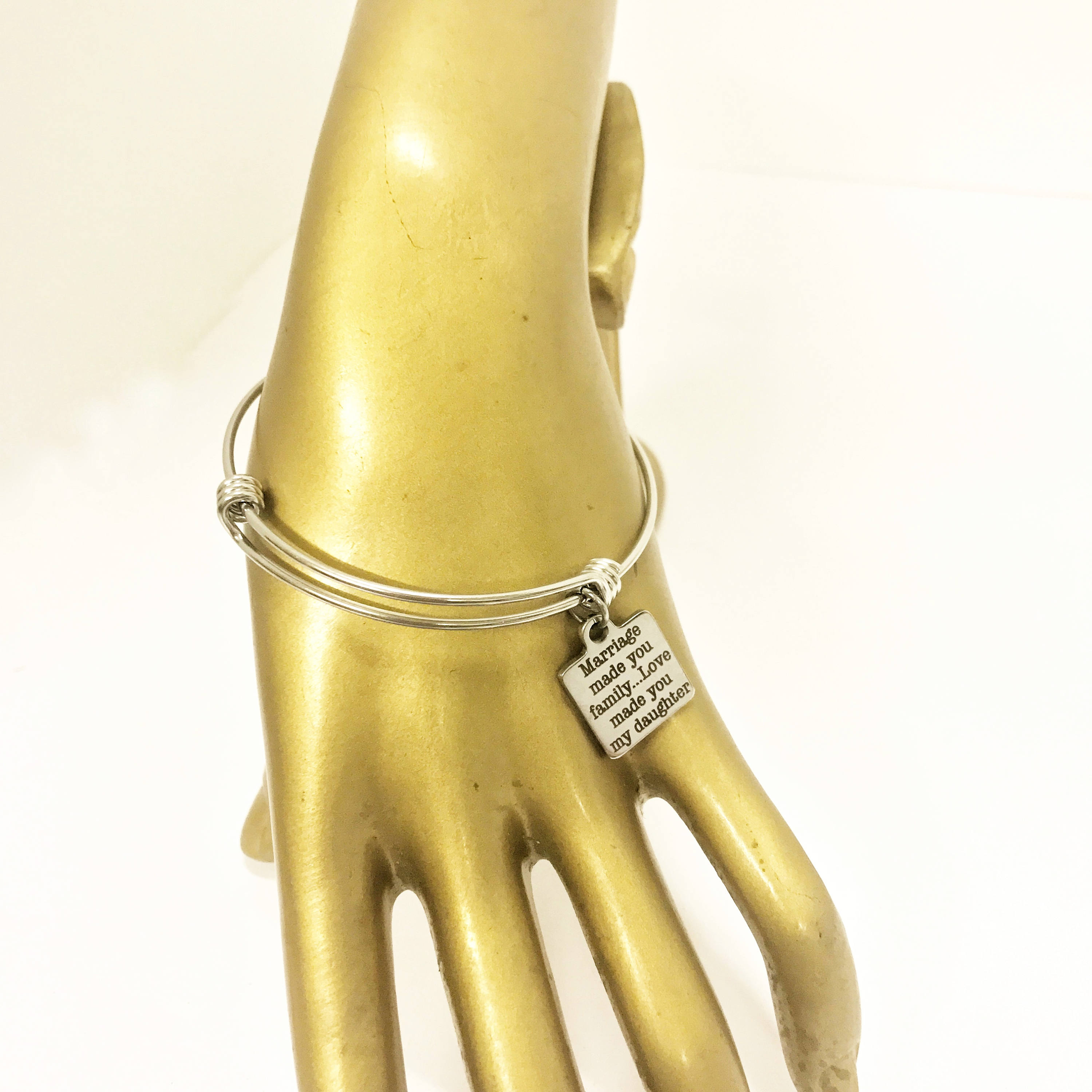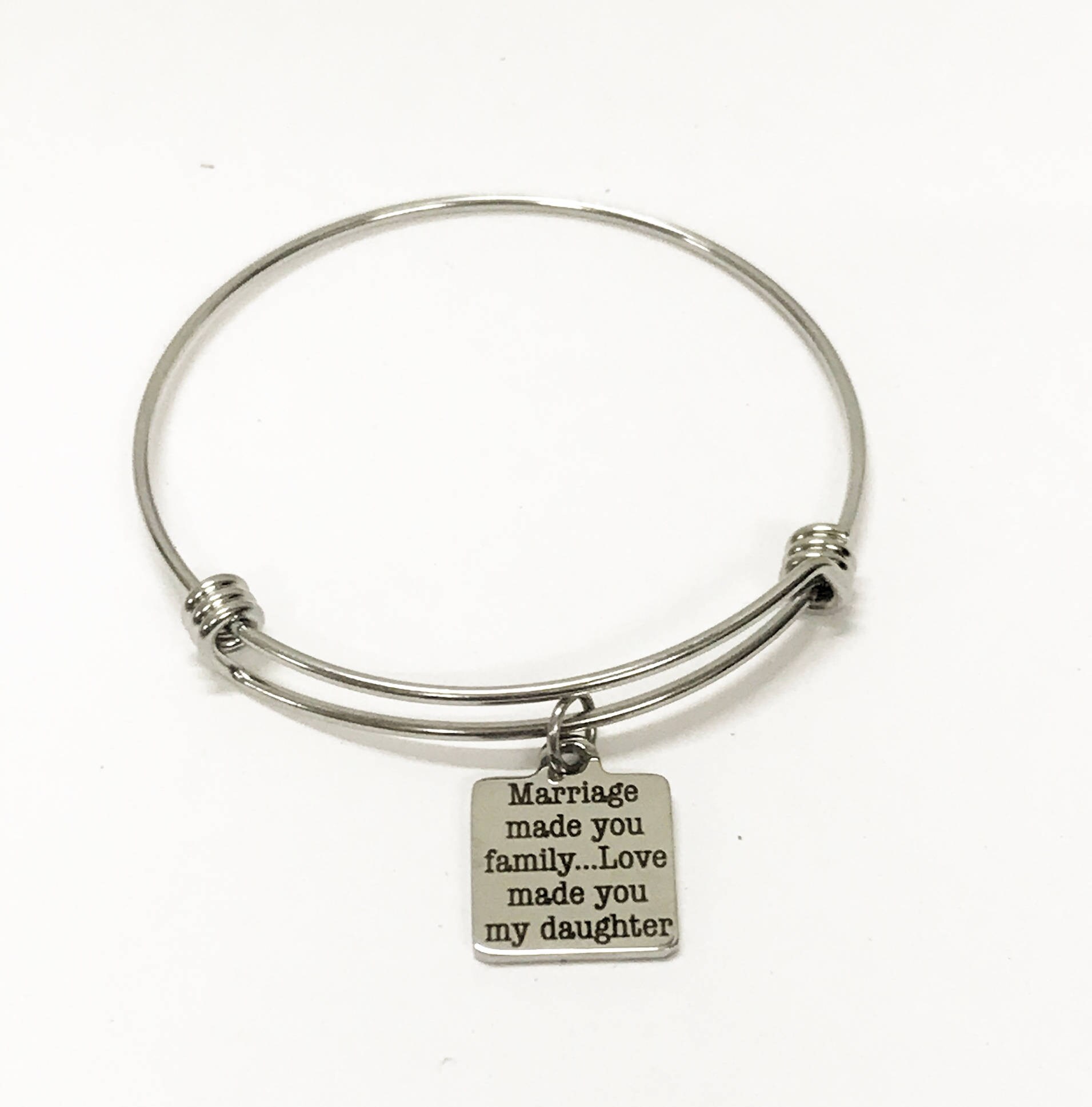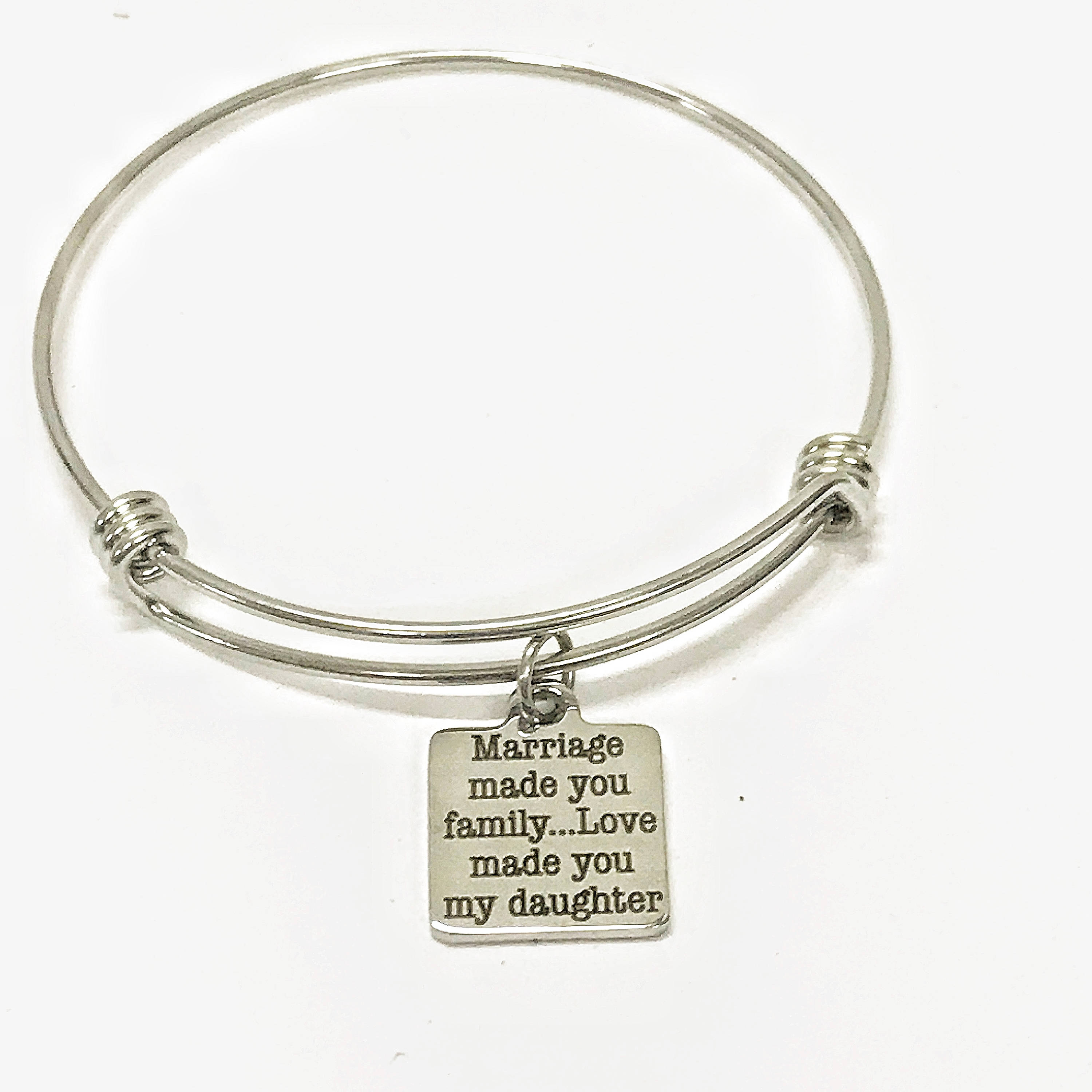 This is a beautiful stainless steel laser engraved charm that has "Marriage made you family...love made you my daughter". This is a great way to express your love for your daughter in law.