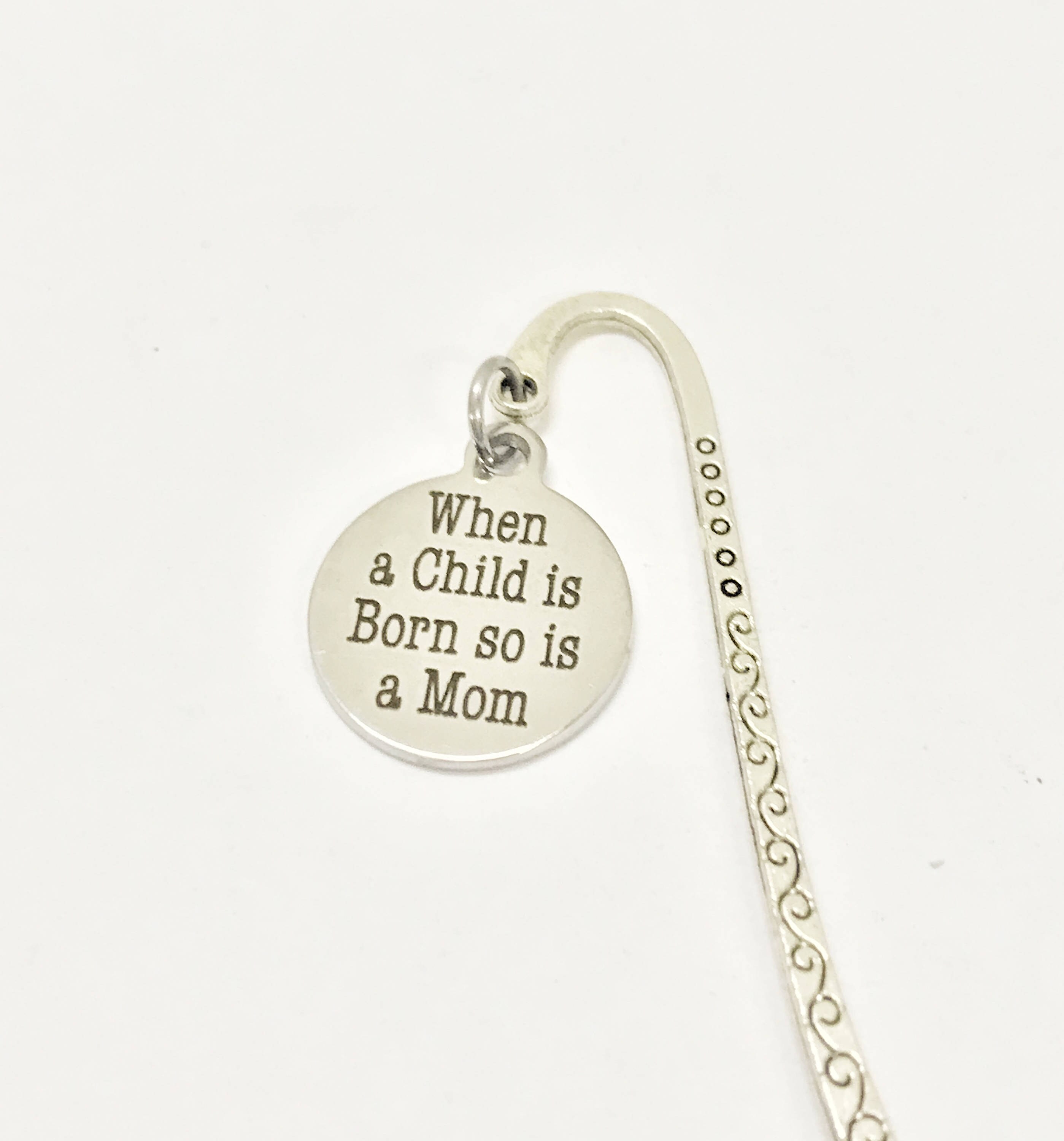 This is a great gift for a new mom! It is a stainless steel laser engraved charm with "When a child is born so is a mom" on it. The bookmark measures approx. 3.3 Inches in length.