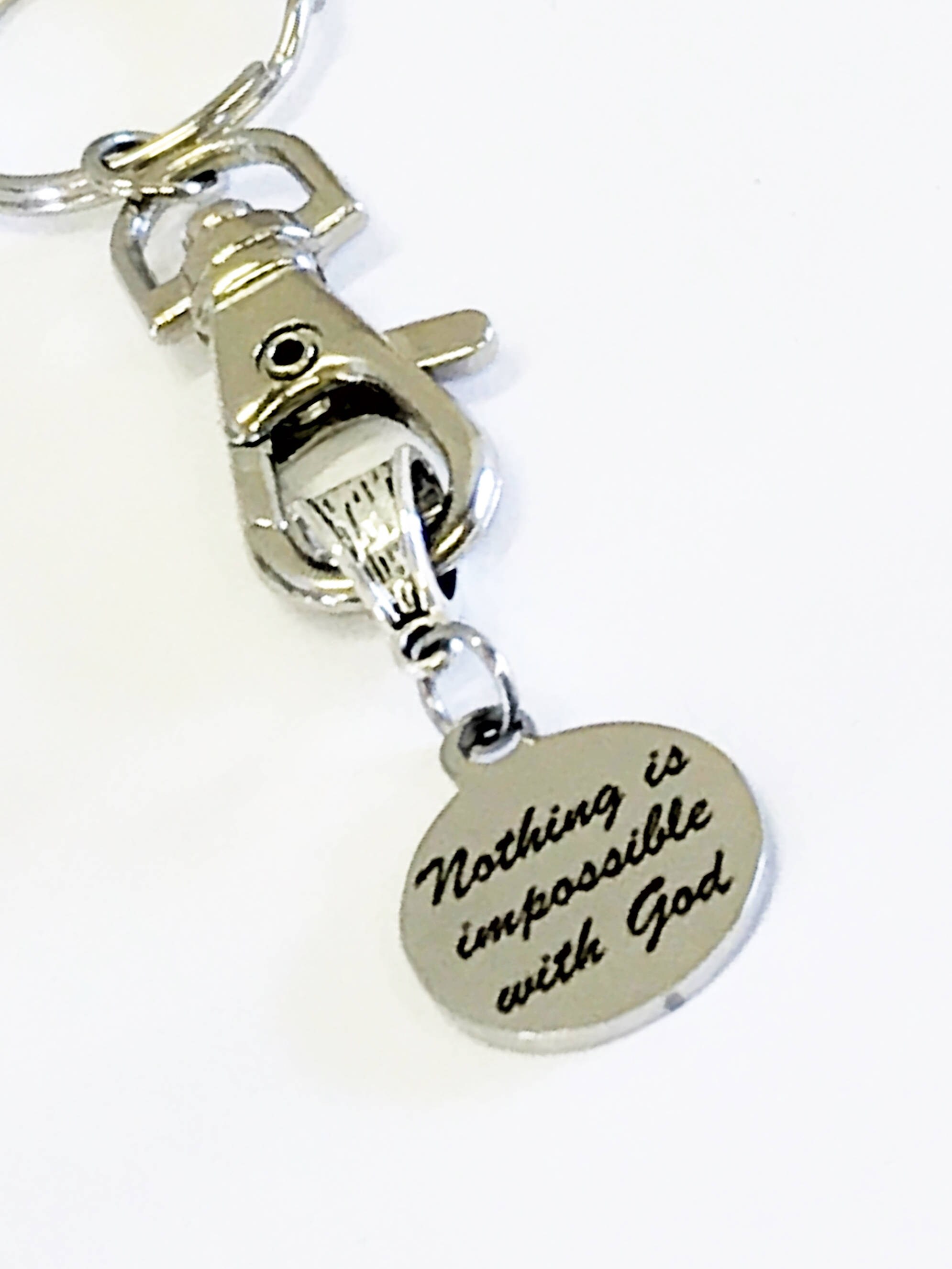 This is a beautiful Christian encouragement keychain with a stainless steel laser engraved charm that has "Nothing is impossible with God" on it.