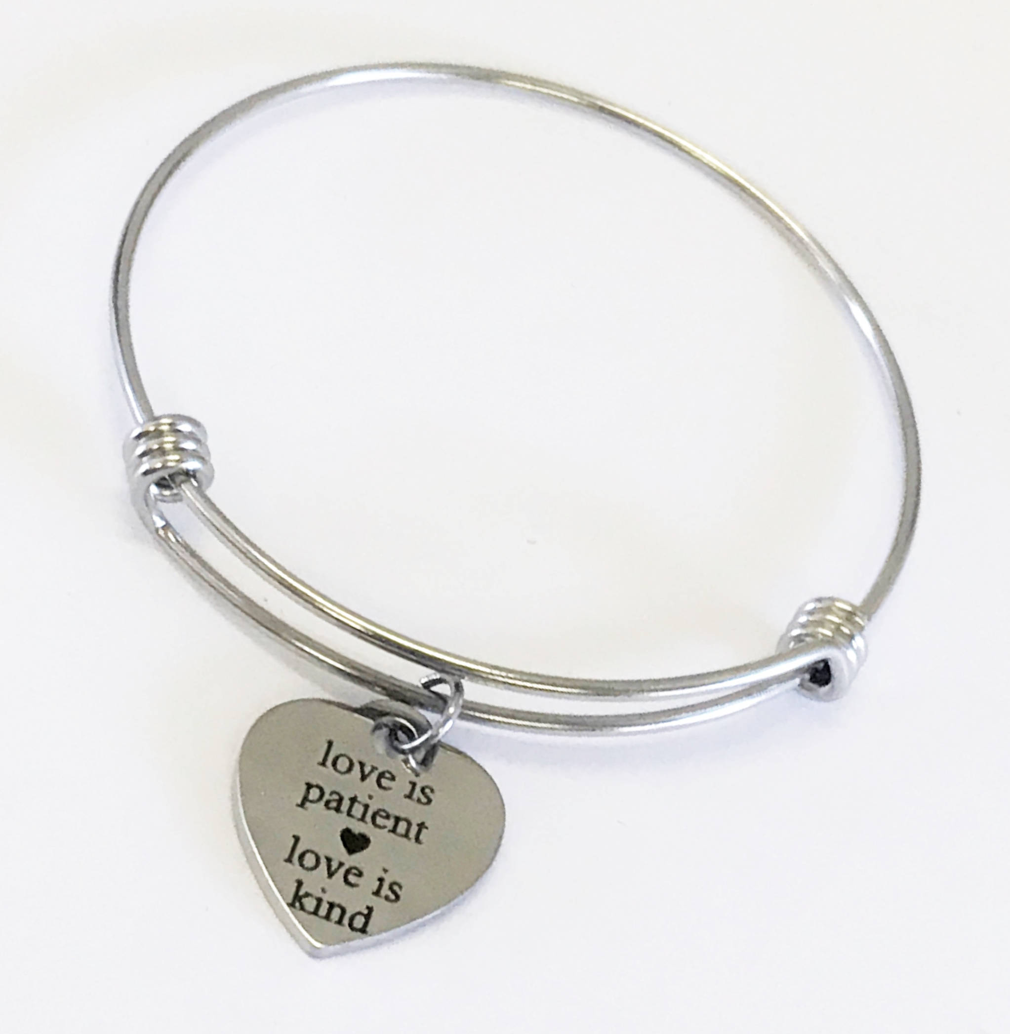 This bracelet is a beautiful jewelry piece that has the reminder of First Corinthians 13 that Love is Patient and Love is Kind.