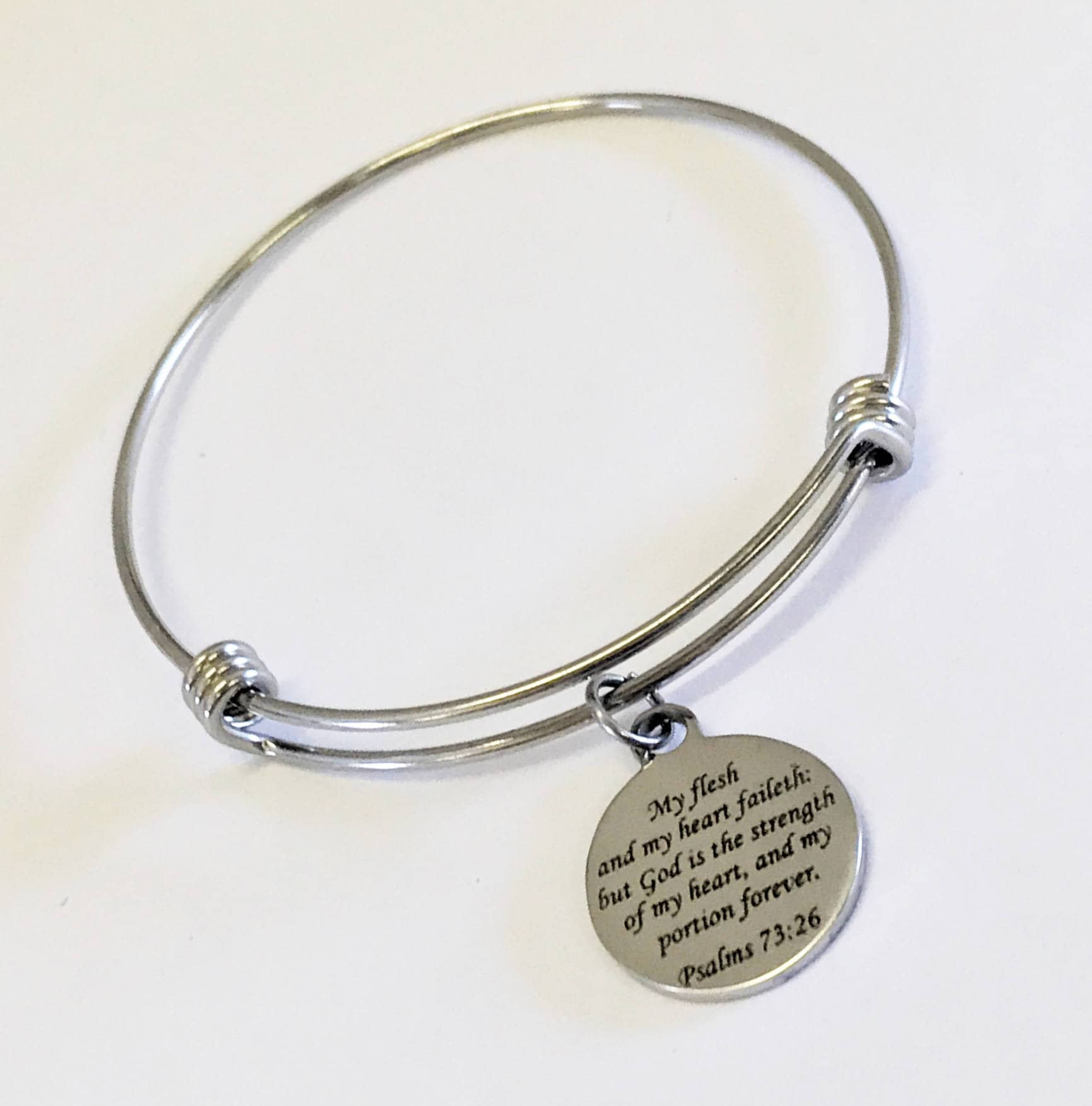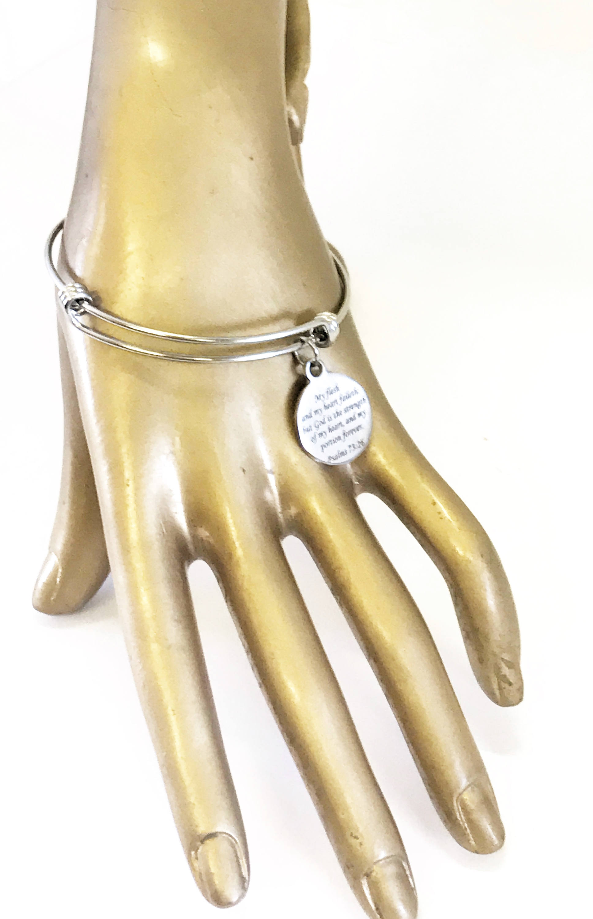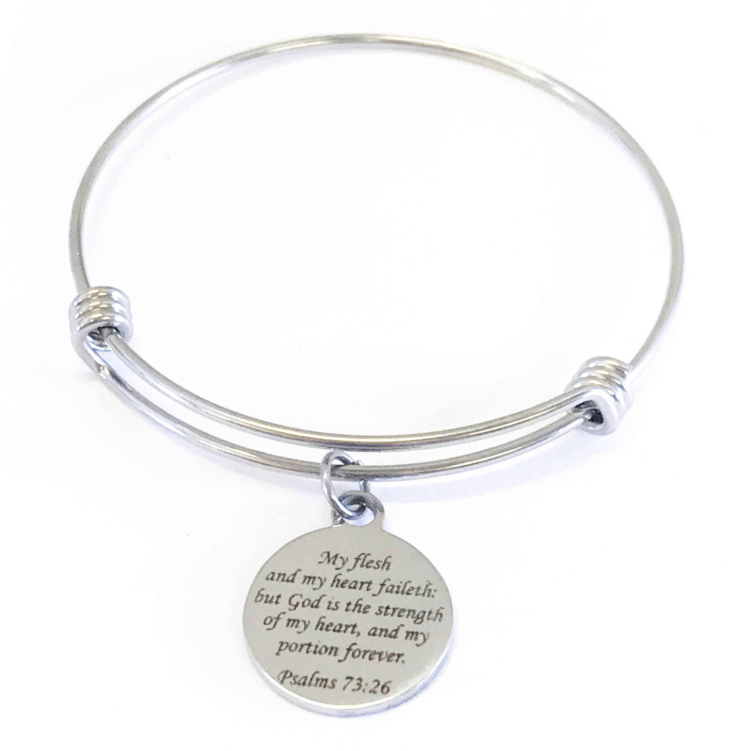 This bracelet is a beautiful jewelry piece that has the bible verse of Psalms 73:26 reminding us that when we fail, God is our strength.