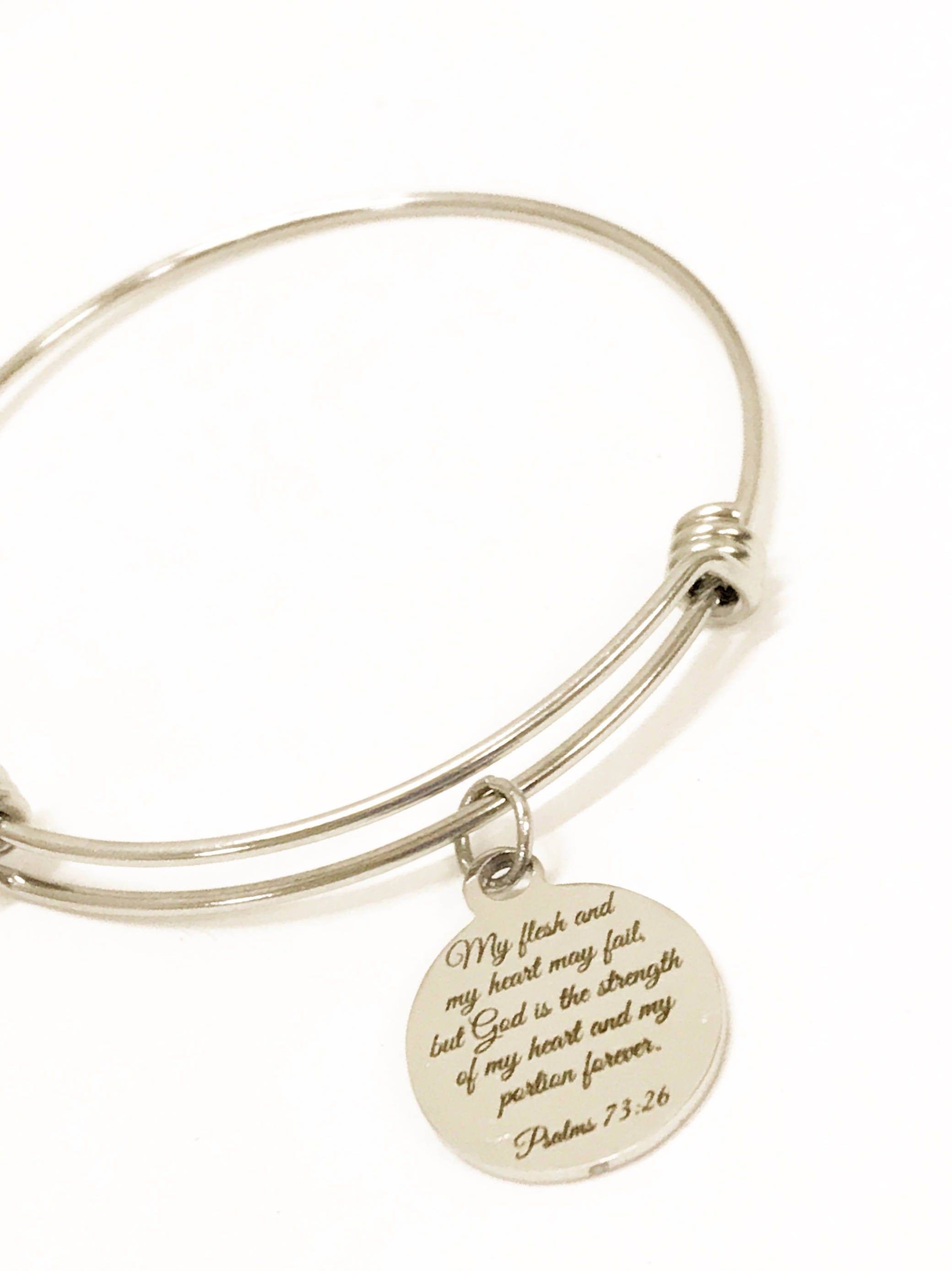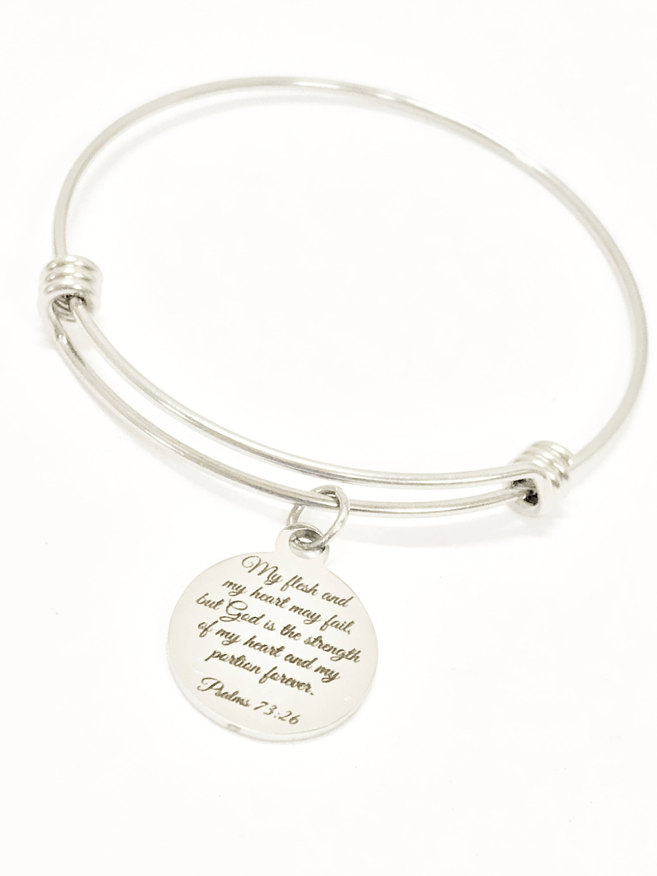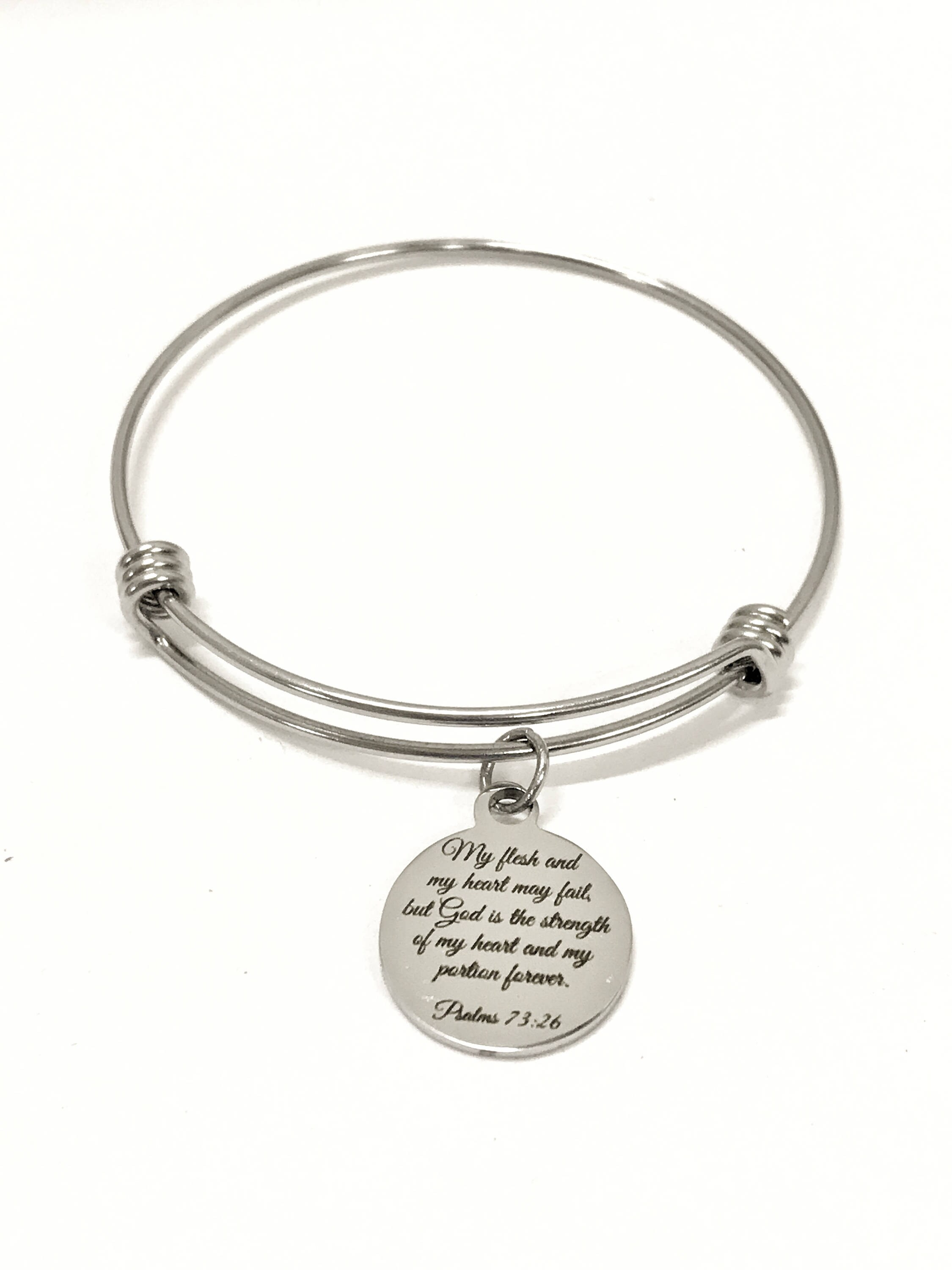This is a great bracelet with a stainless steel laser engraved charm on it. The charm has the Bible verse of Psalm 73:26 on it: