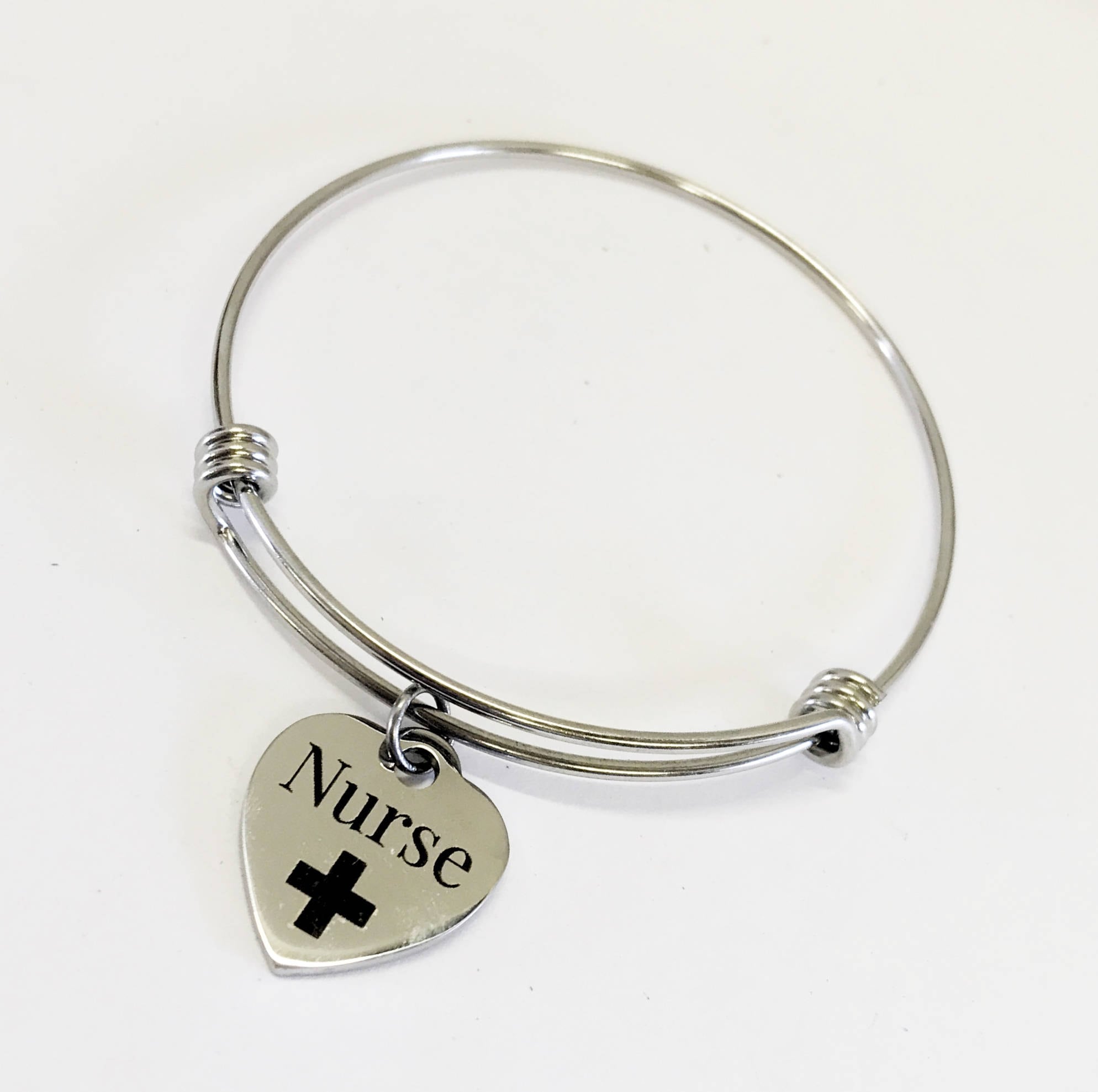 This is a beautiful stainless steel bracelet with a laser engraved heart charm to recognize a Nurse.