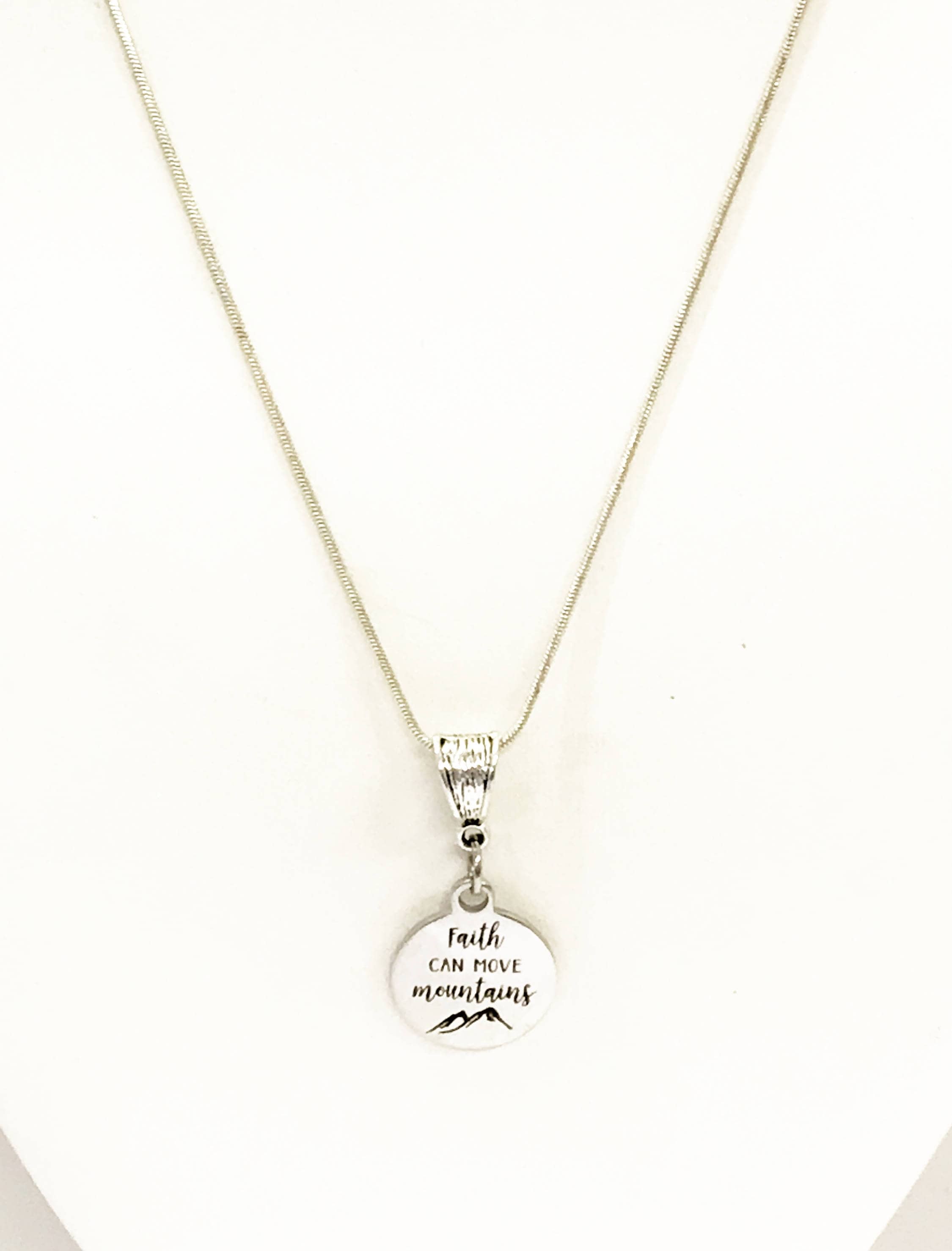 This beautiful necklace has a stainless steel laser engraved "Faith can move mountains" charm. It would be a great way to encourage someone in your life.