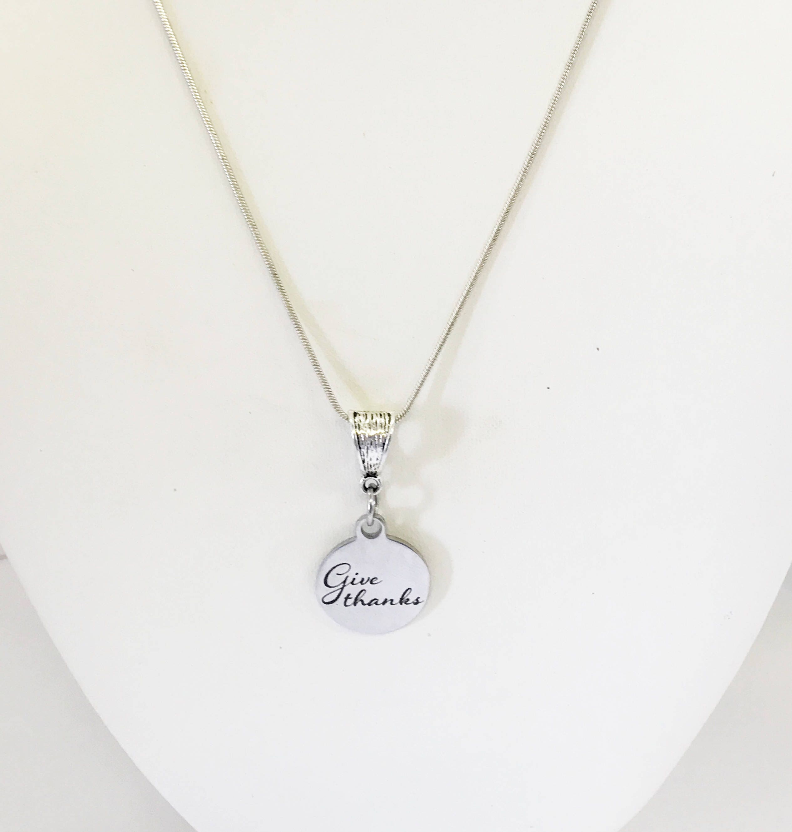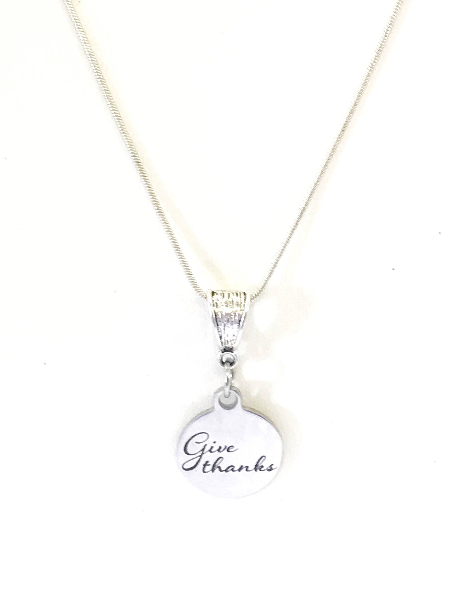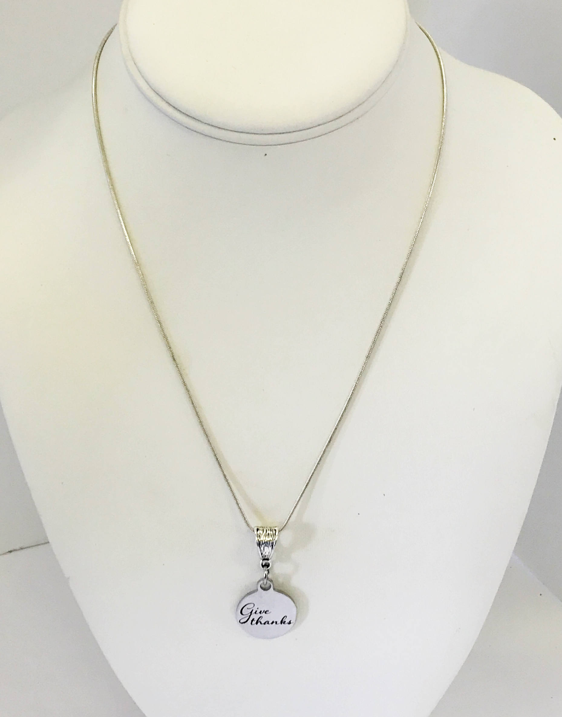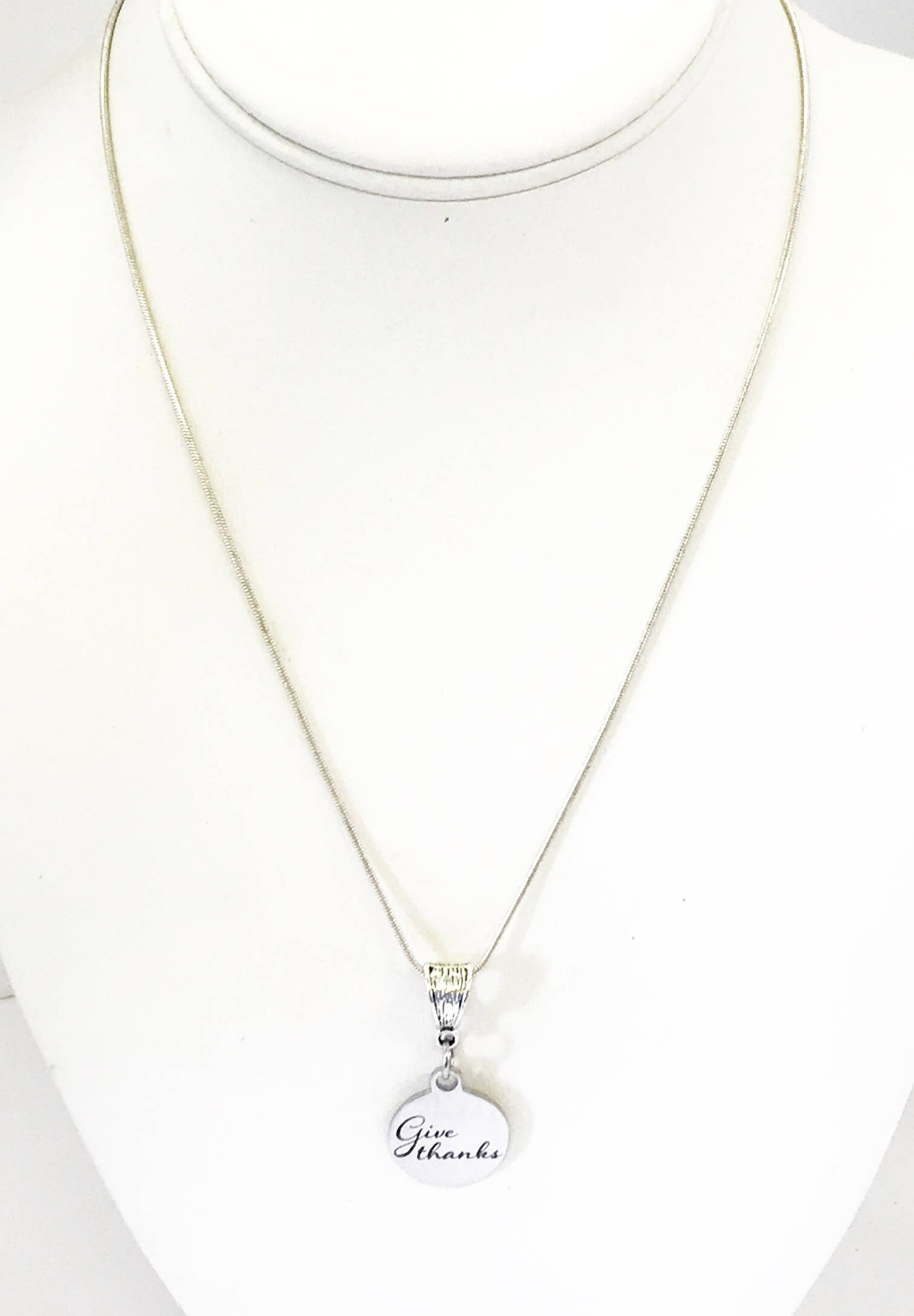 This is a stainless steel laser engraved pendant on a sterling silver plated chain. The pendant has "Give Thanks" on it. This pendant is available on your choice of 16, 18, 20, 22, 24, 26, 28 or 30 inch sterling silver plated snake chain. The pendant is also available for individual purchase if you have another chain on which you would like to wear it.