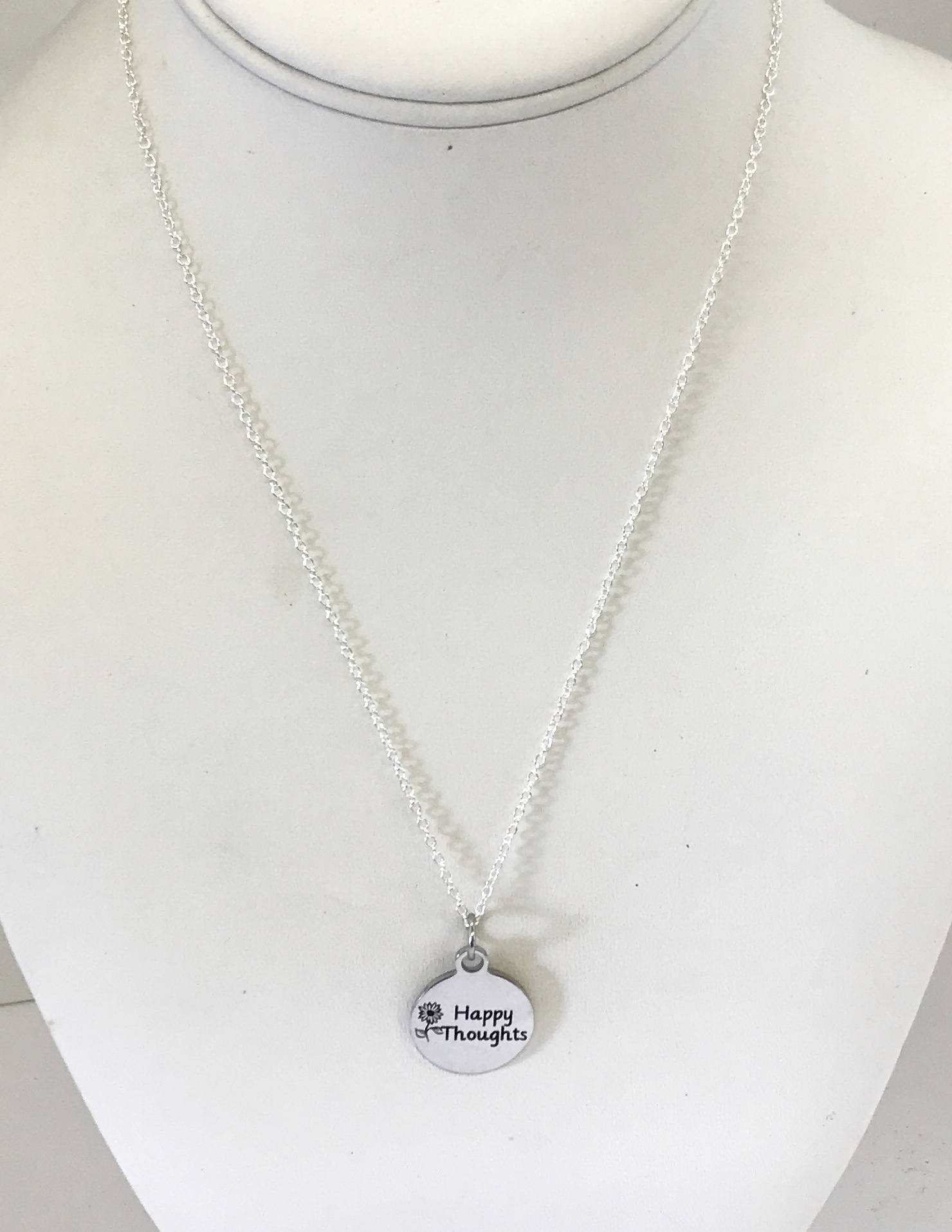 This is a stainless steel laser engraved pendant on a sterling silver plated chain. The pendant has "Happy Thoughts" on it. This pendant is available on your choice of 16, 18, 20, 22, 24, 26, 28 or 30 inch sterling silver plated snake chain. The pendant is also available for individual purchase if you have another chain on which you would like to wear it.