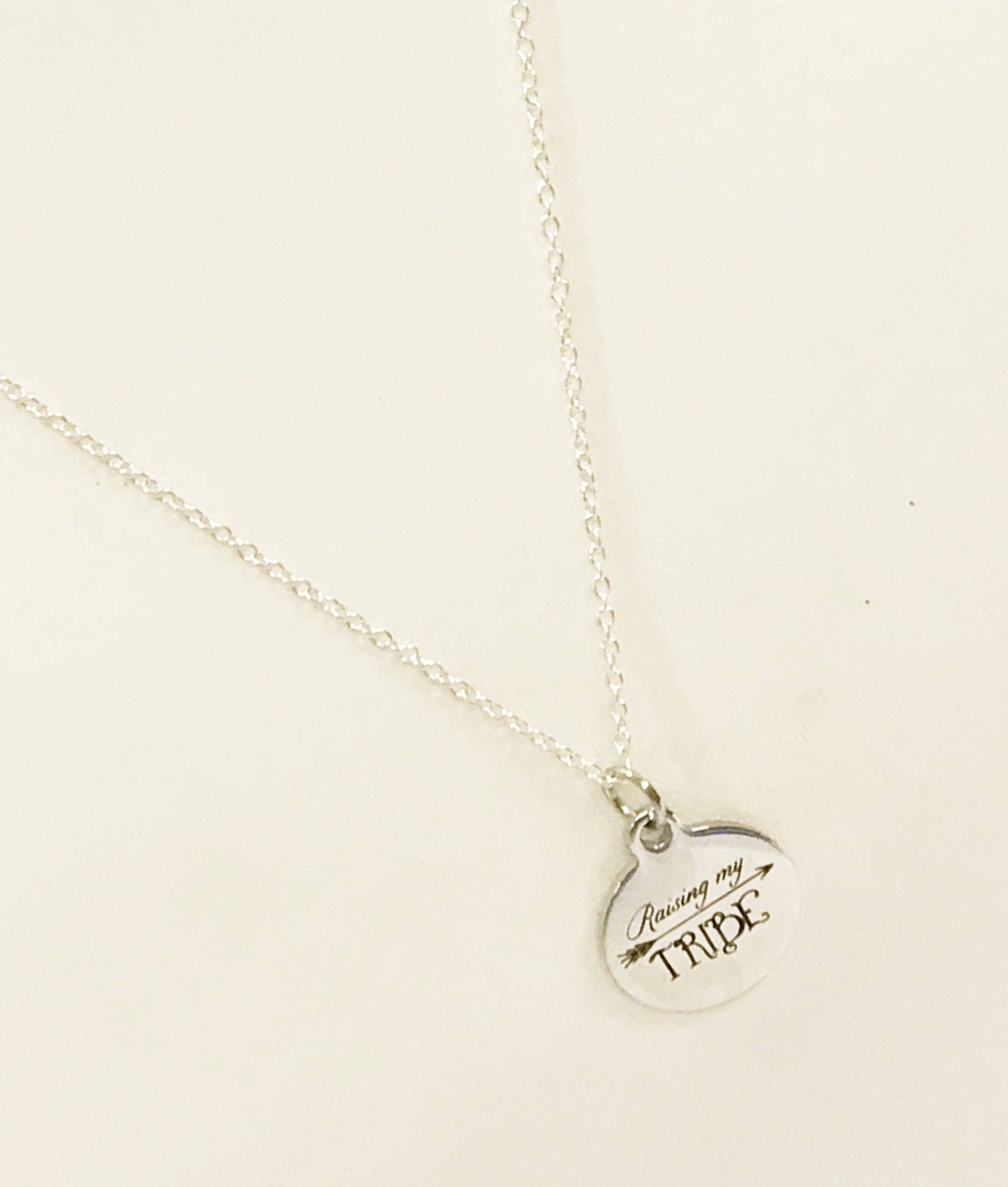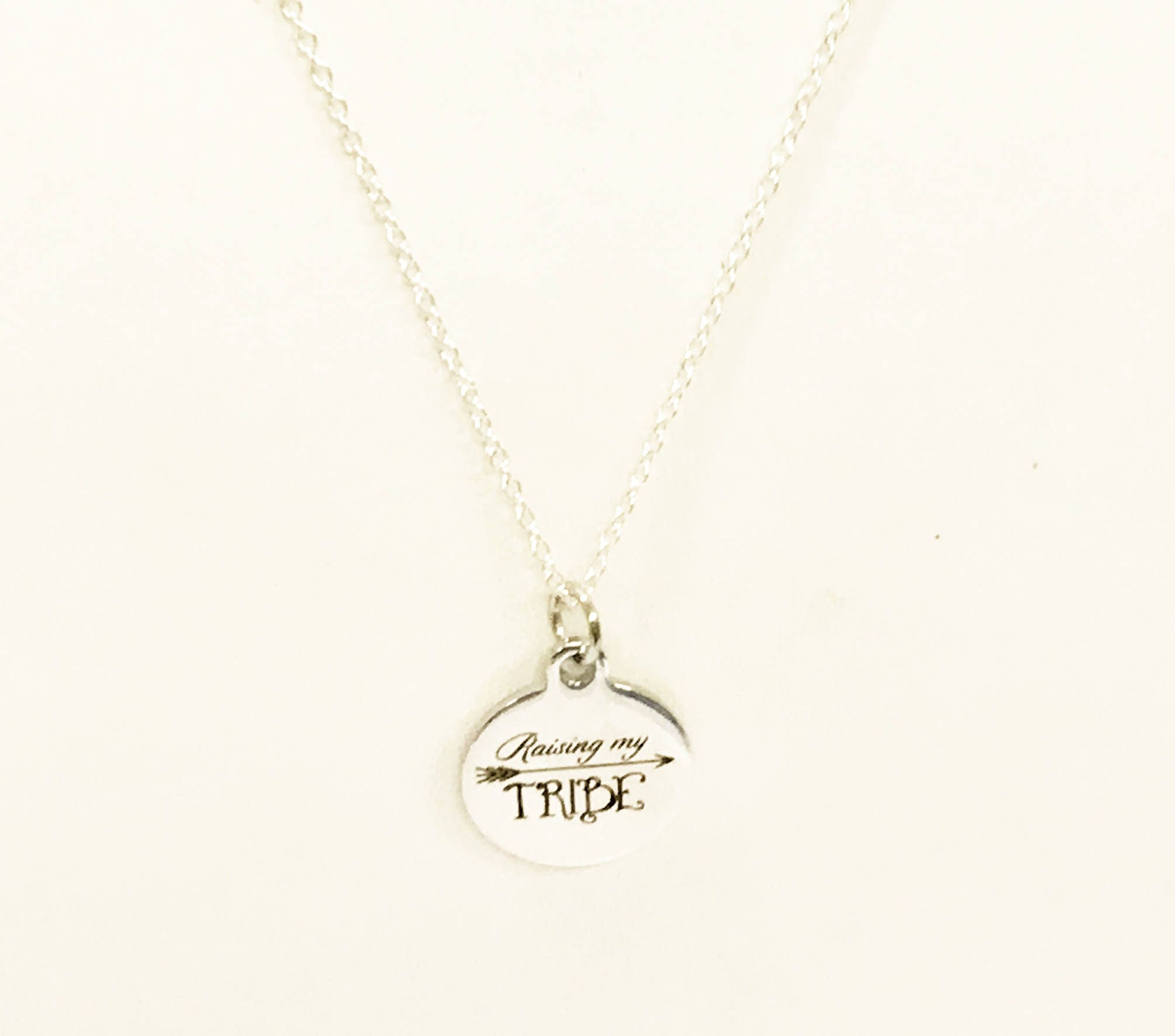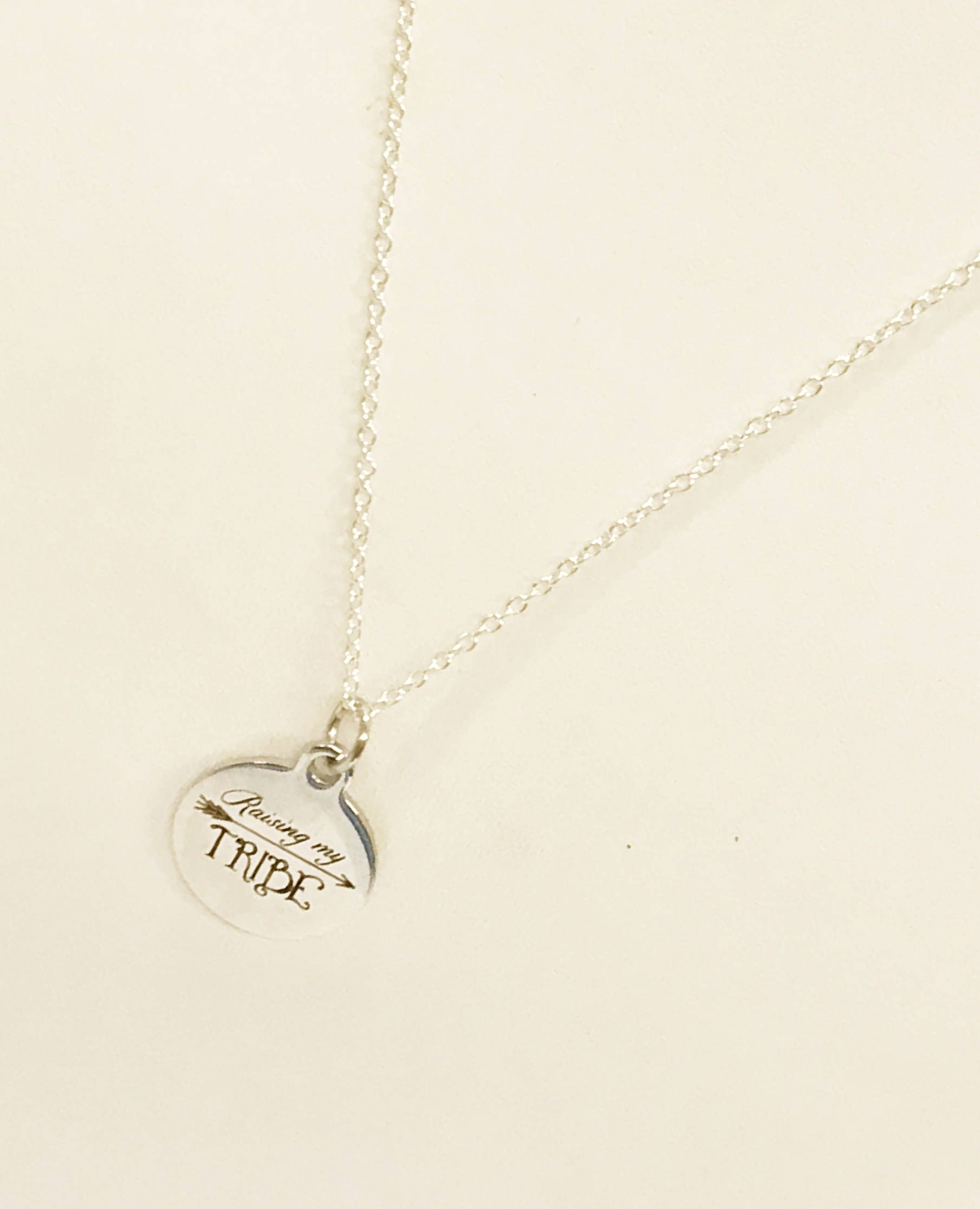 This silver necklace is a simple but beautiful gift. The stainless steel laser engraved pendant has "Raising my tribe" on it.