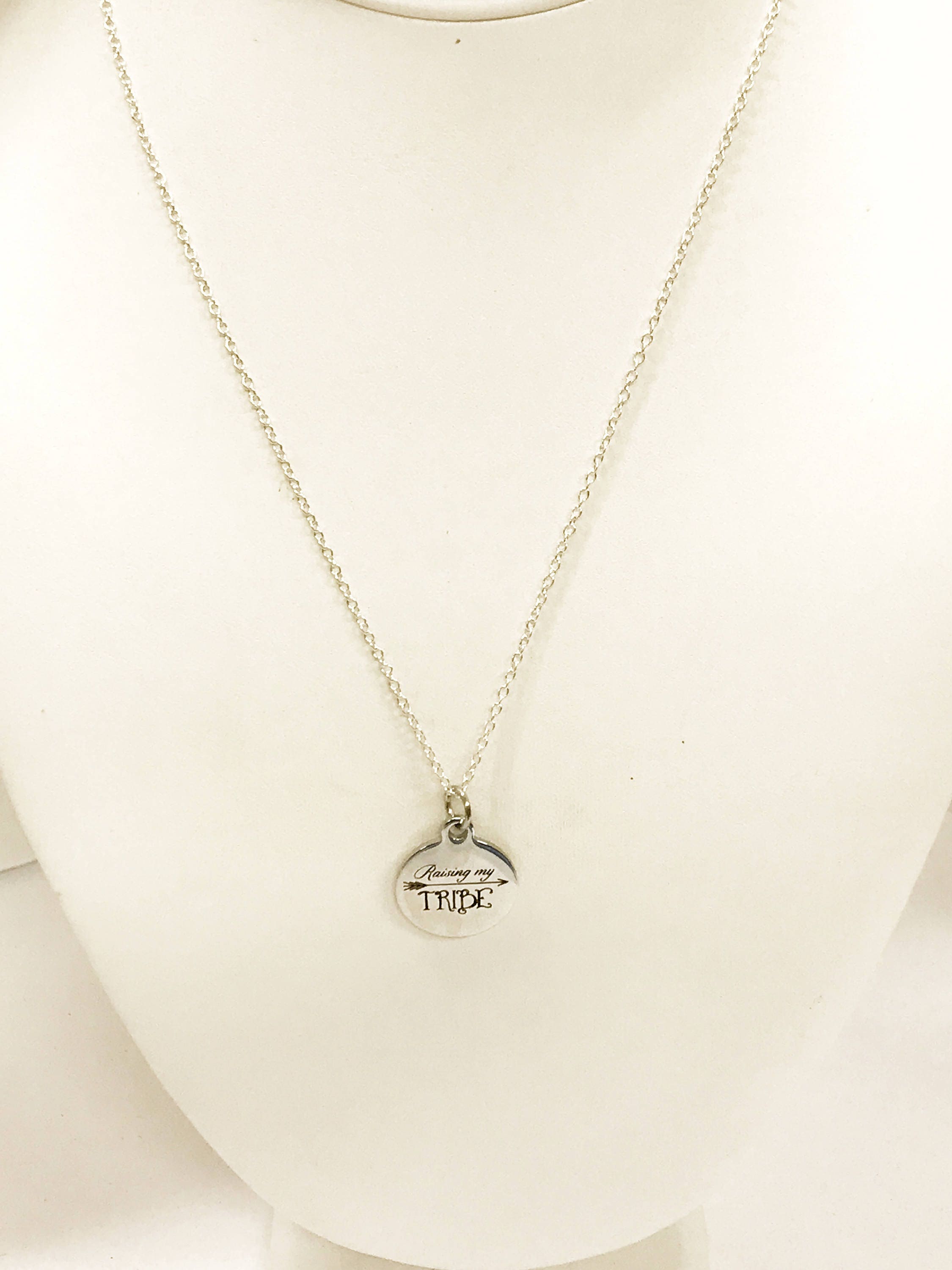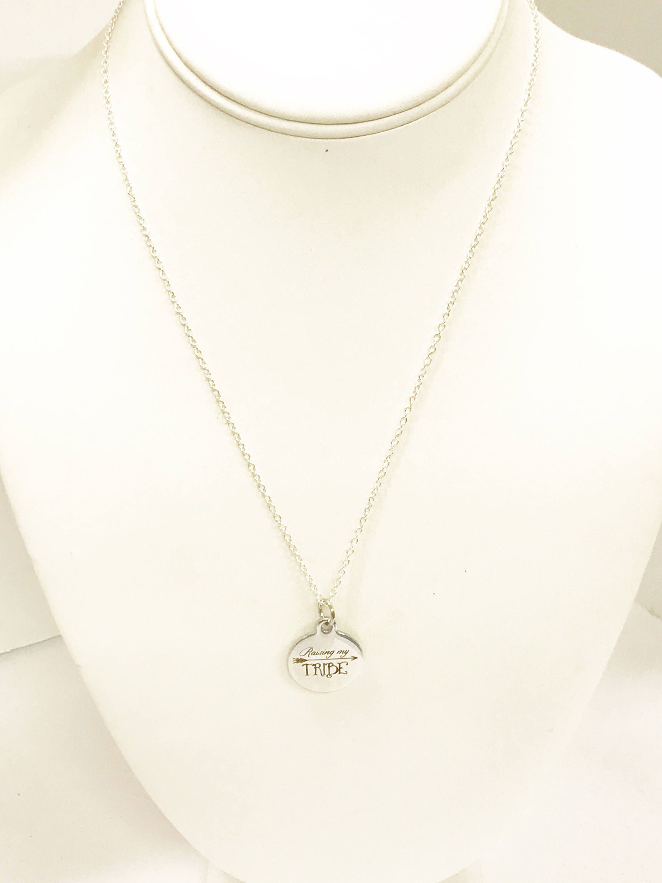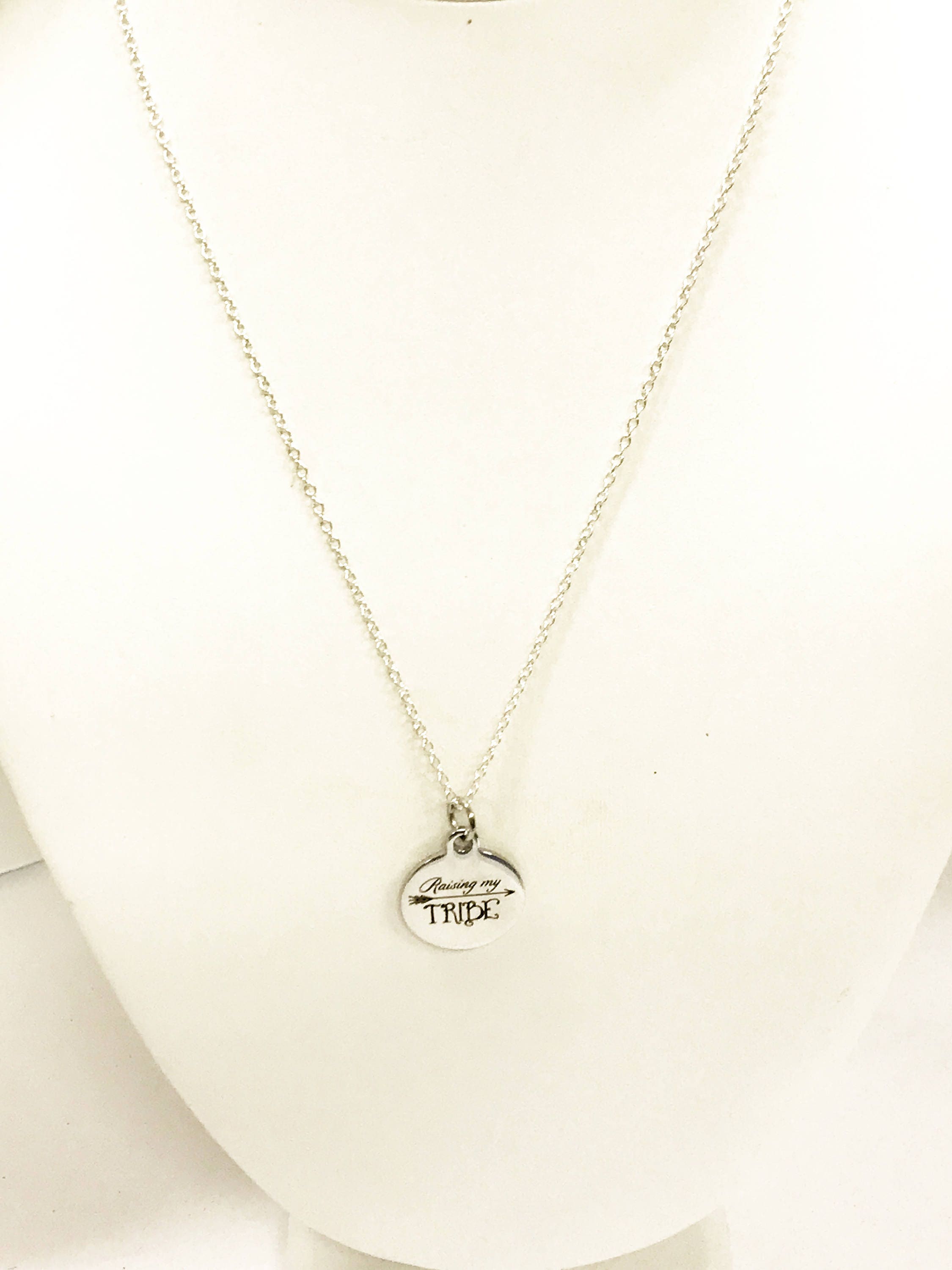 This silver necklace is a simple but beautiful gift. The stainless steel laser engraved pendant has "Raising my tribe" on it.