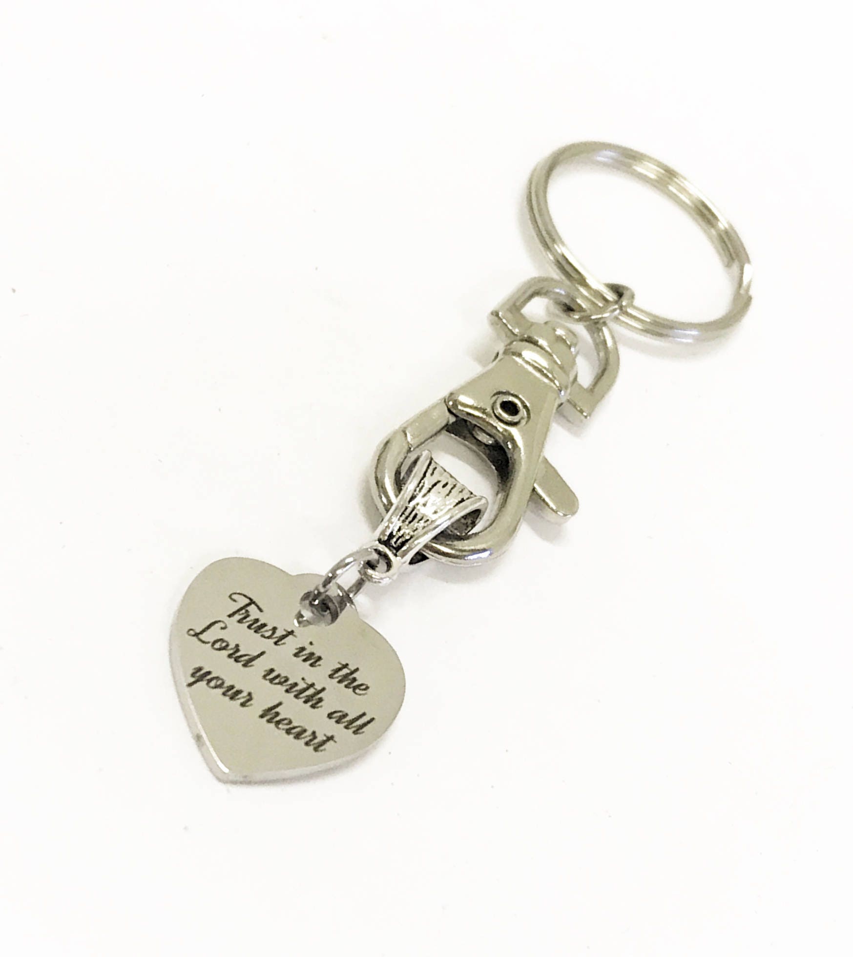 This is a great keychain that has a stainless steel laser engraved heart charm that says "Trust in the Lord with all your heart".