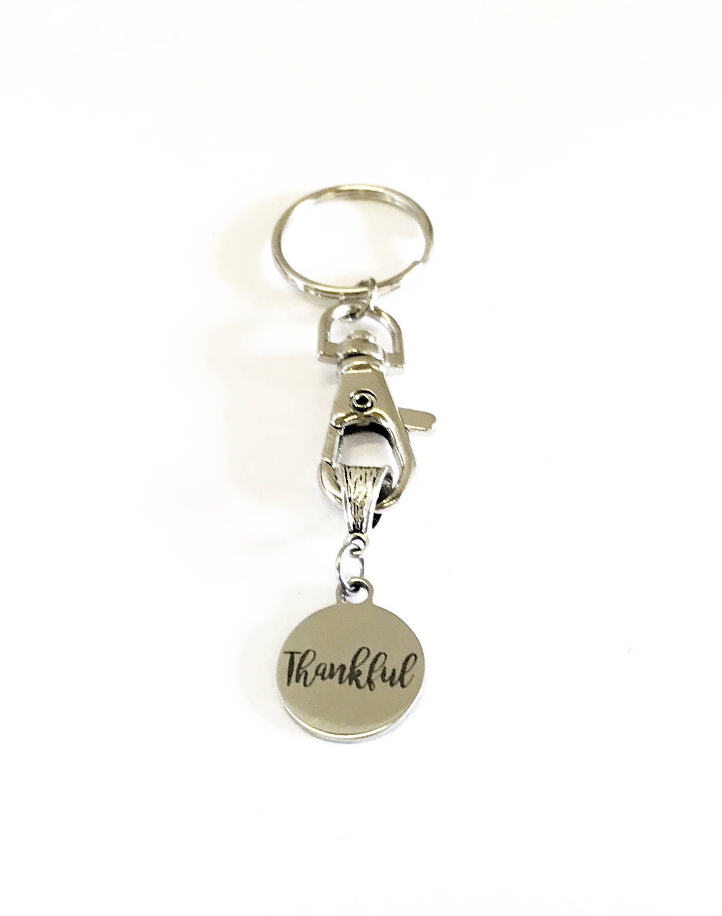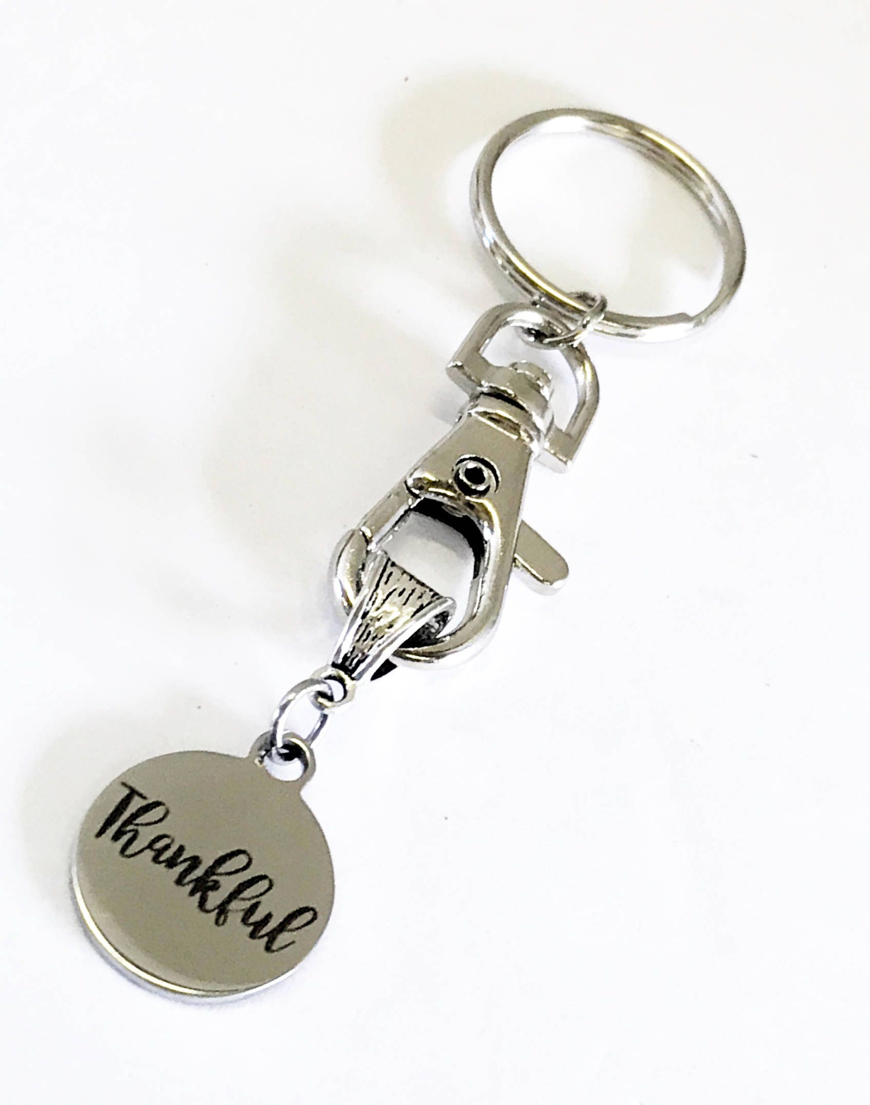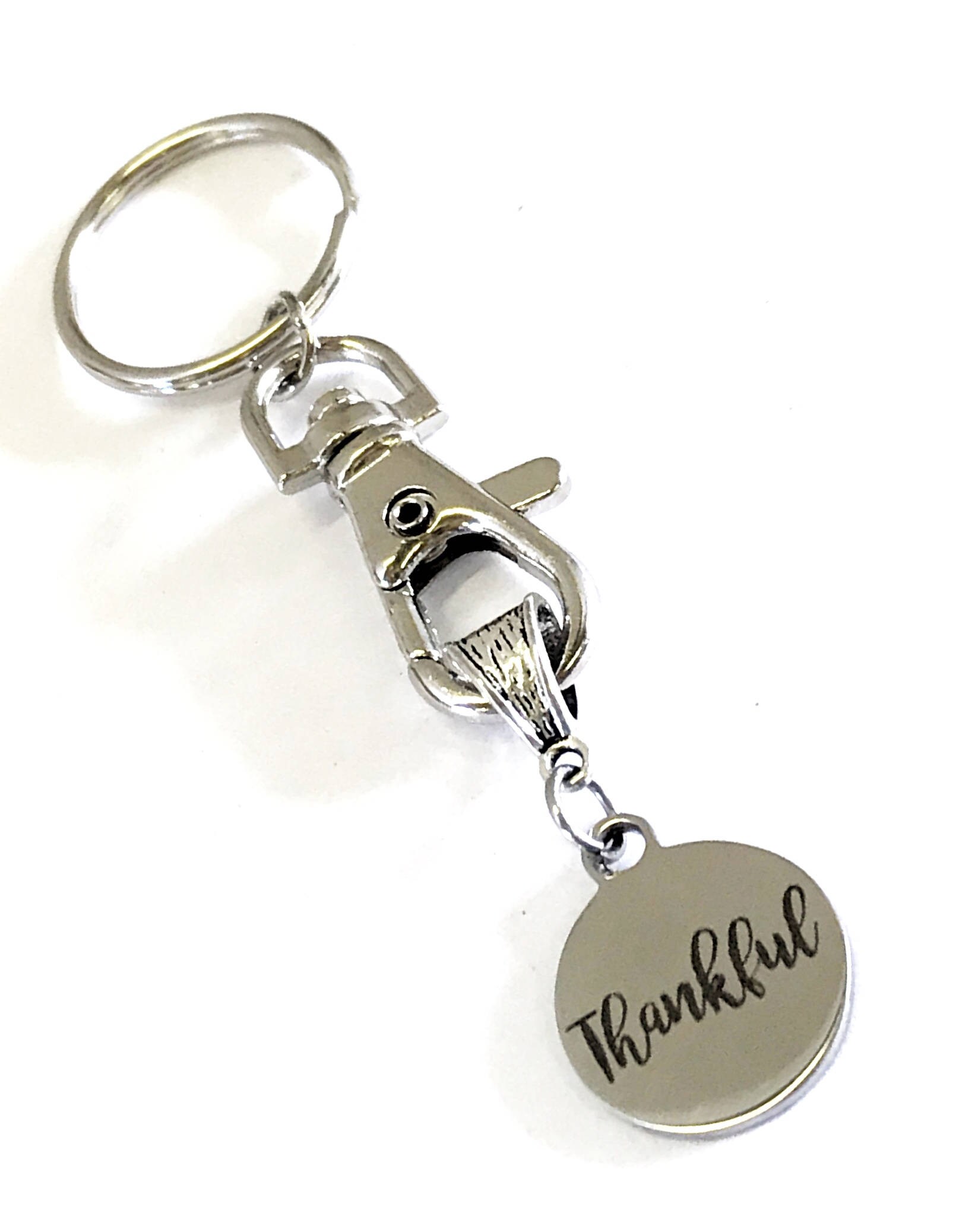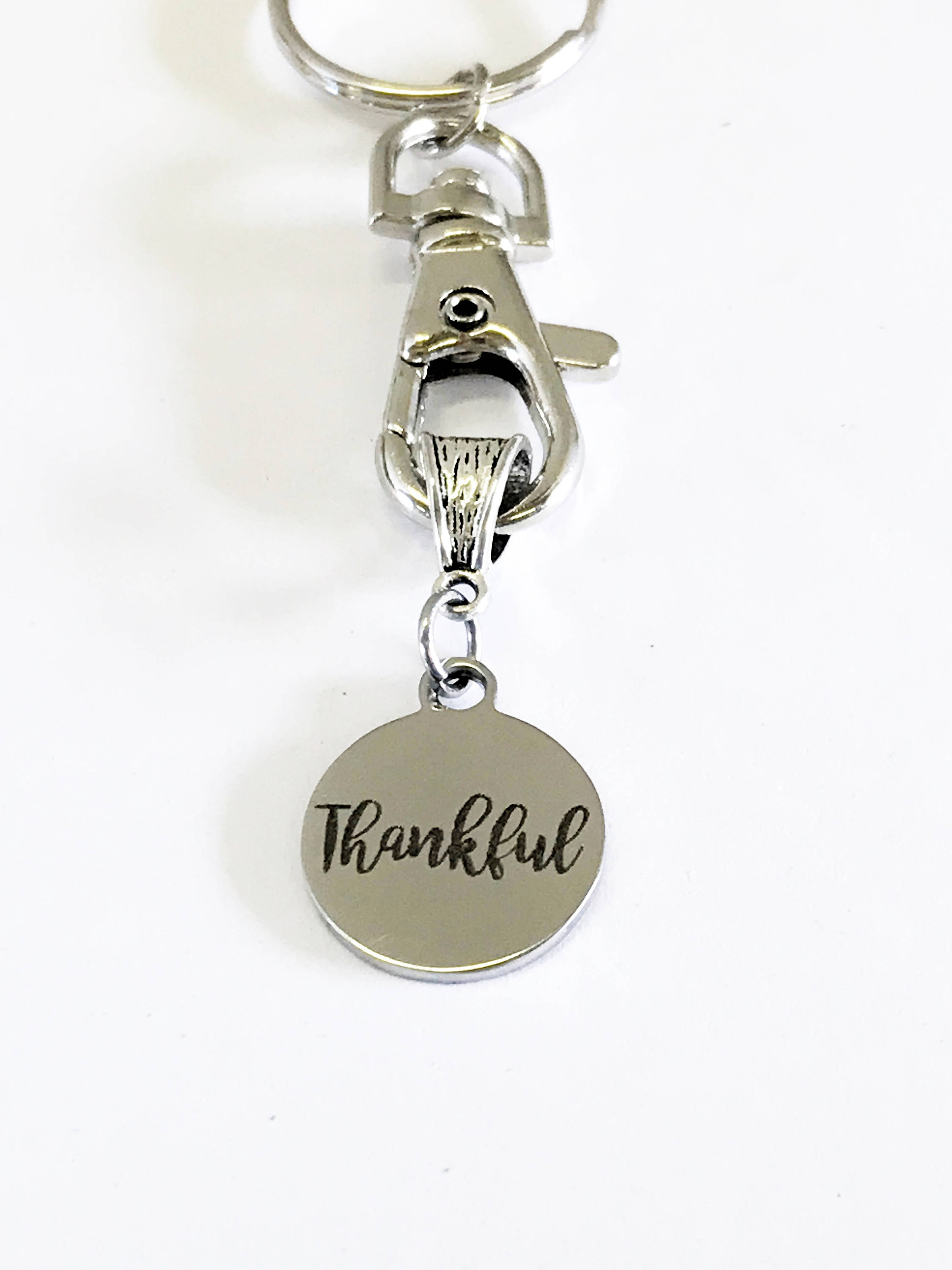This is a great "Thankful" keychain with a stainless steel laser engraved charm. It would be a great way to show someone that you are thankful they are in your life.