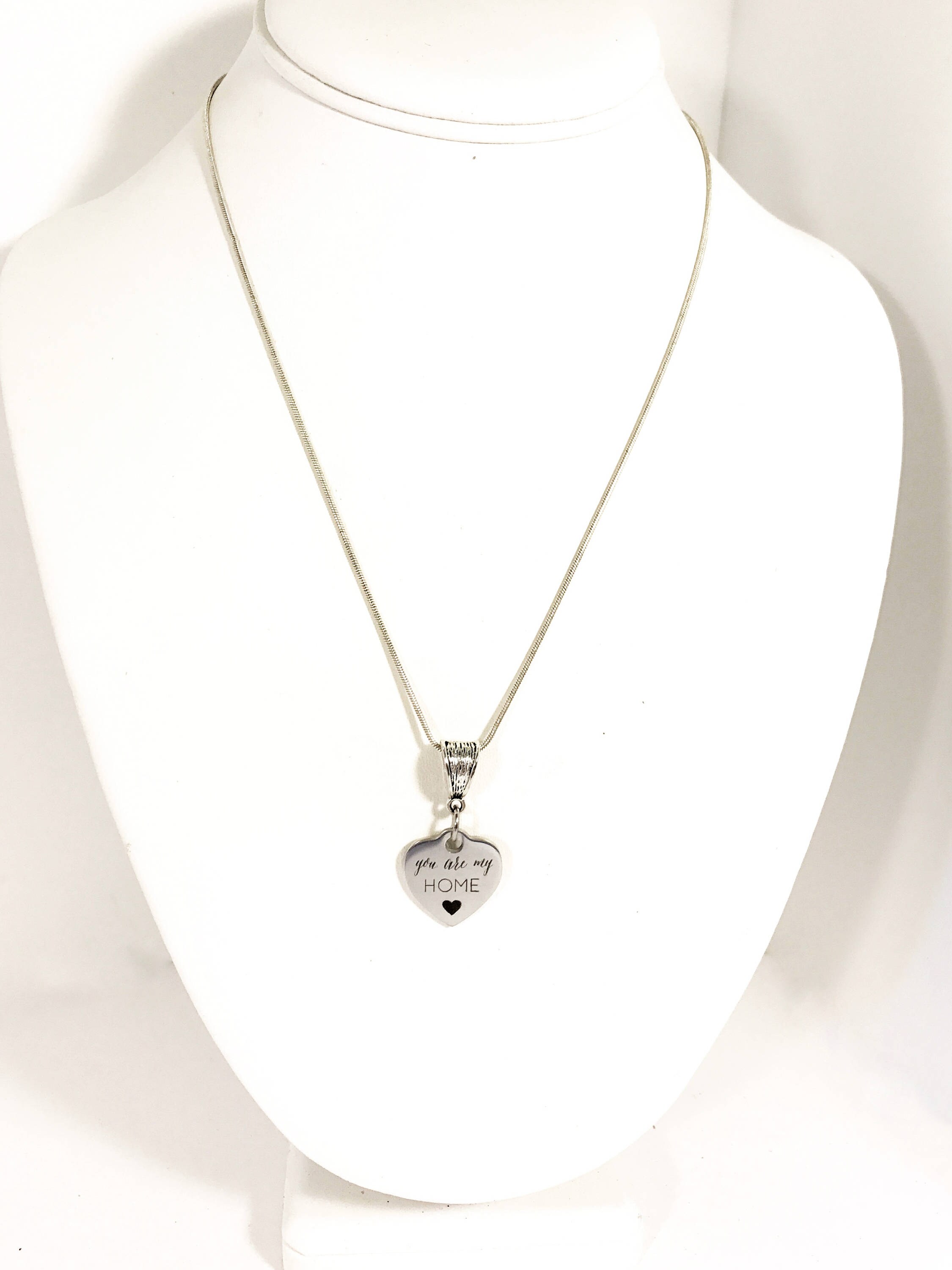 This silver necklace is a simple but beautiful gift for a loved one in your life. It is a stainless steel laser engraved charm that says "You are my home" on a silver plated snake chain.