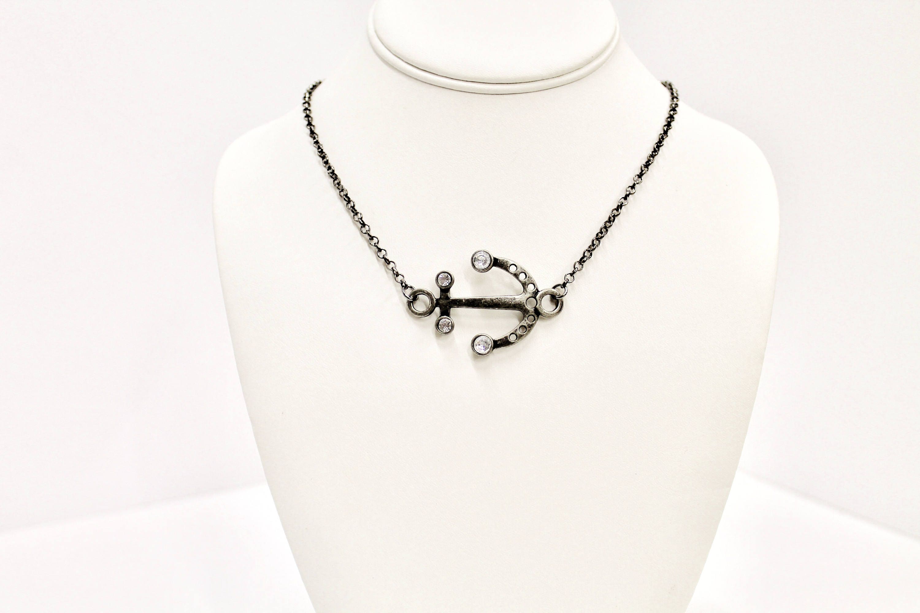 Beautiful gunmetal silver anchor connector pendant on your choice of a 16, 18, 20, 22, 24, or 26 inch chain. This necklace would be a great gift to yourself or someone who loves anchors or the beach!
