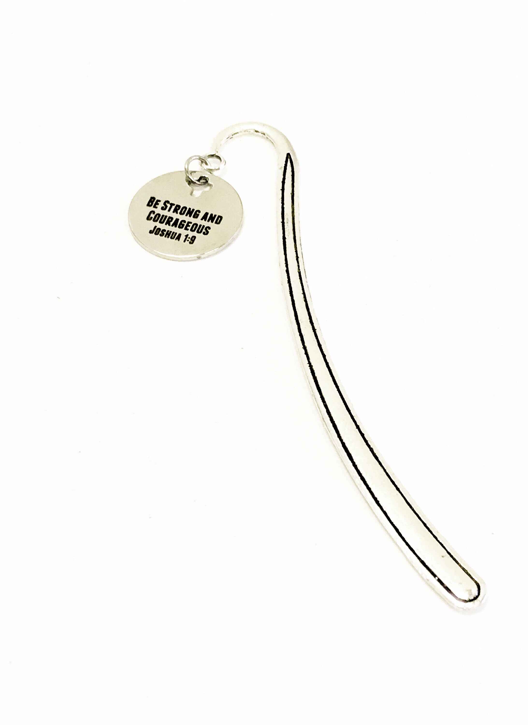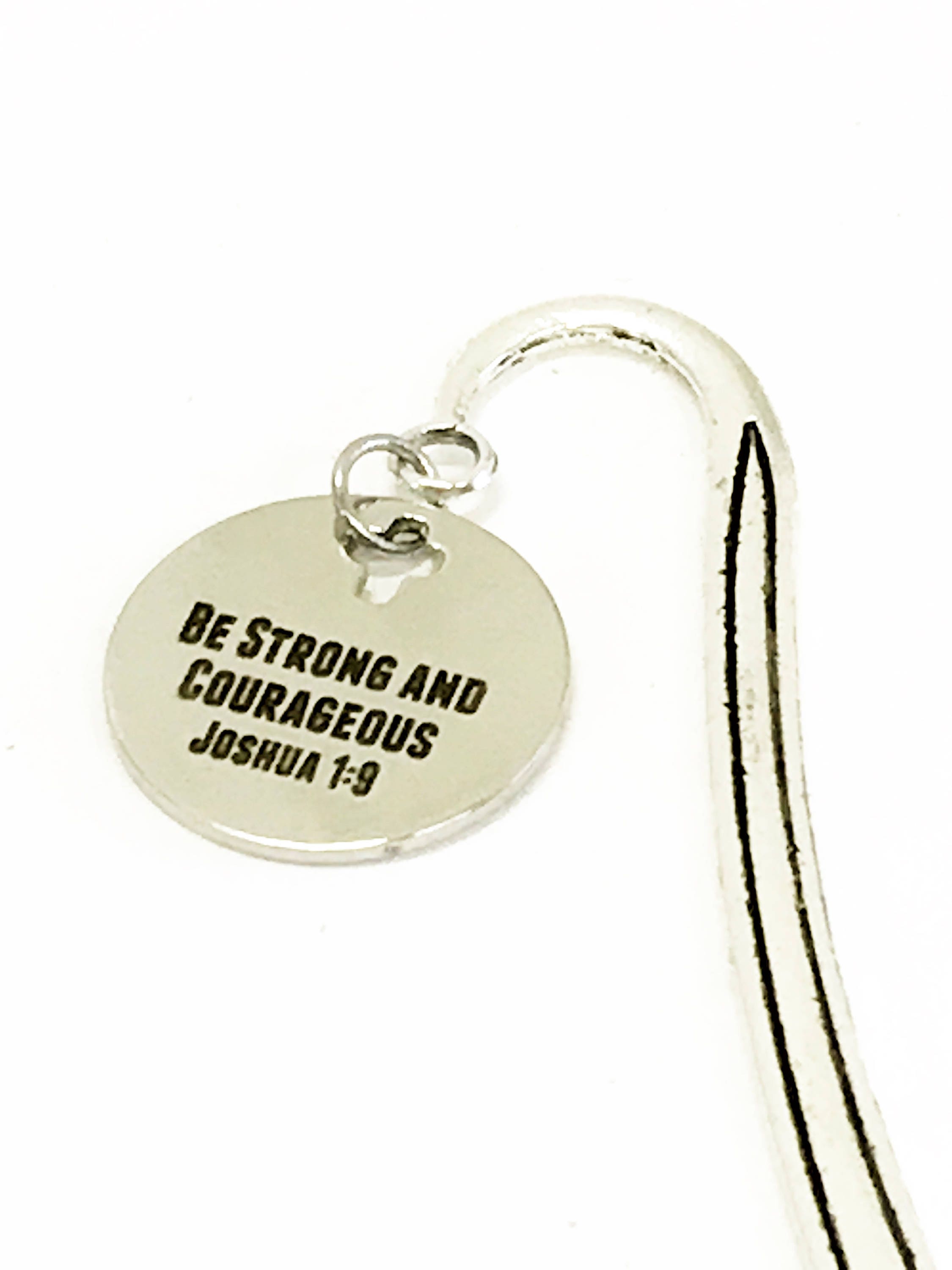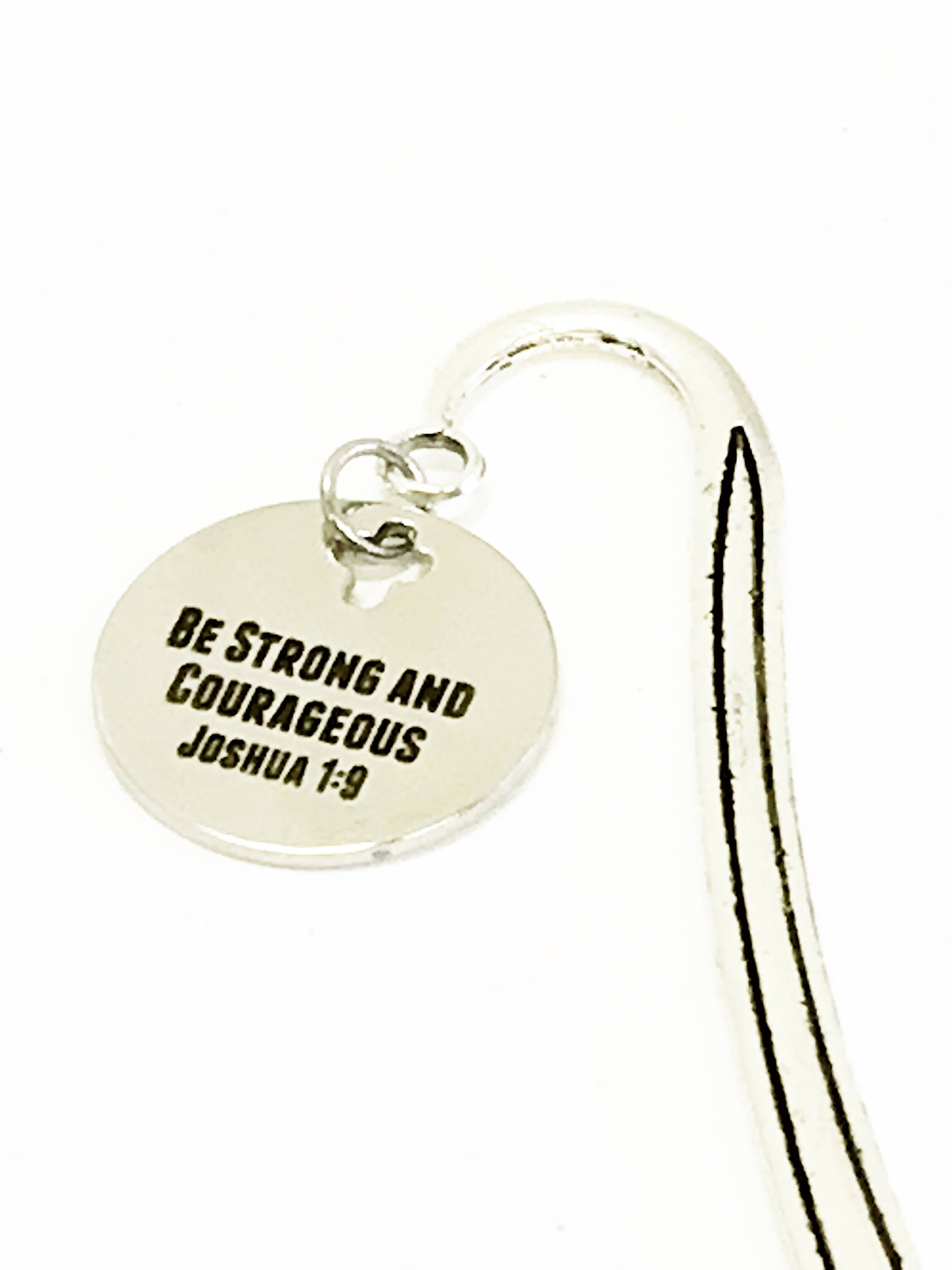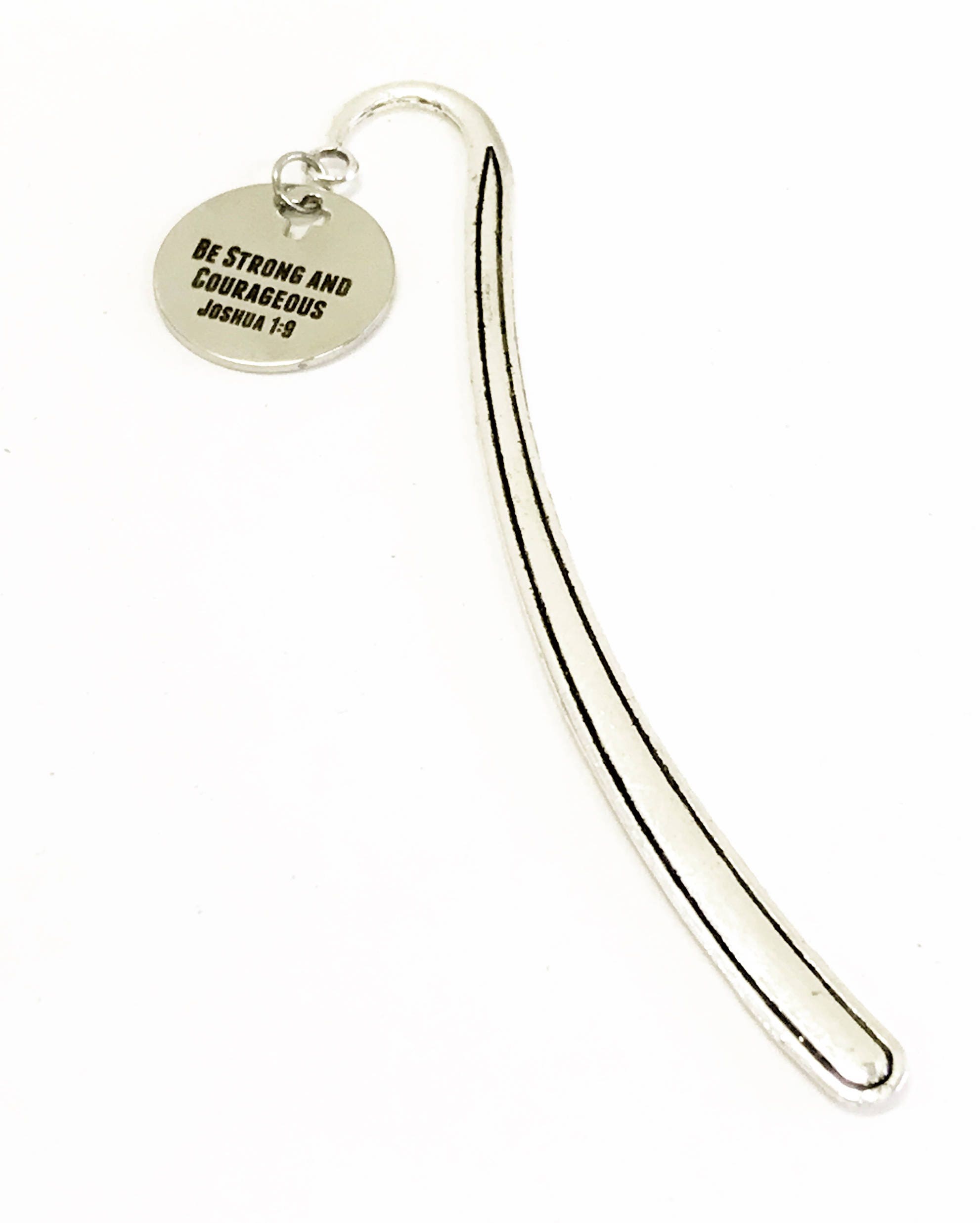 This is a great reader gift. It has a "Be strong and courageous" stainless steel laser engraved charm to represent the Bible verse of Joshua 1:9 on a metal bookmark. The bookmark measures approx. 4.9 Inches in length.
