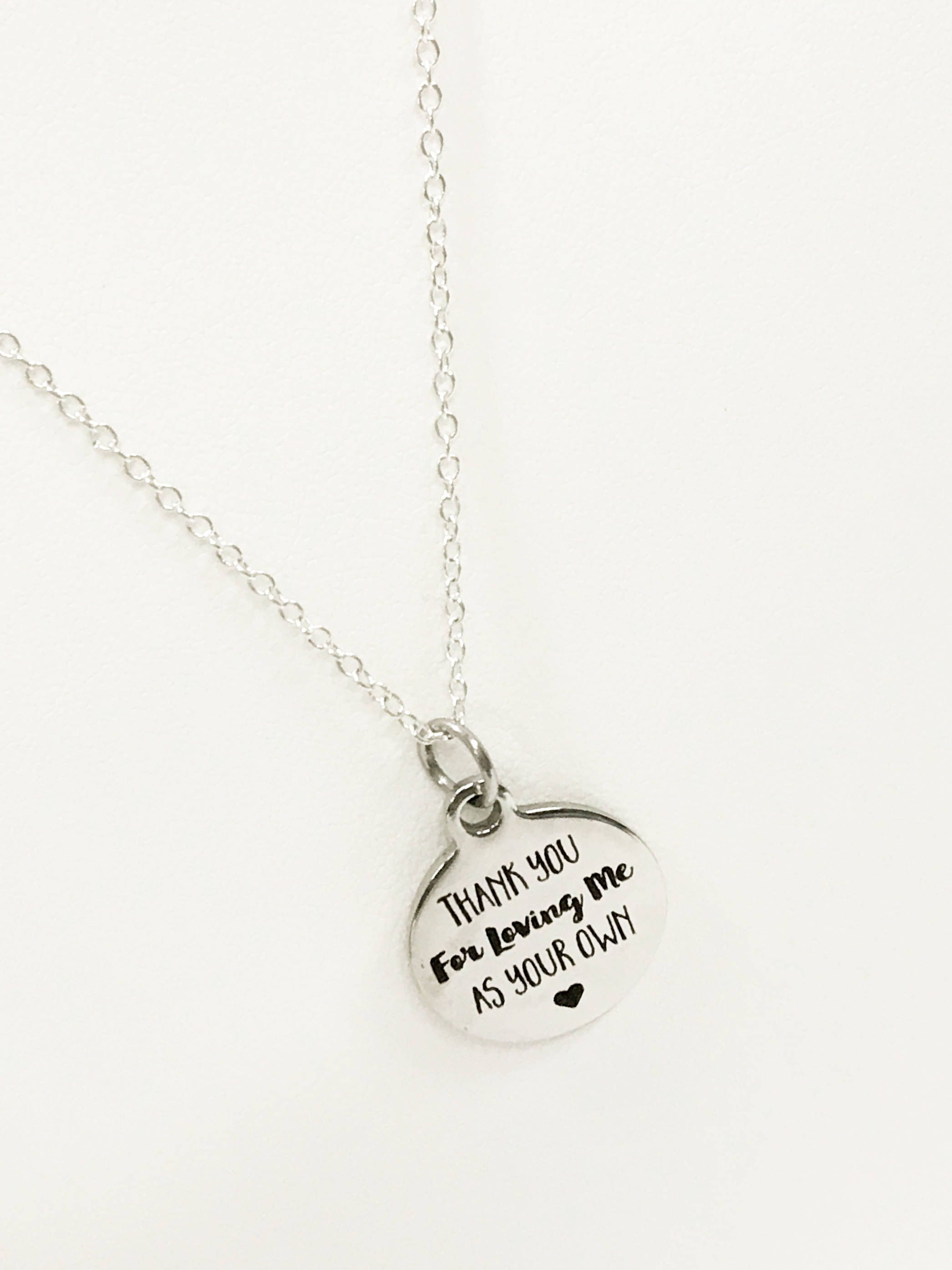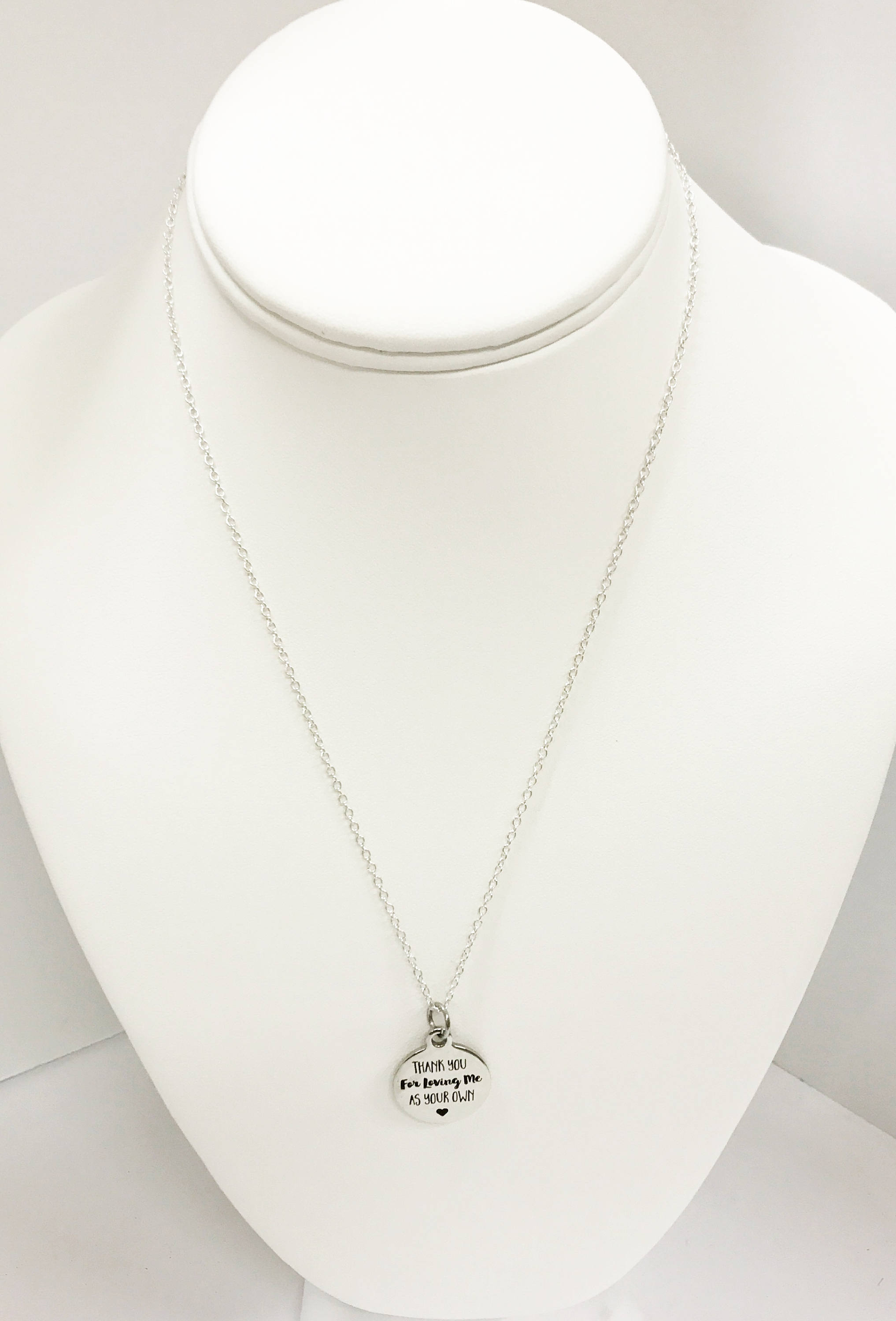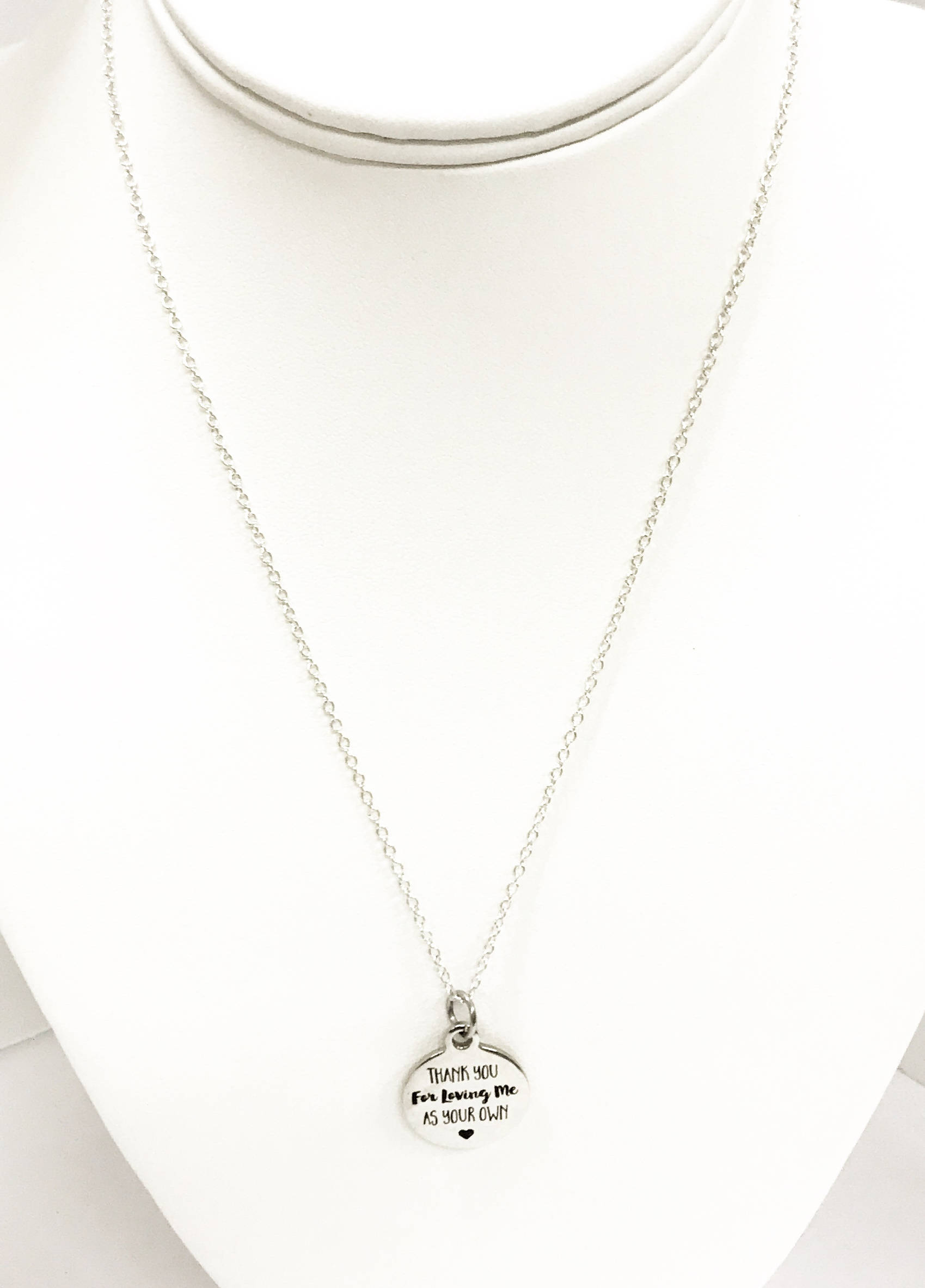 This is a stainless steel laser engraved pendant on a silver plated link chain. The pendant has "Thank You For Loving Me As Your Own" on it. This pendant is available on your choice of 16, 18, 20, 22, 24, 26, 28 or 30 inch chain. The pendant is also available for individual purchase if you have another chain on which you would like to wear it.