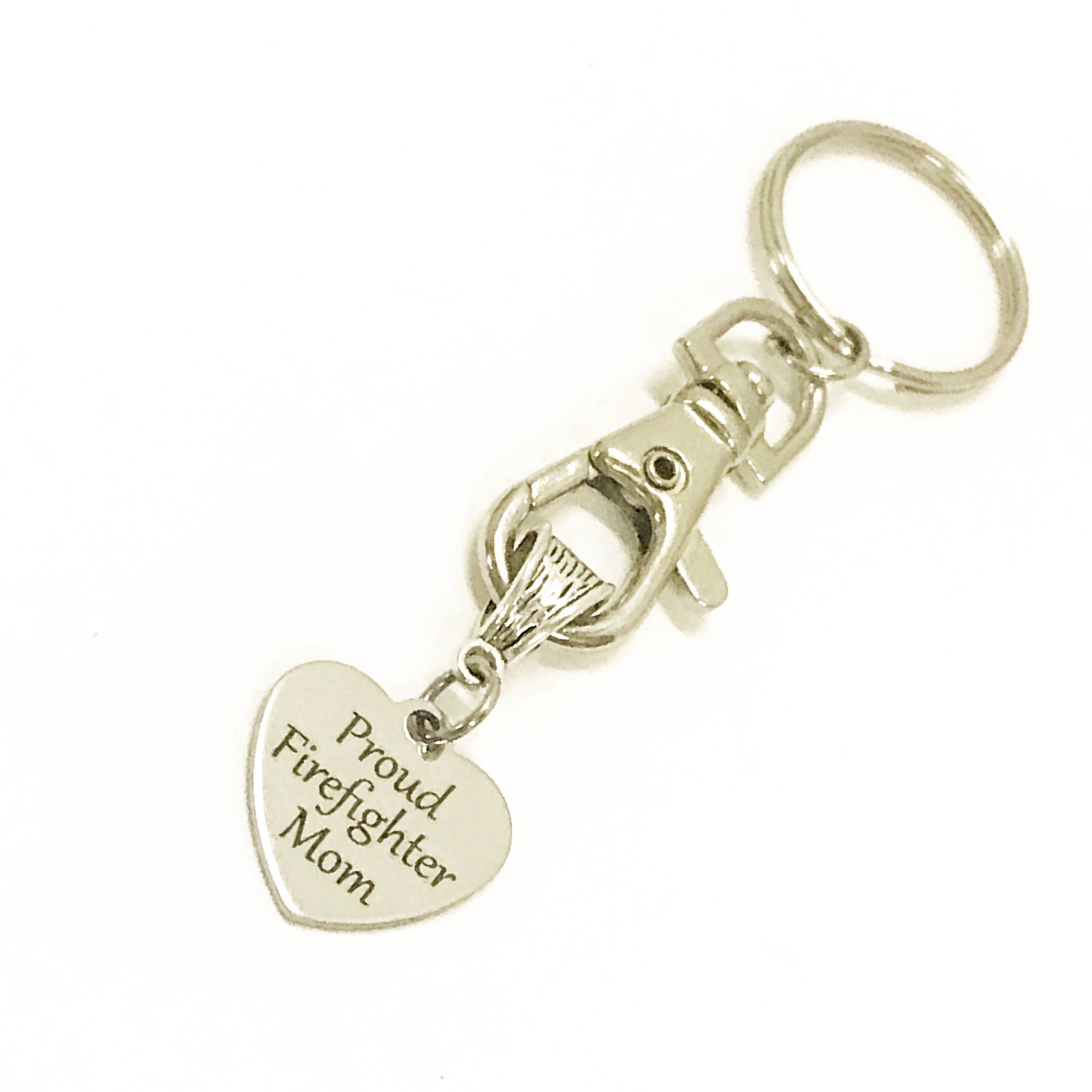 This is a beautiful keychain for a proud firefighter mom! It has a heart shaped stainless steel laser engraved charm with "Proud Firefighter Mom" on it.
