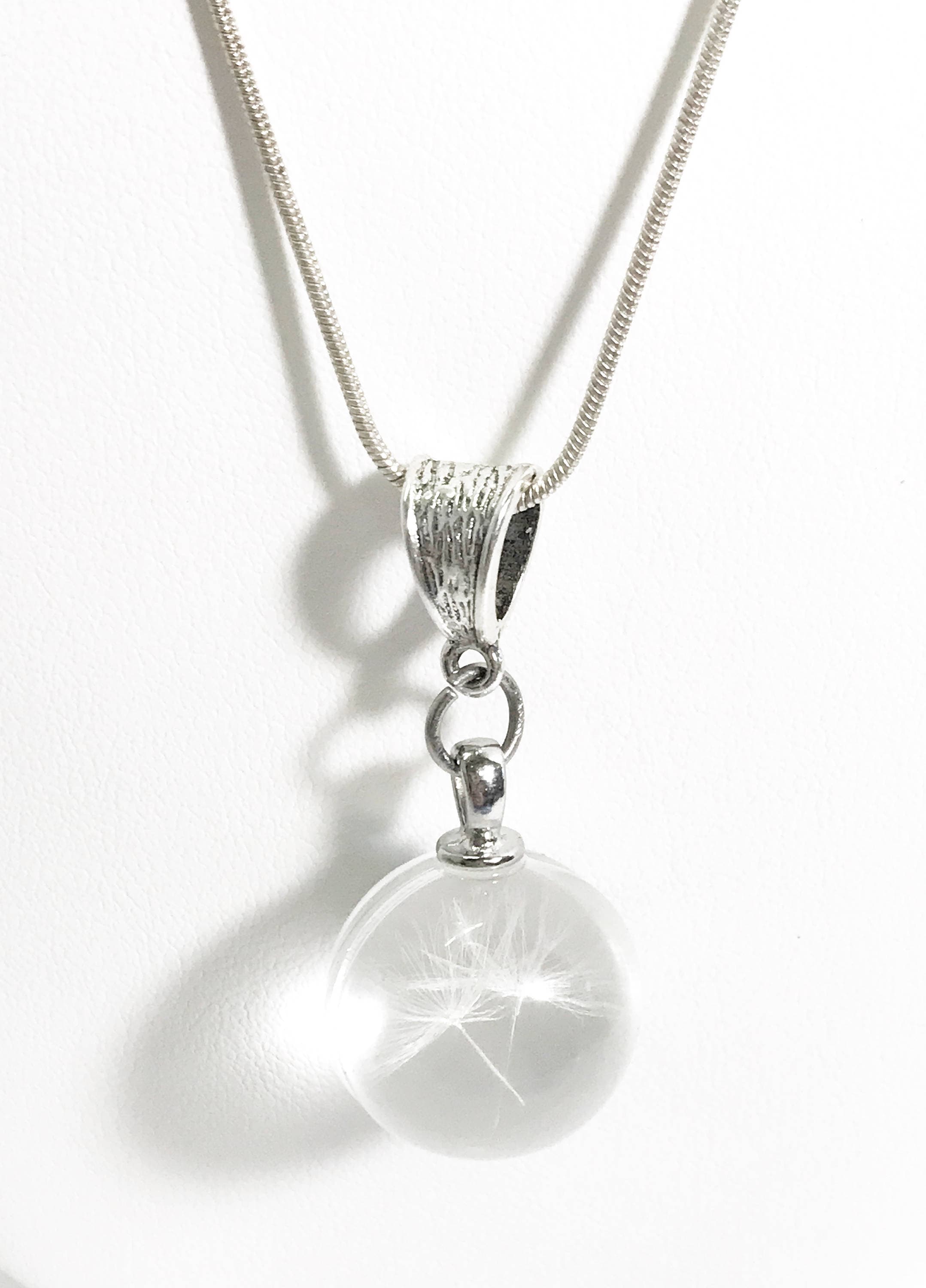 This is a great gift to give to tell someone to tell them that you hope all their wishes come true. It is a glass ball pendant containing dandelion seeds on a silver plated snake chain.