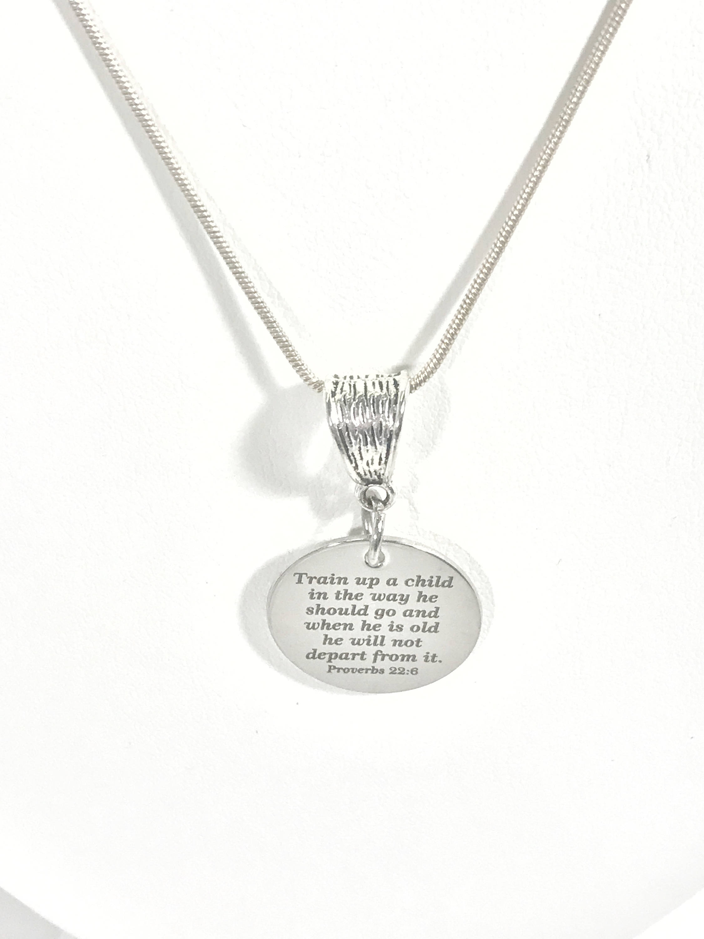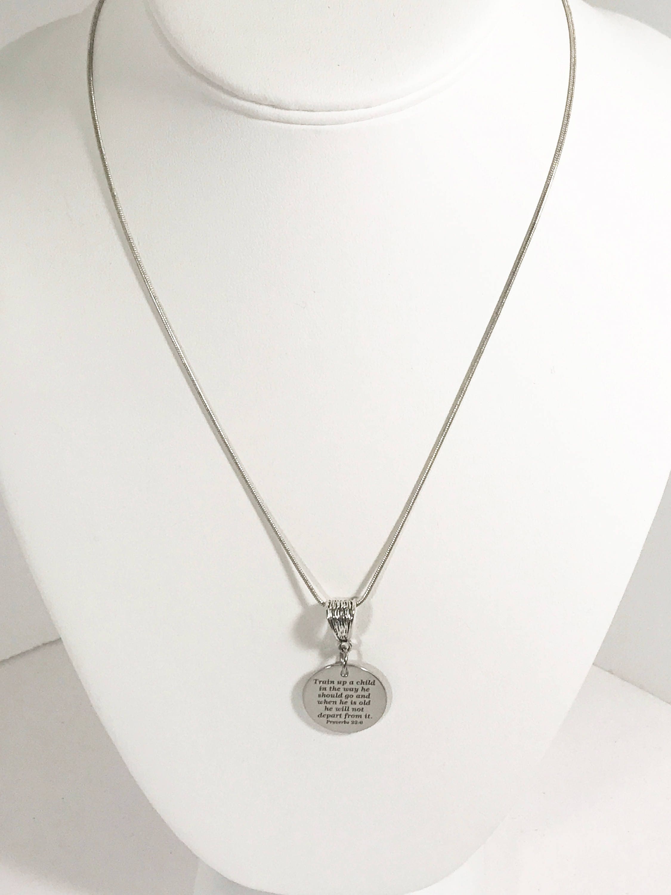 This is a stainlses steel laser engraved pendant on a silver plated chain. The pendant has the Proverbs 22:6 Bible verse of "Train up a child in the way he should go and when he is old he will not depart from it" on it.