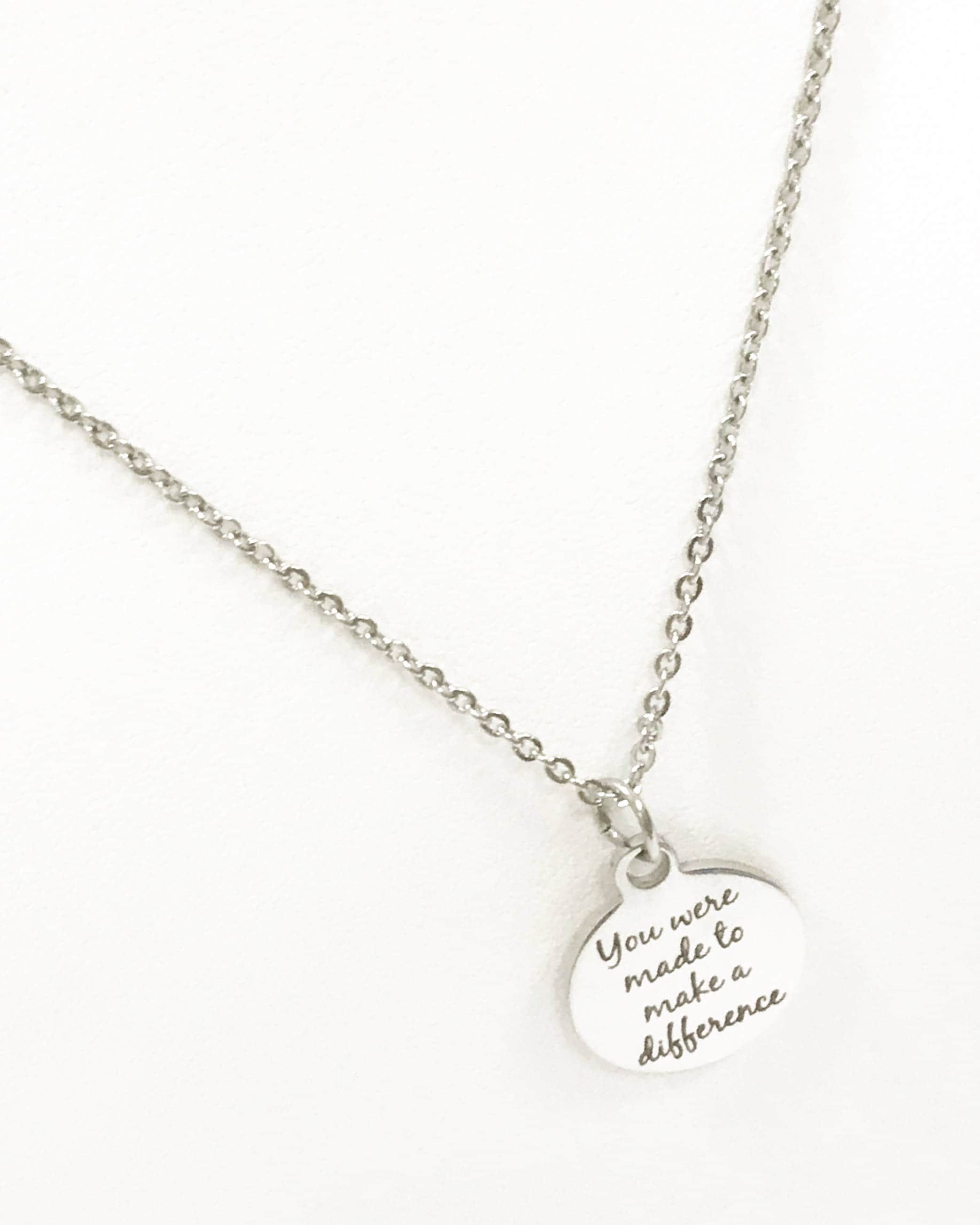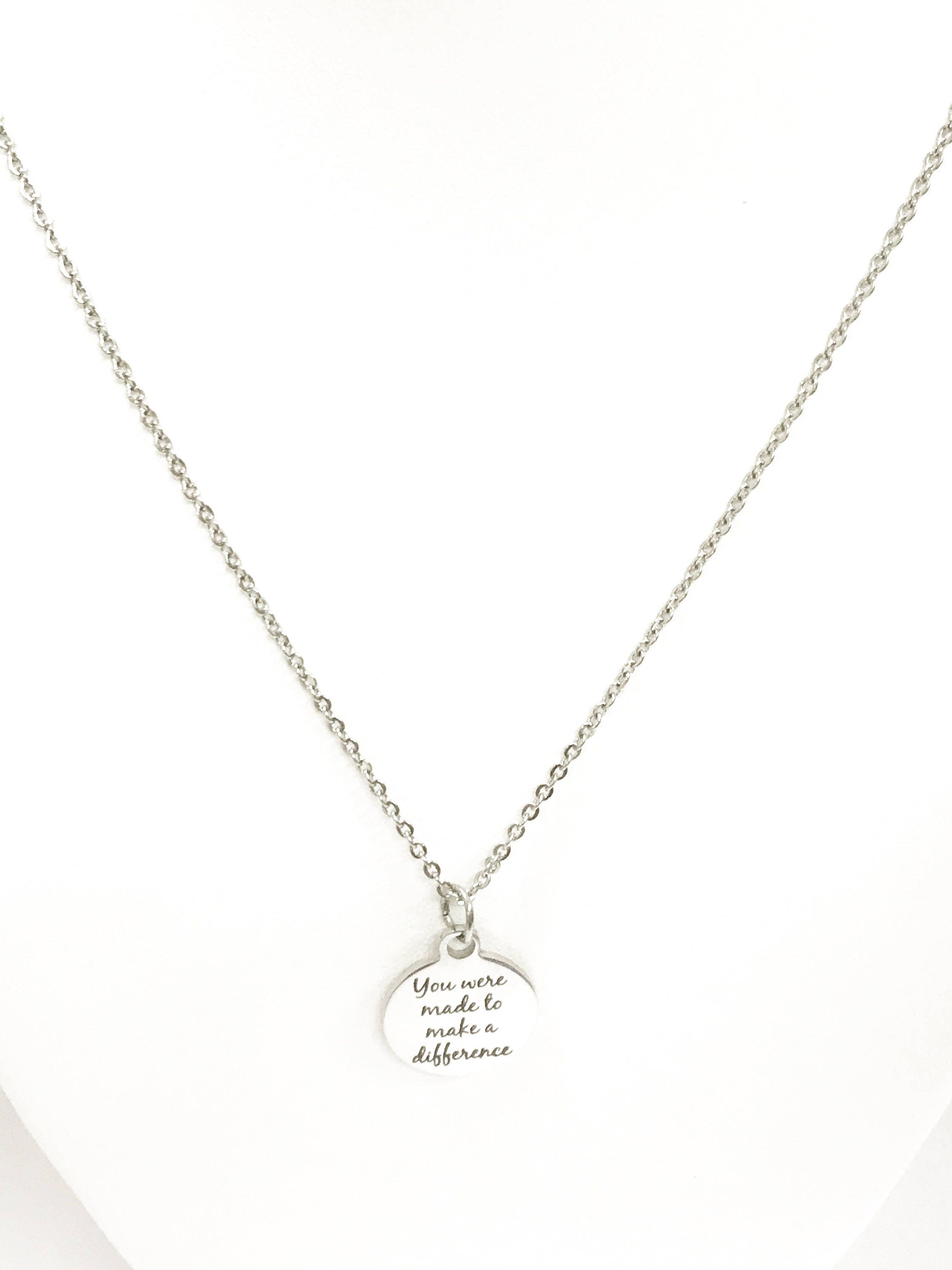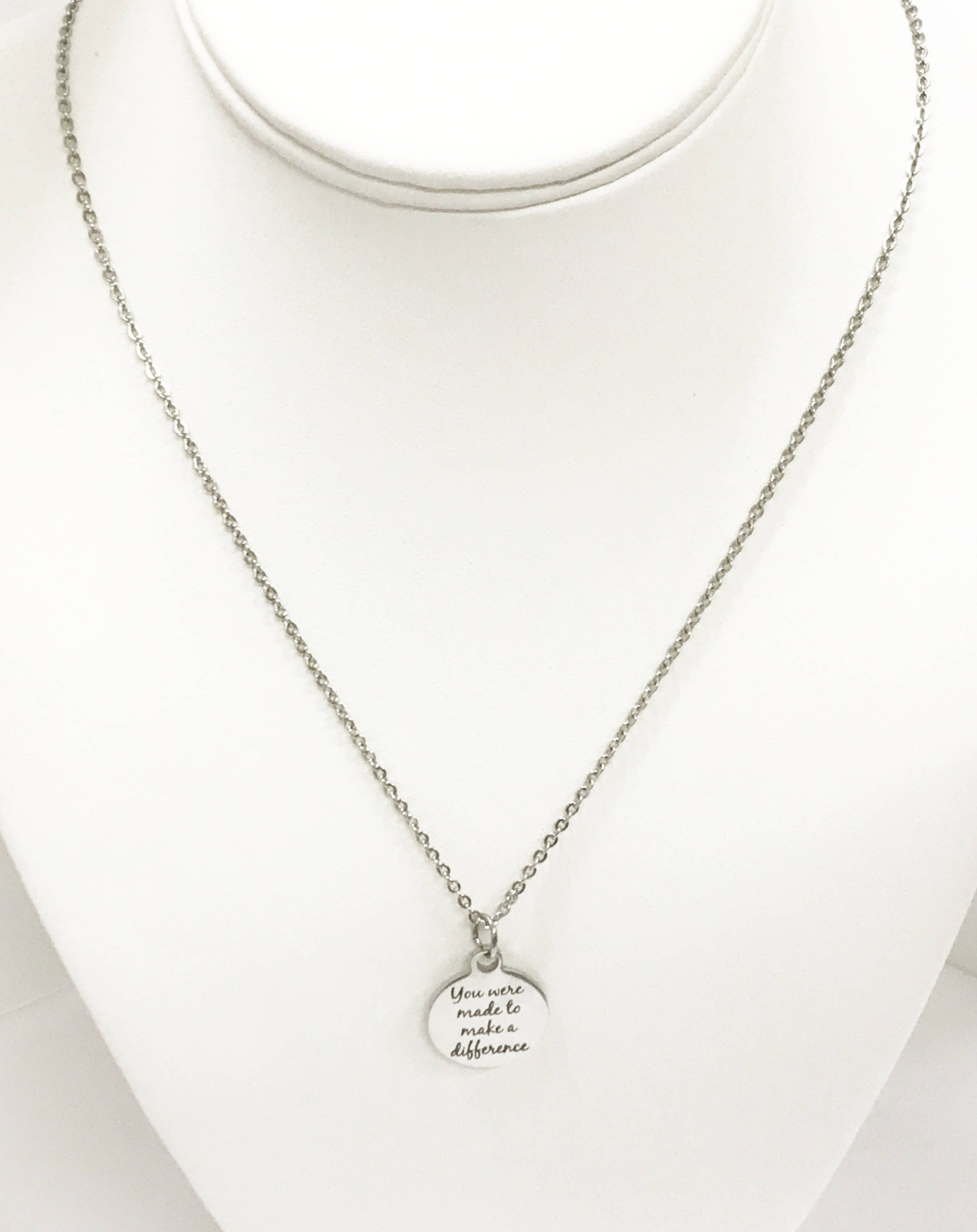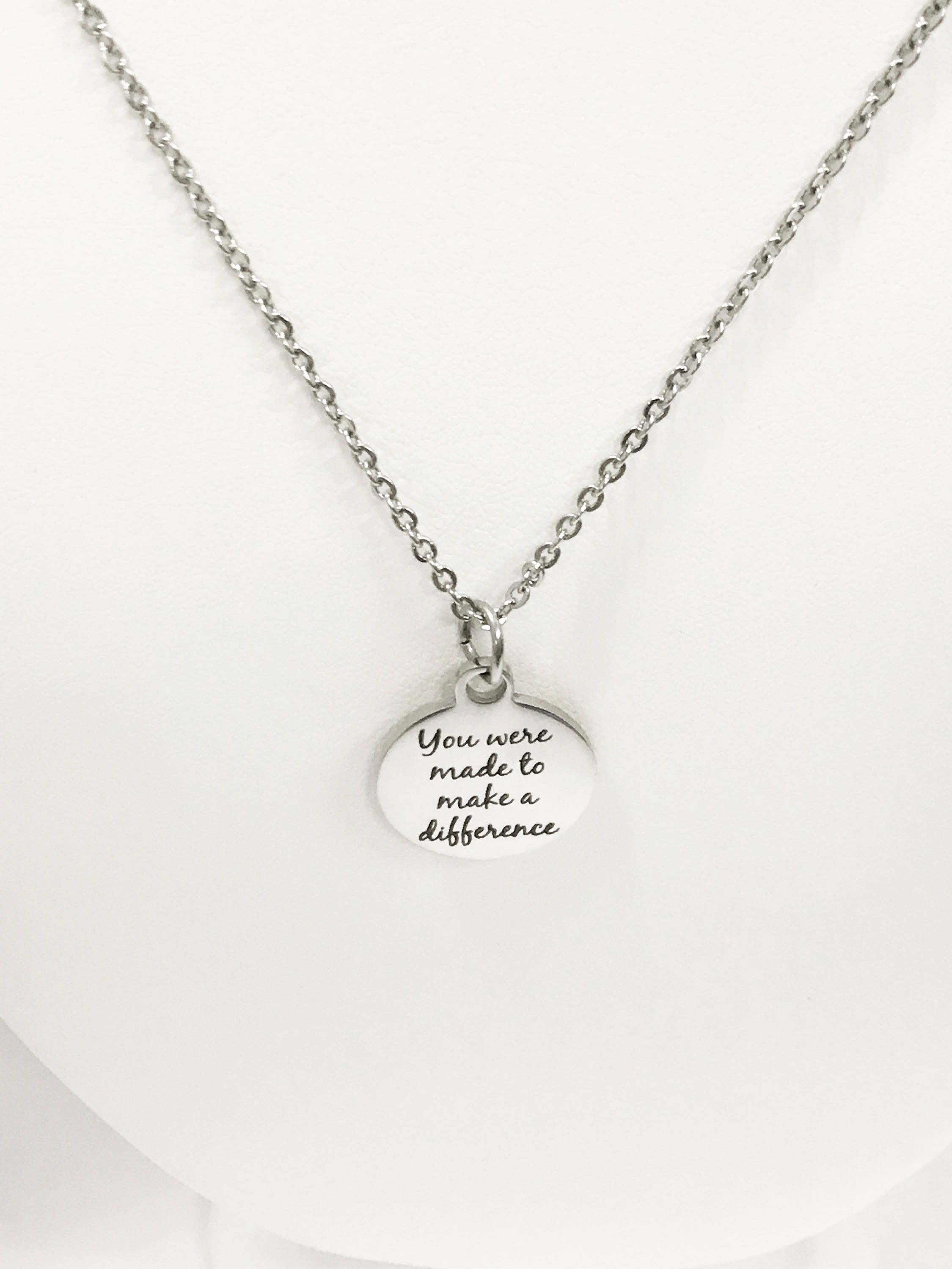 This is a stainless steel laser engraved pendant on a stainless steel chain. The pendant has "You Were Made To Make A Difference" on it. This pendant is available on your choice of 16, 18, 20, 22, 24, 26, 28 or 30 inch chain. The pendant is also available for individual purchase if you have another chain on which you would like to wear it.