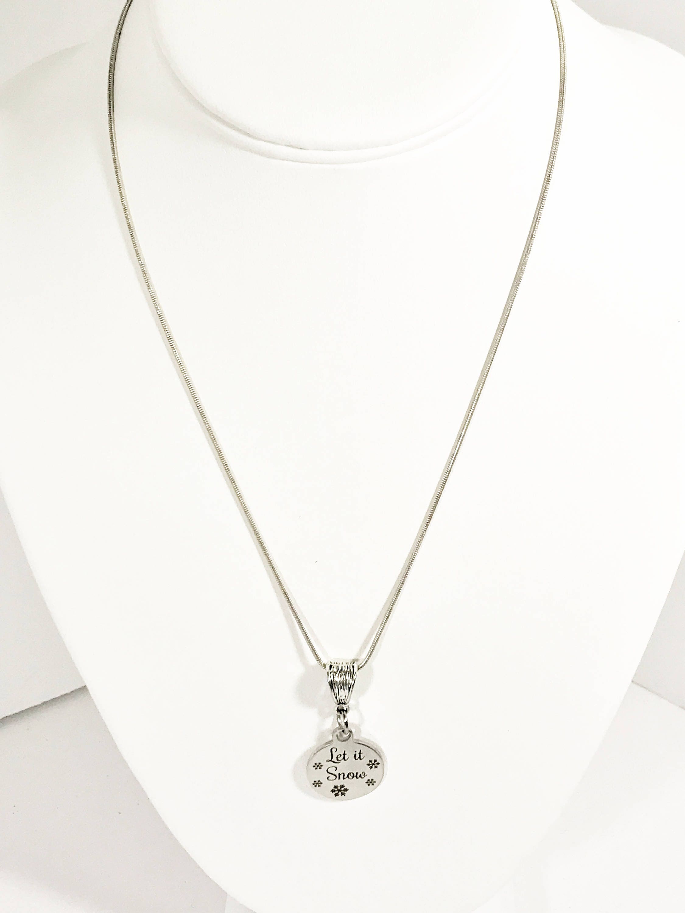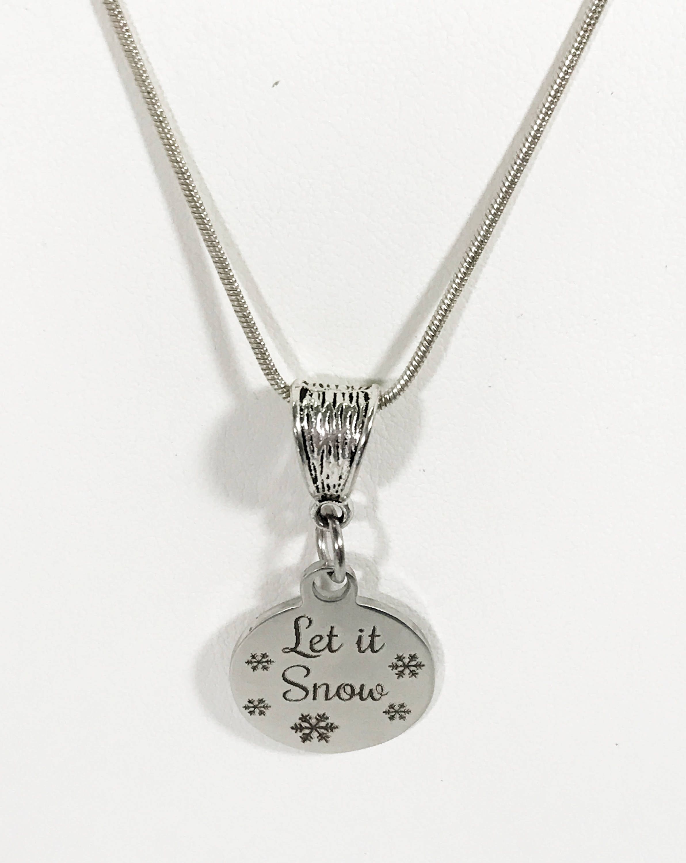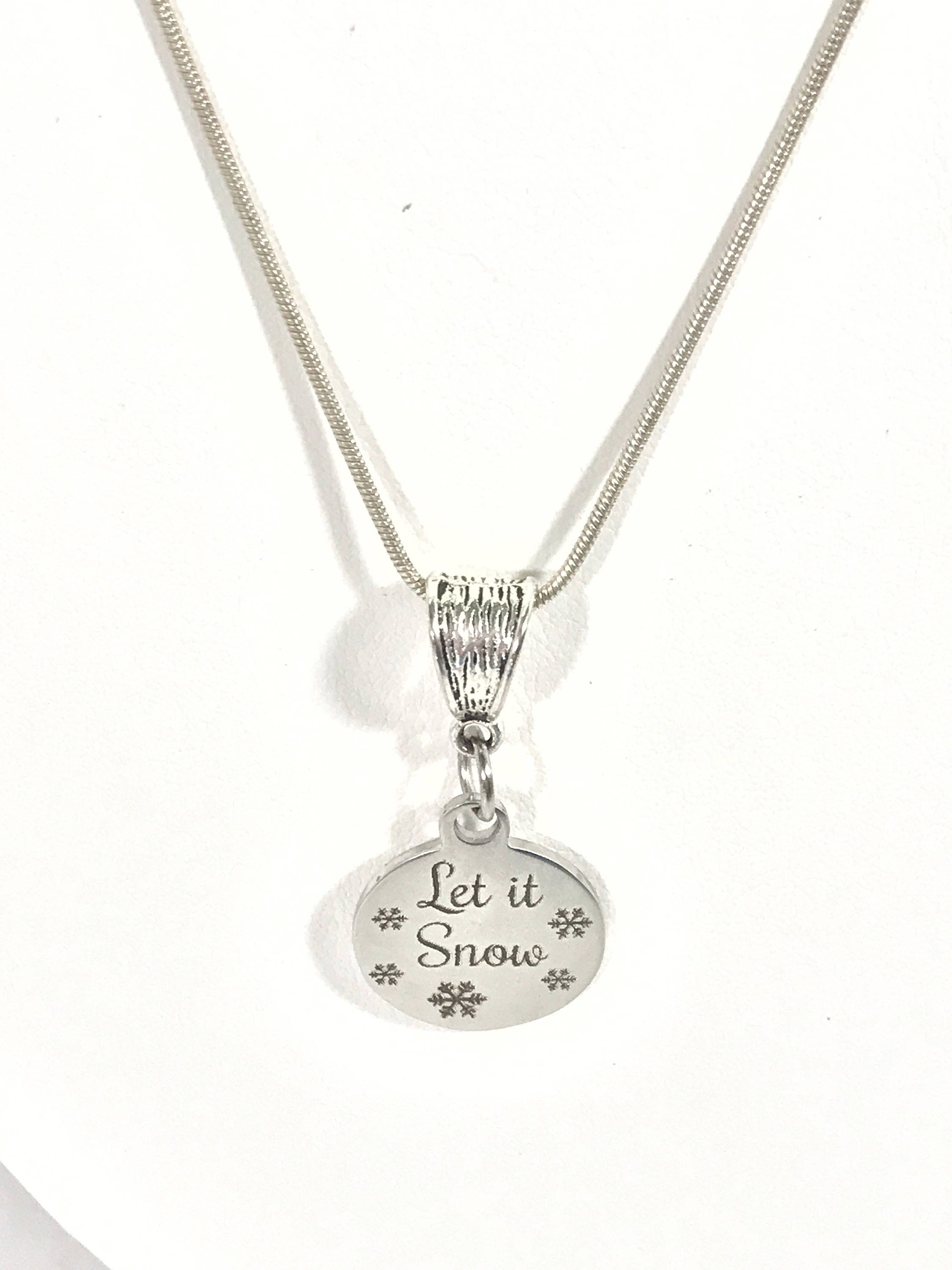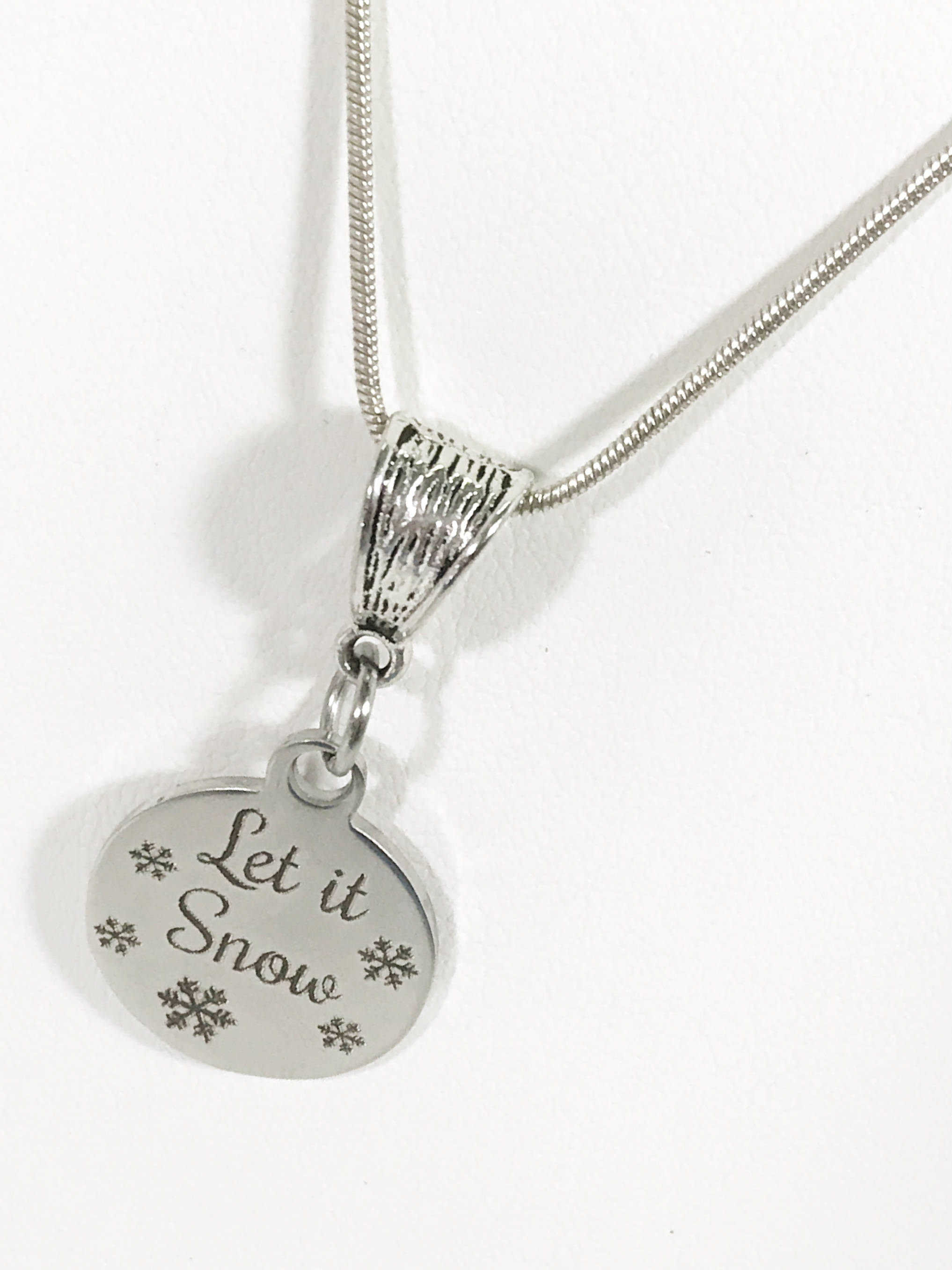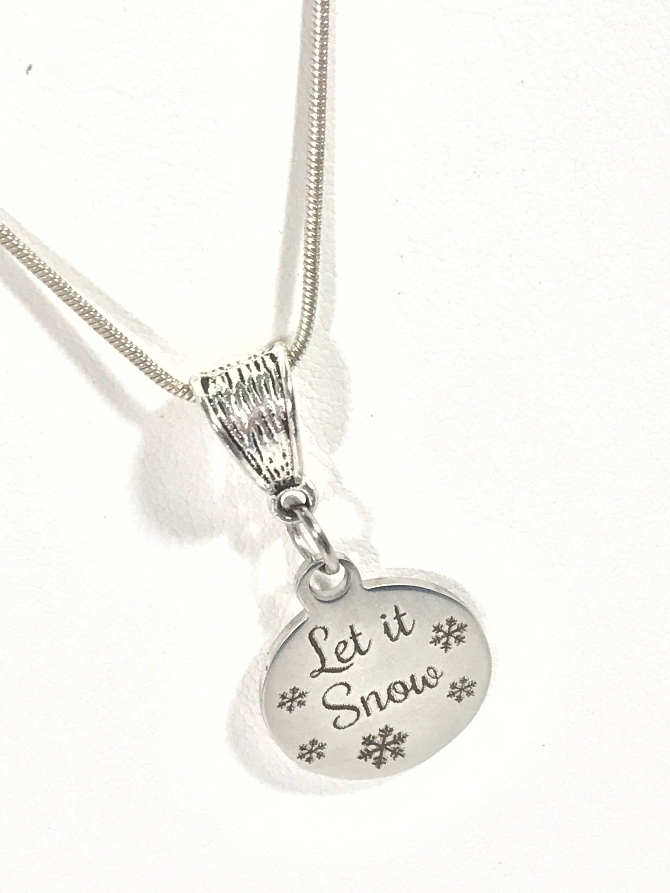 This is a beautiful necklace with a laser engraved stainless steel pendant that has "Let it snow" on a silver plated snake chain. This would be a great graduation gift! This pendant is available on your choice of 16, 18, 20, 22, 24, 26, 28 or 30 inch chain. It is also available as a pendant only if you have another necklace on which you wish to wear it.