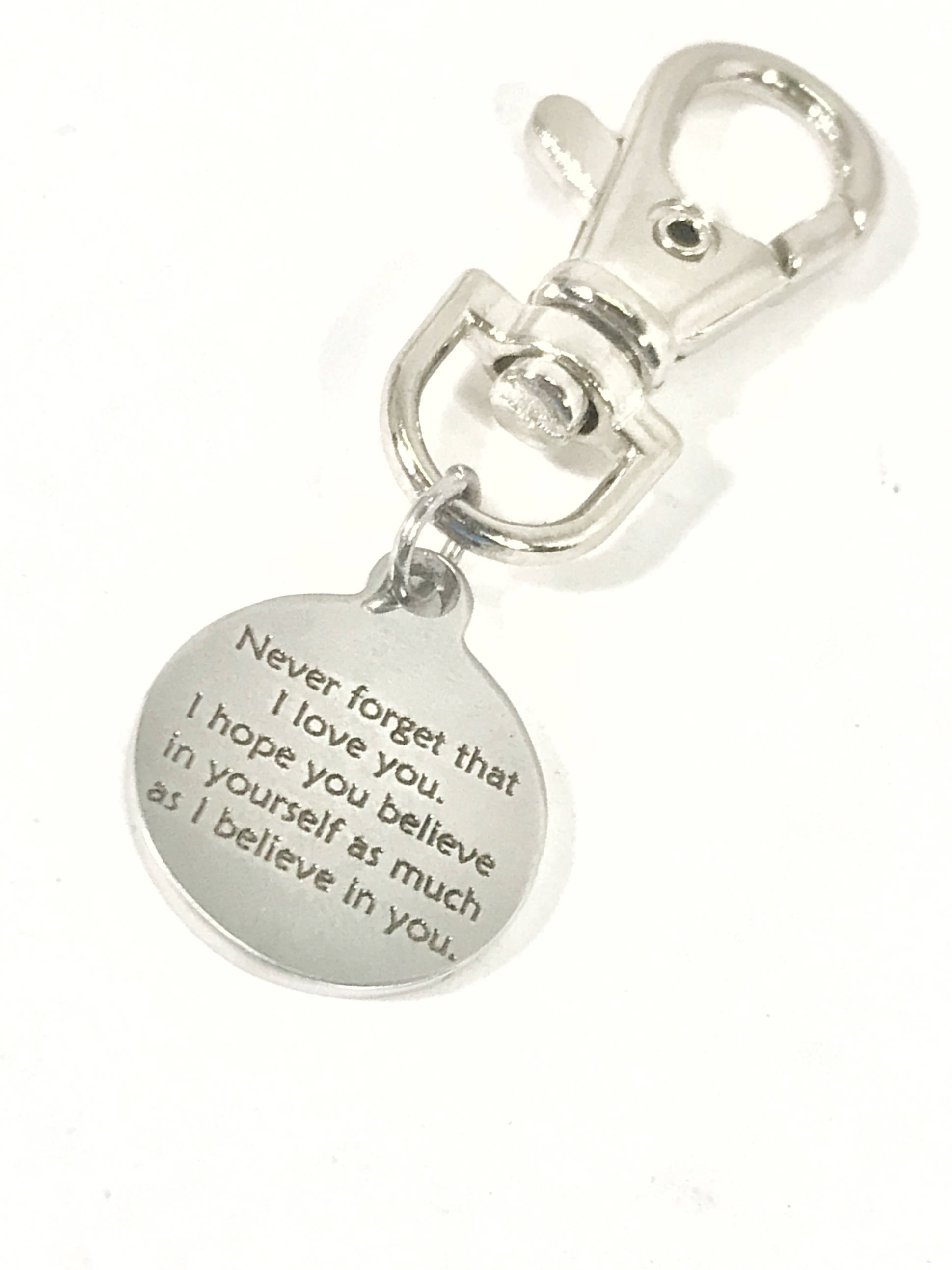 This is a zipper pull which includes a stainless steel laser engraved charm with the following on it: