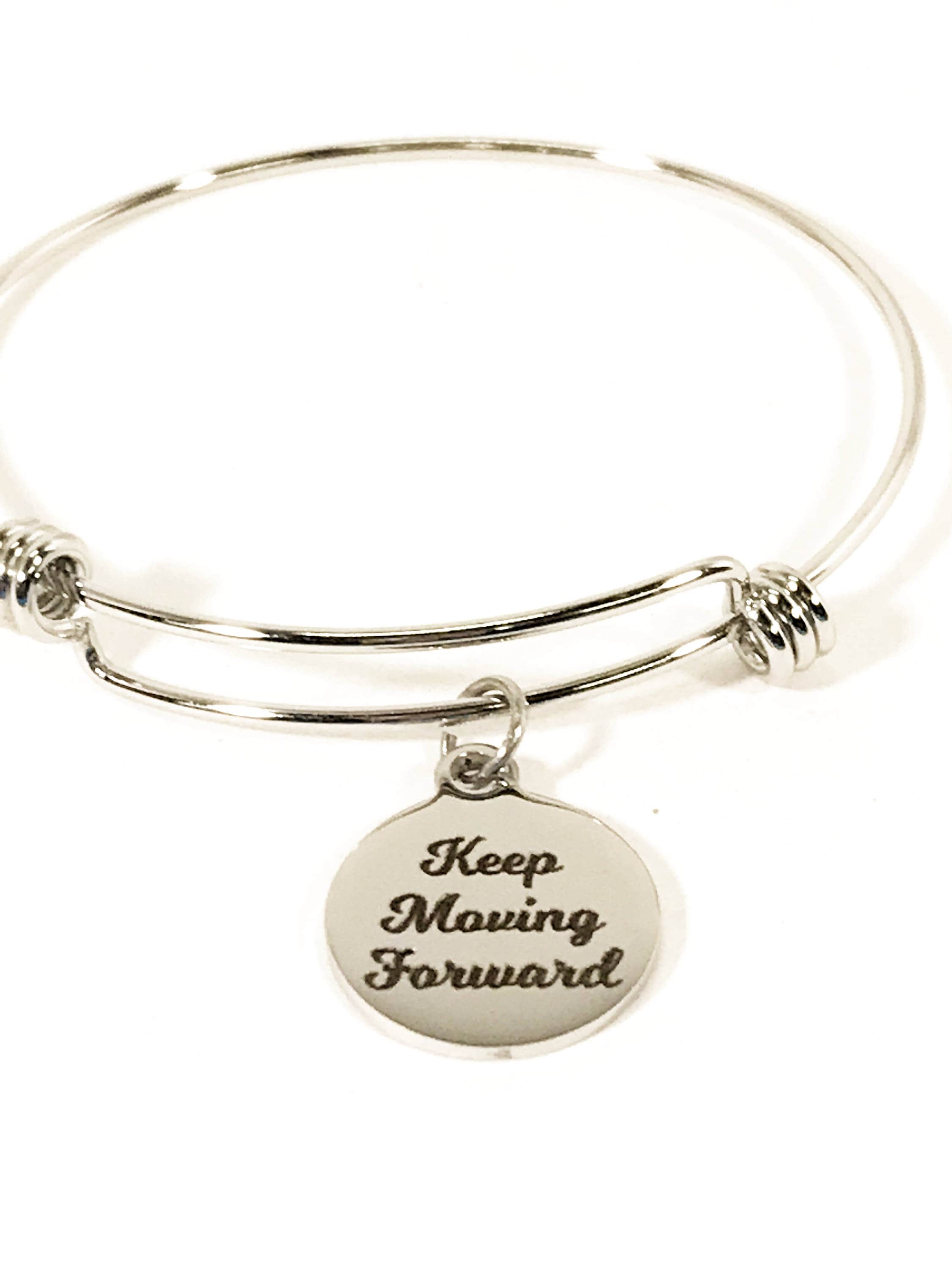 This is a great encouragement bracelet with a stainless steel laser engraved charm on it. The charm has "Keep Moving Forward" on it to remind the wearer to keep taking steps forward no matter what they have faced in life.