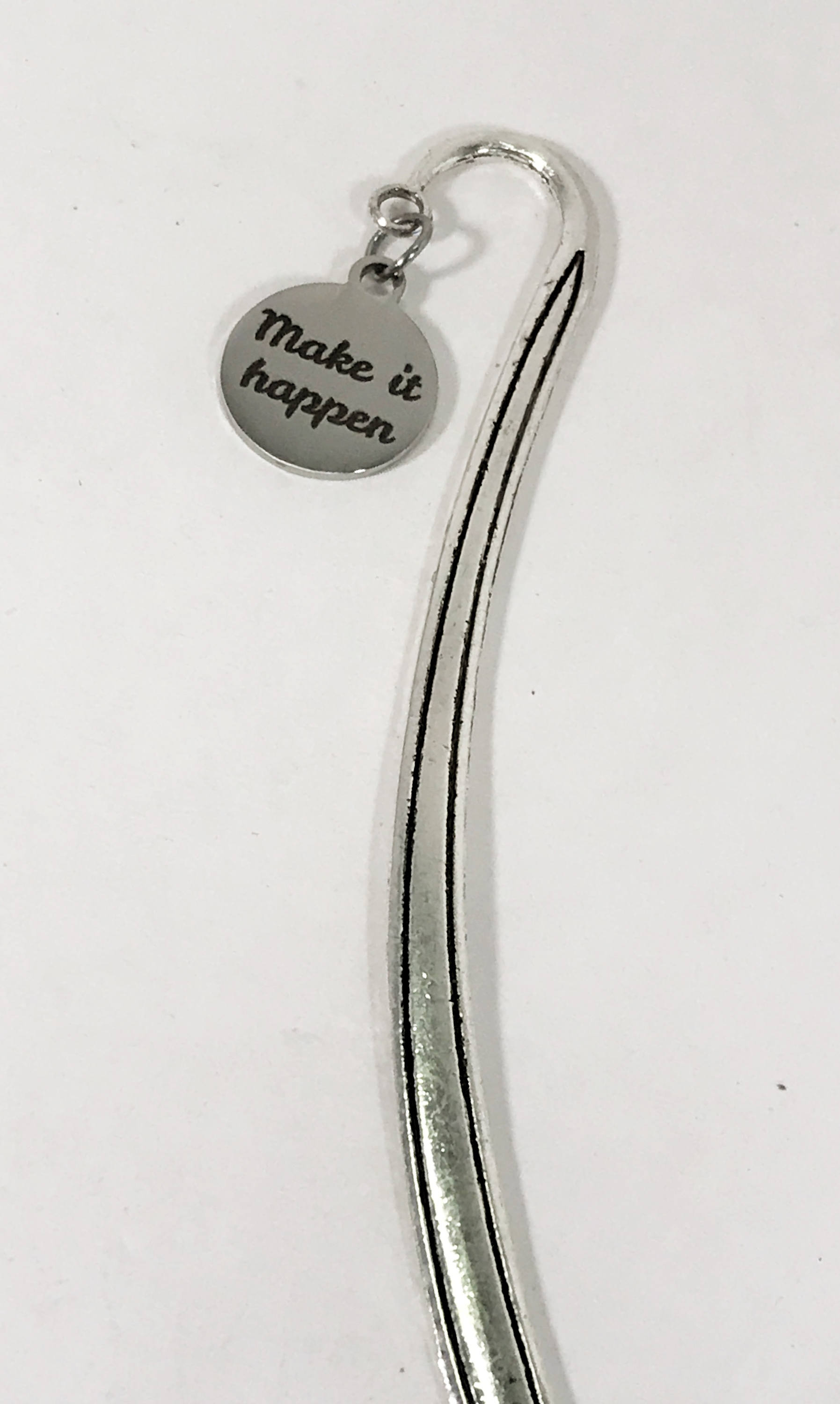 This is a great reader gift! It is a metal bookmark that has a stainless steel laser engraved charm that has "Make it happen" on it.