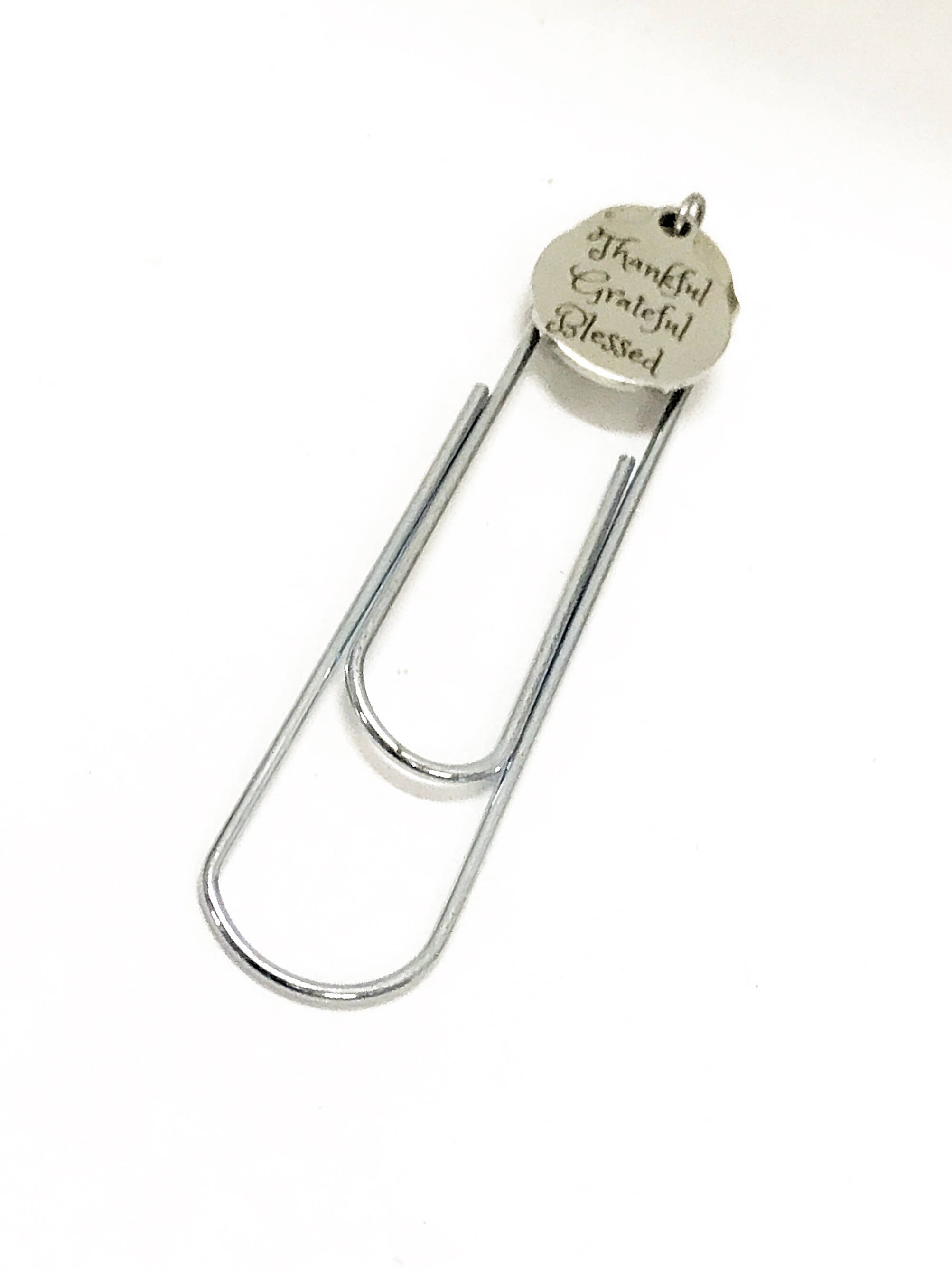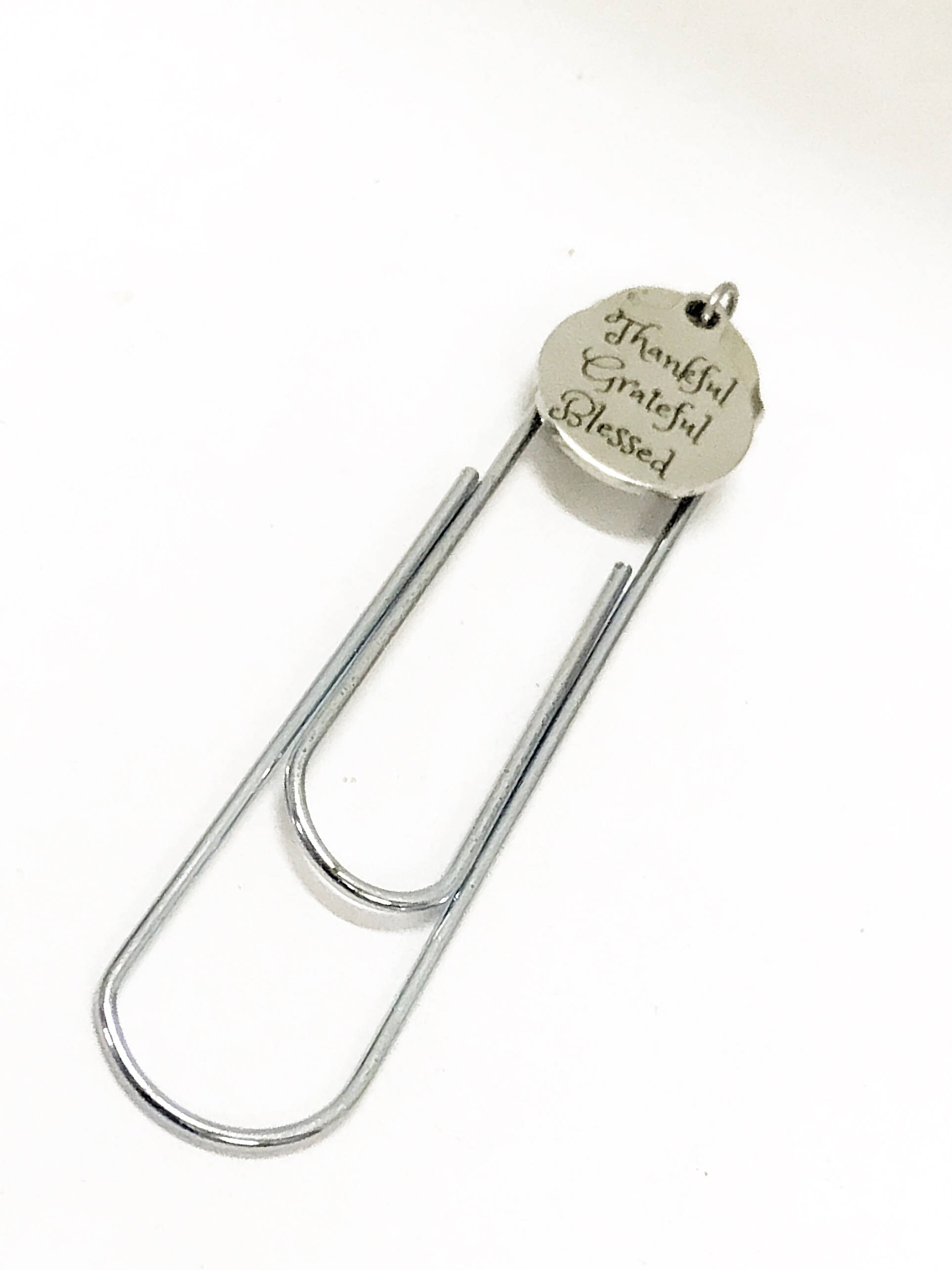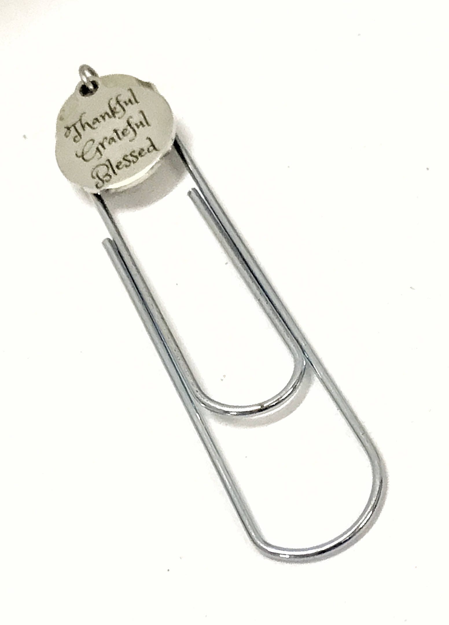 This is a great large paper clip style bookmark that has a stainless steel laser engraved charm with "Thankful Grateful Blessed" on it. It can be used as a bookmark, page marker, or planner book mark.