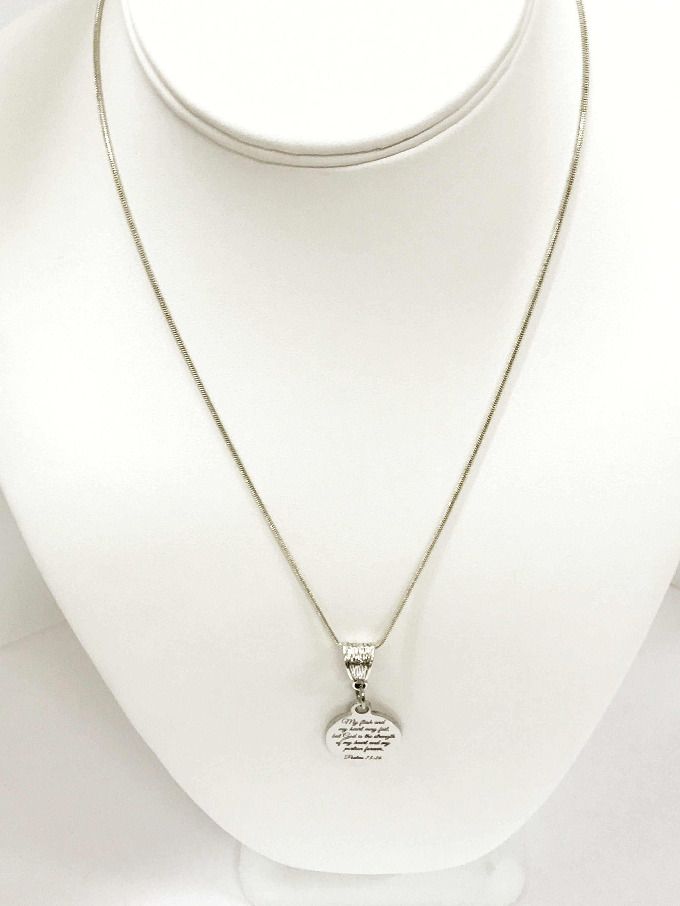This is a beautiful scripture necklace that has the Bible verse of Psalms 73:26, "My flesh and my heart may fail but God is the strength of my heart and my portion forever."