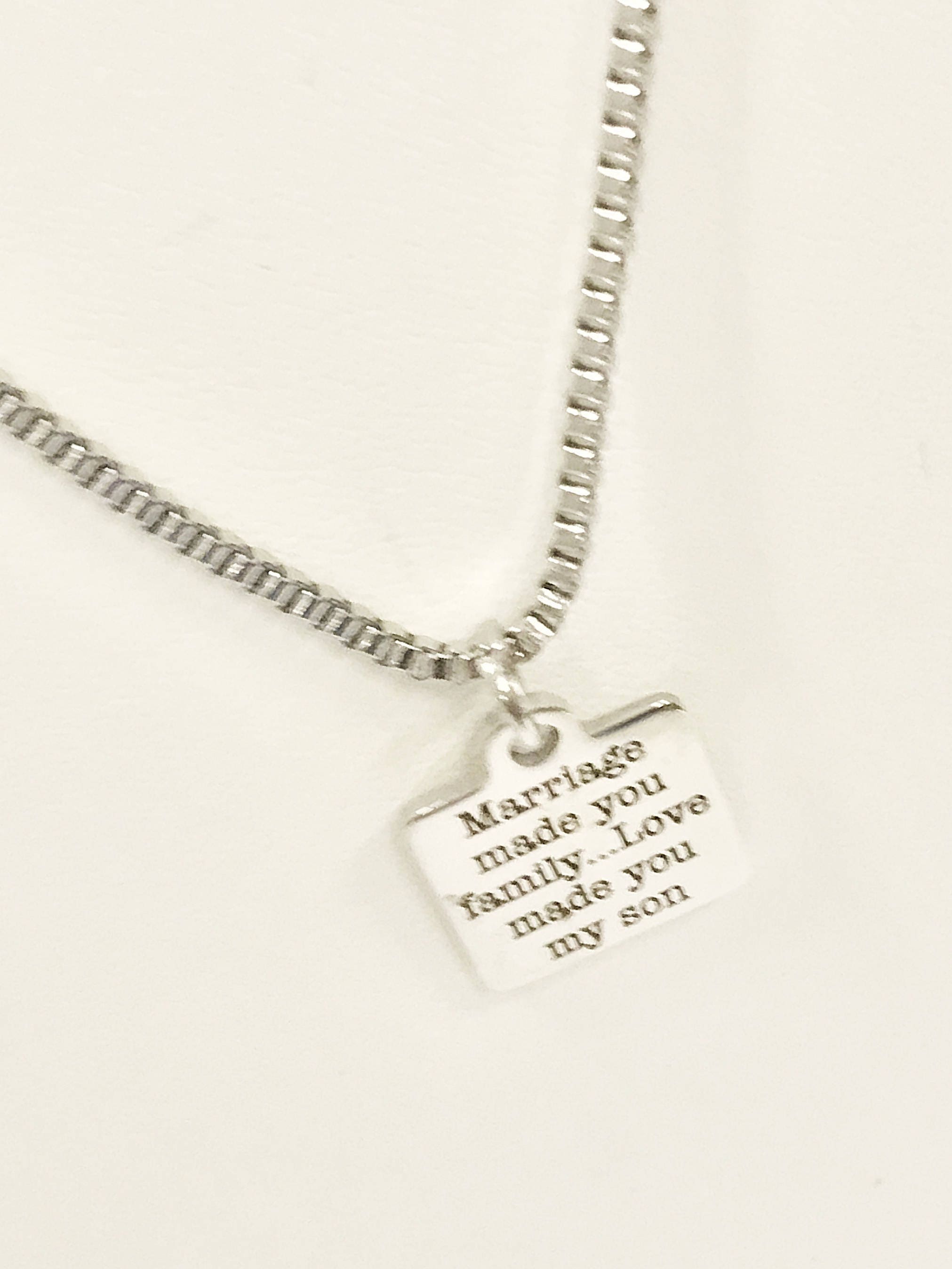 This is a great necklace to express your love for your son in law or stepson. This necklace comes with a stainless steel laser engraved charm pendant on a 22 inch stainless steel box chain. The pendant is also available for individual purchase if you have another chain on which you would like to wear it. The pendant has the following on it:
