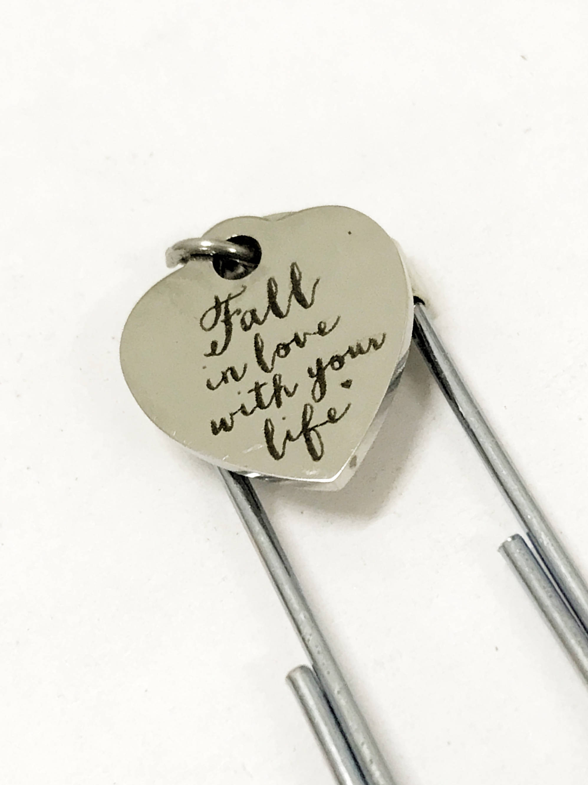 This is a great large paper clip style bookmark that has a stainless steel laser engraved charm with "Fall in love with you life" on it. It can be used as a bookmark, page marker, or planner book mark.