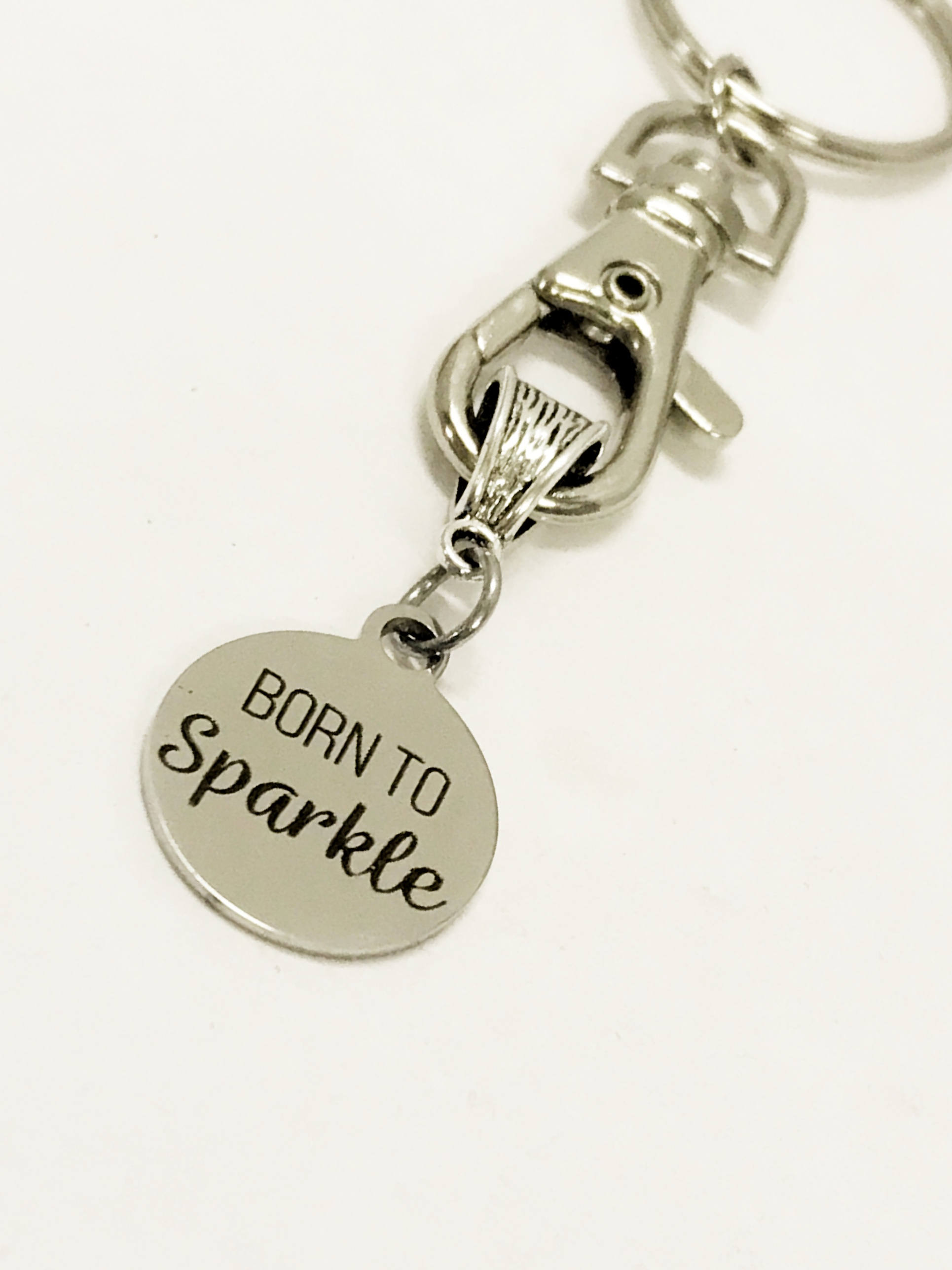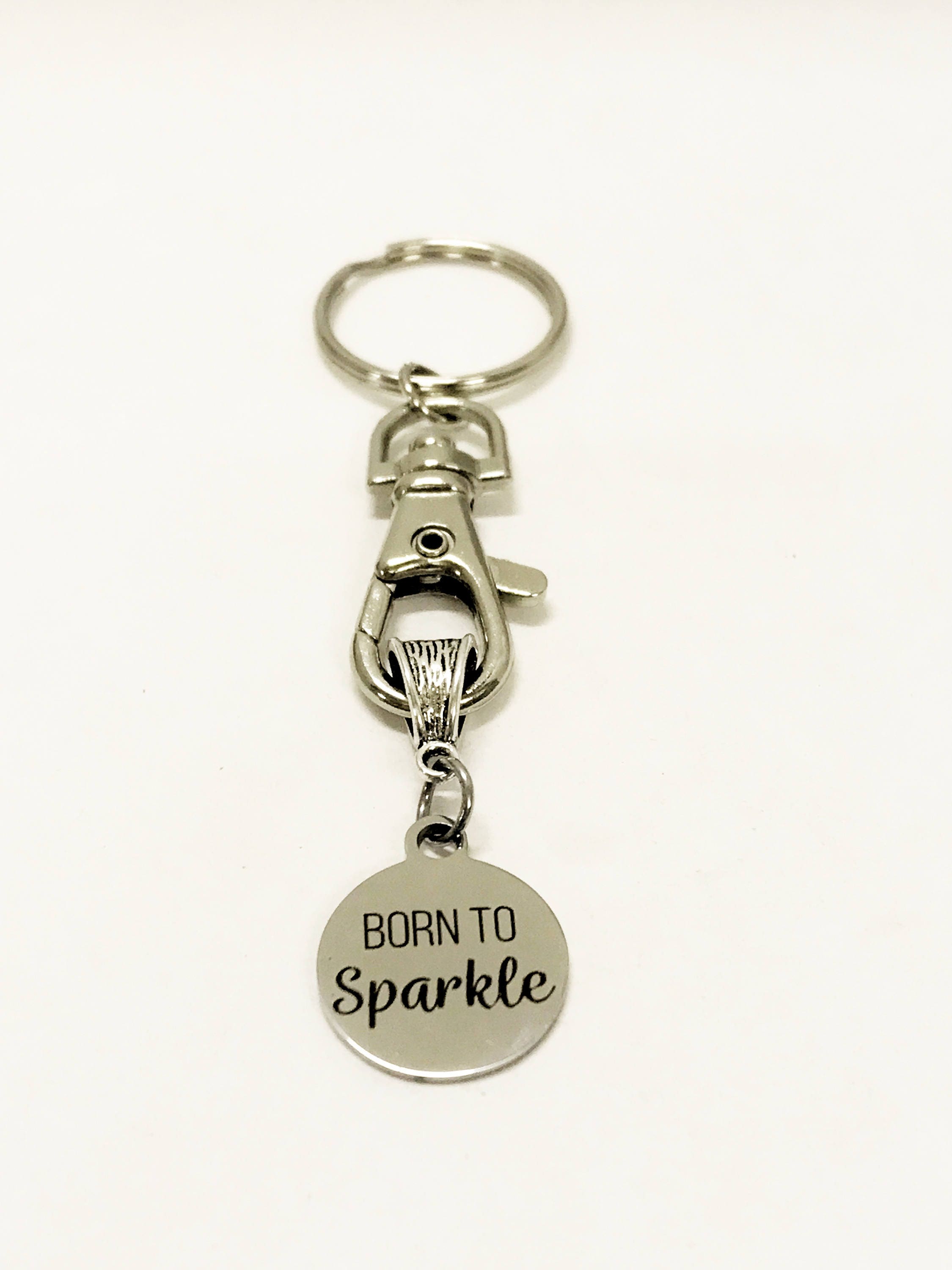 This is a beautiful encouraging "Born to sparkle" keychain. The charm is a stainless steel laser engraved charm.
