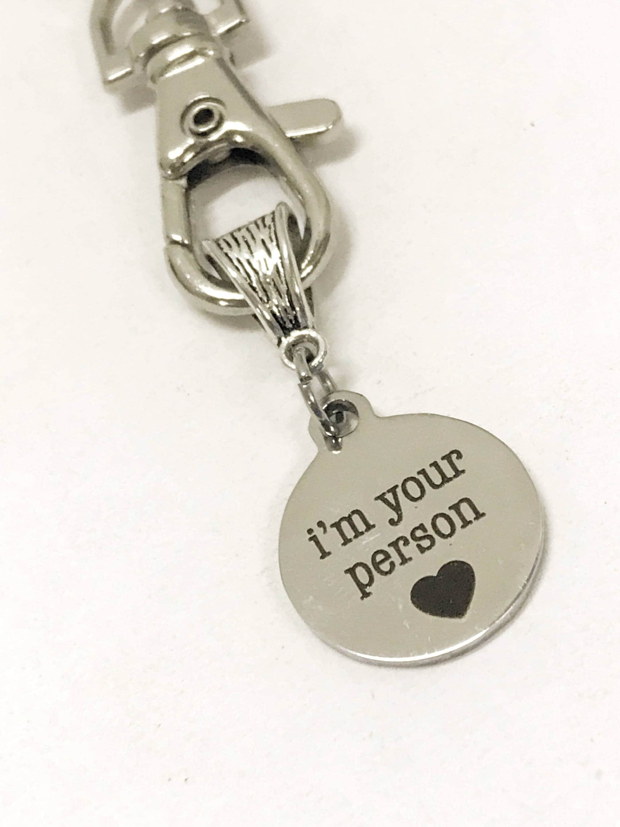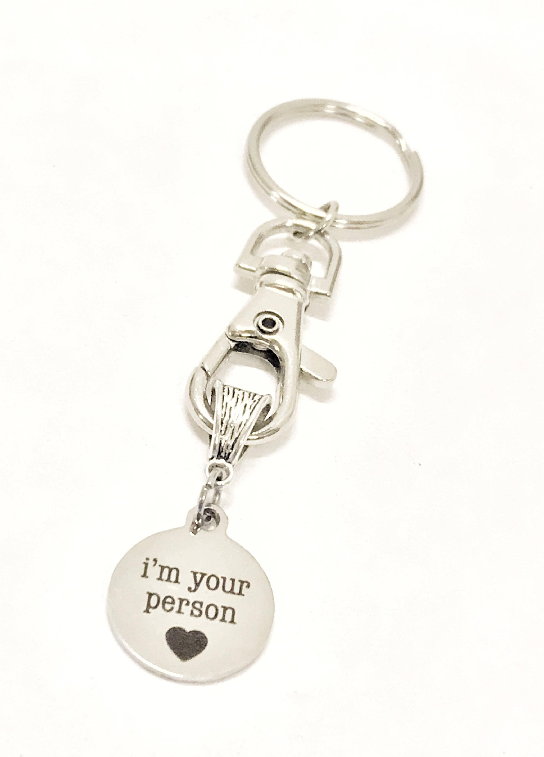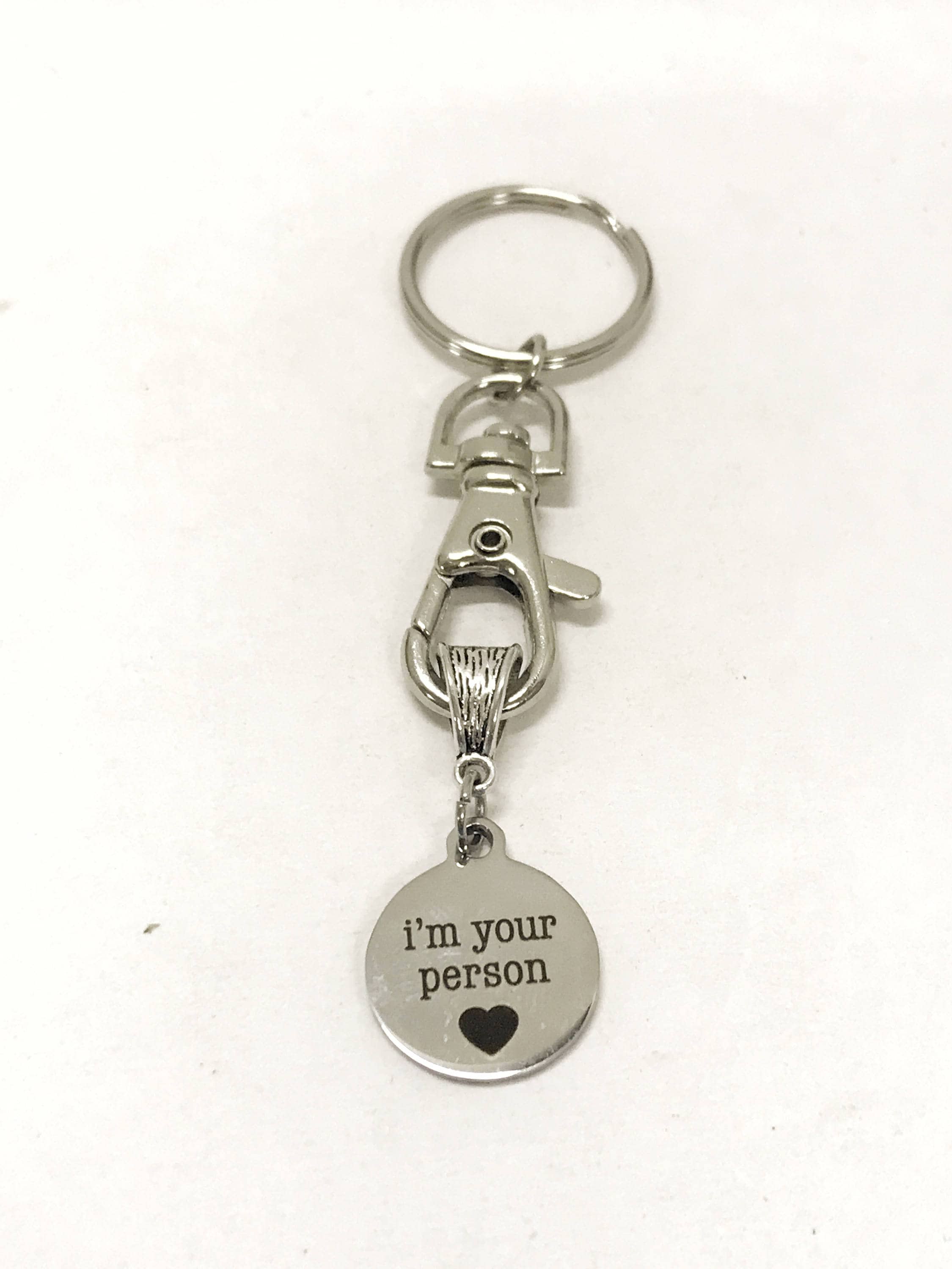 This is a beautiful encouraging "I'm your person" keychain. The charm is a stainless steel laser engraved charm.