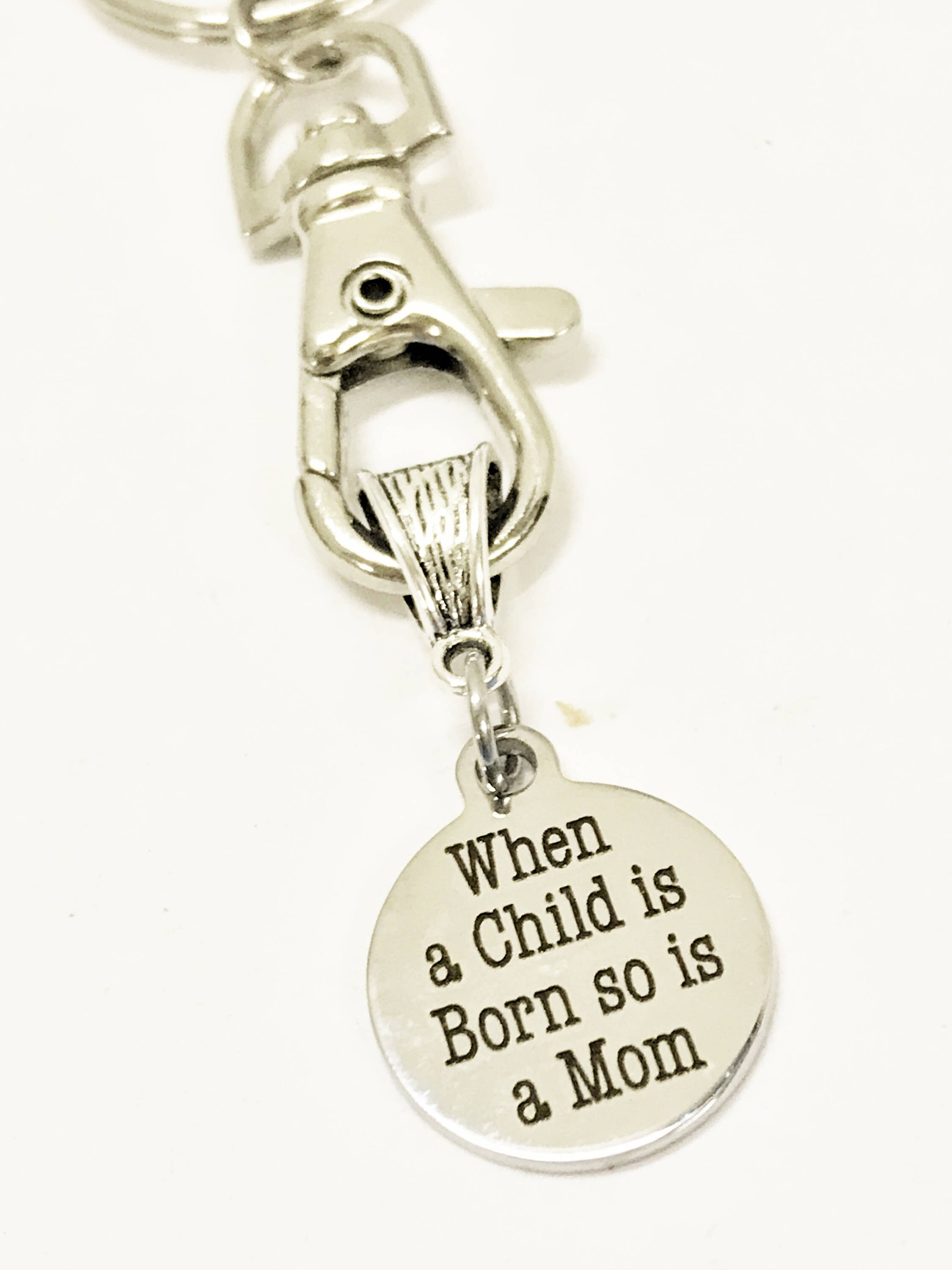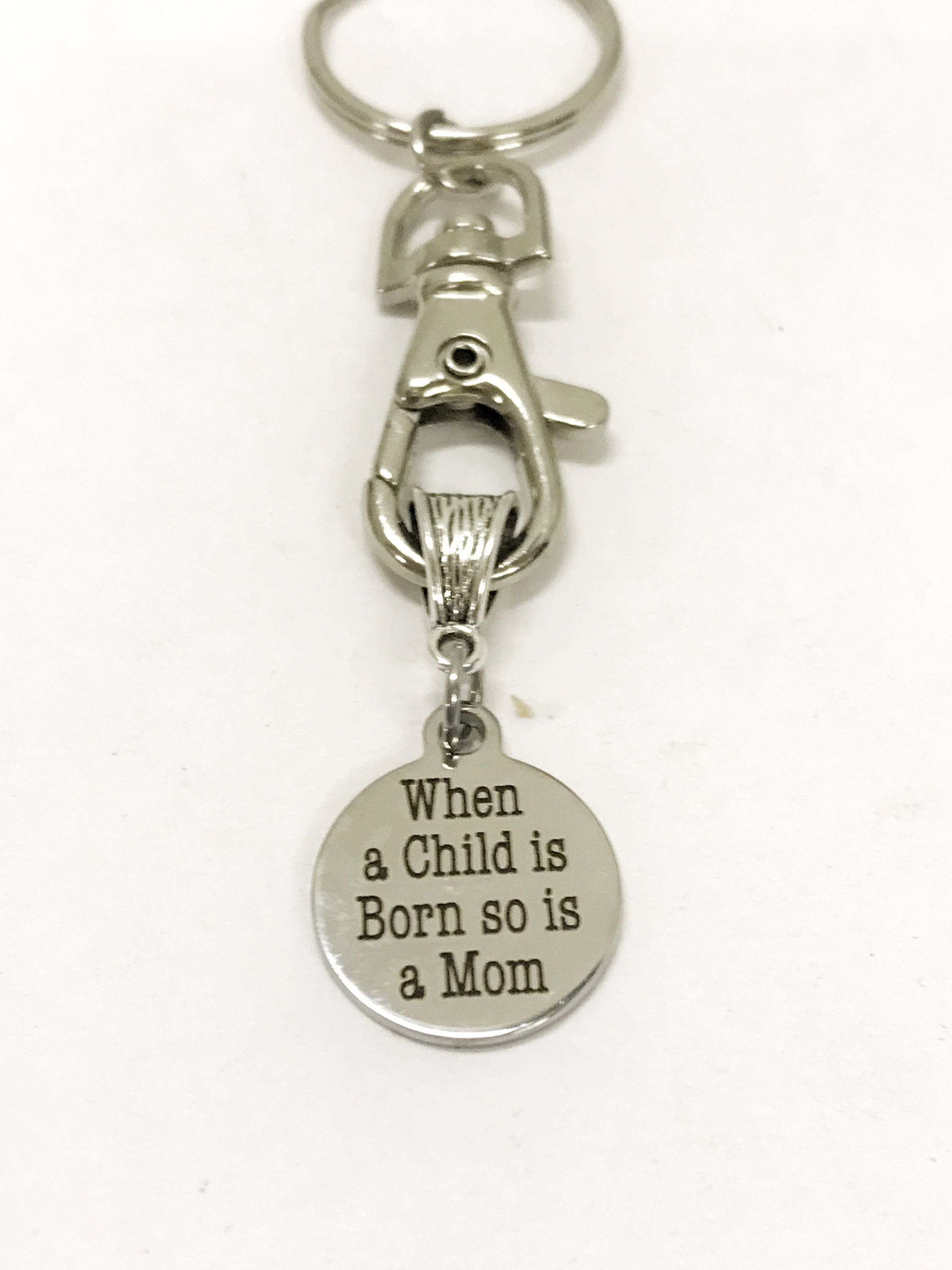 This keychain includes a stainless steel laser engraved charm that has "When a child is born, so is a mom" on it.