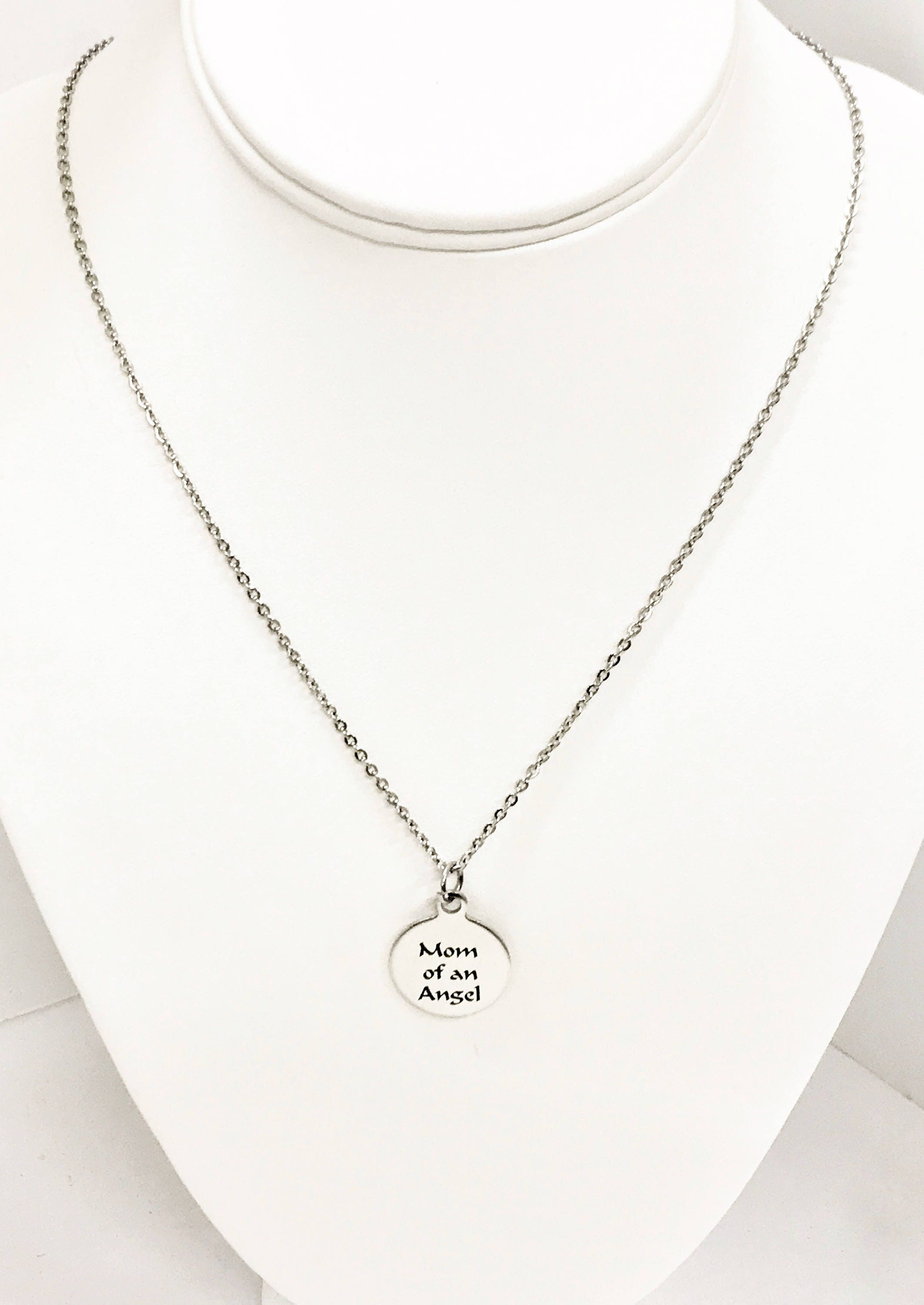 This necklace would be a great gift to encourage someone. This is a stainless steel laser engraved pendant on a stainless steel chain. The pendant has "Mom of an angel" on it. This pendant is available on your choice of 16, 18, 20, 22, 24, 26, 28 or 30 inch chain. The pendant is also available for individual purchase if you have another chain on which you would like to wear it.