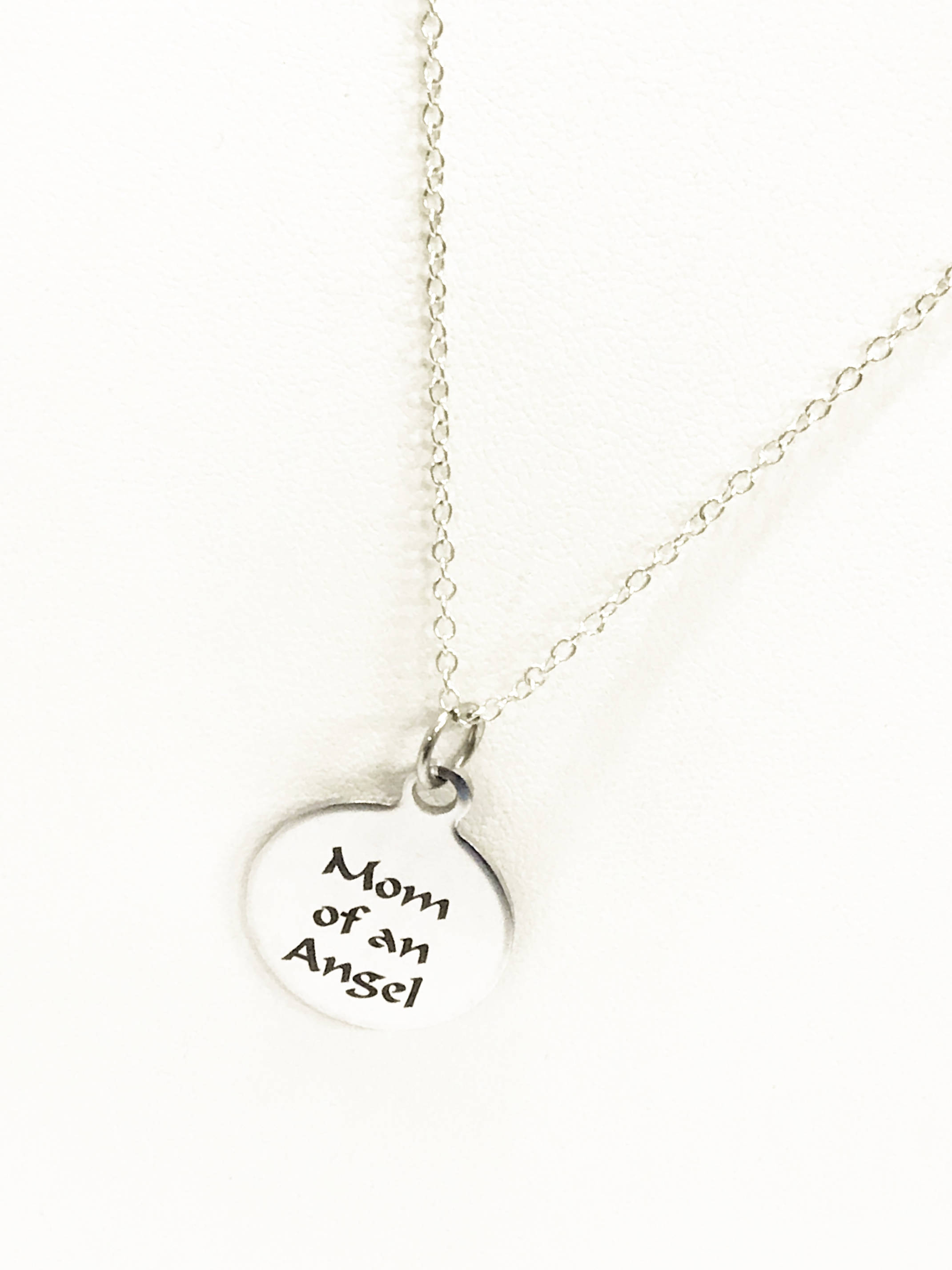 This necklace serves as a great encouragement. This is a stainless steel laser engraved pendant on a silver plated link chain. The pendant has "Mom of an Angel" on it. This pendant is available on your choice of 16, 18, 20, 22, 24, 26, 28 or 30 inch chain. The pendant is also available for individual purchase if you have another chain on which you would like to wear it.