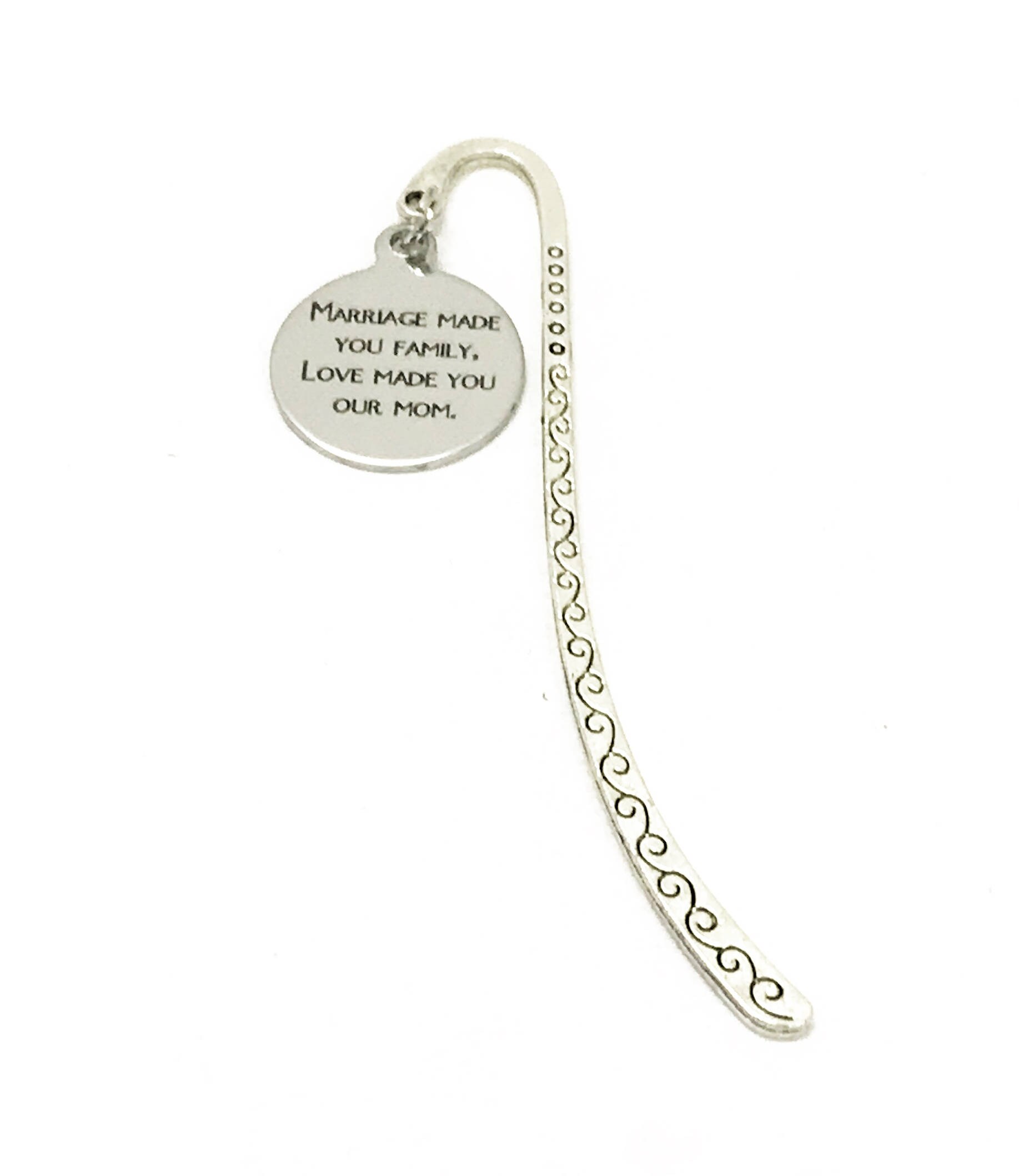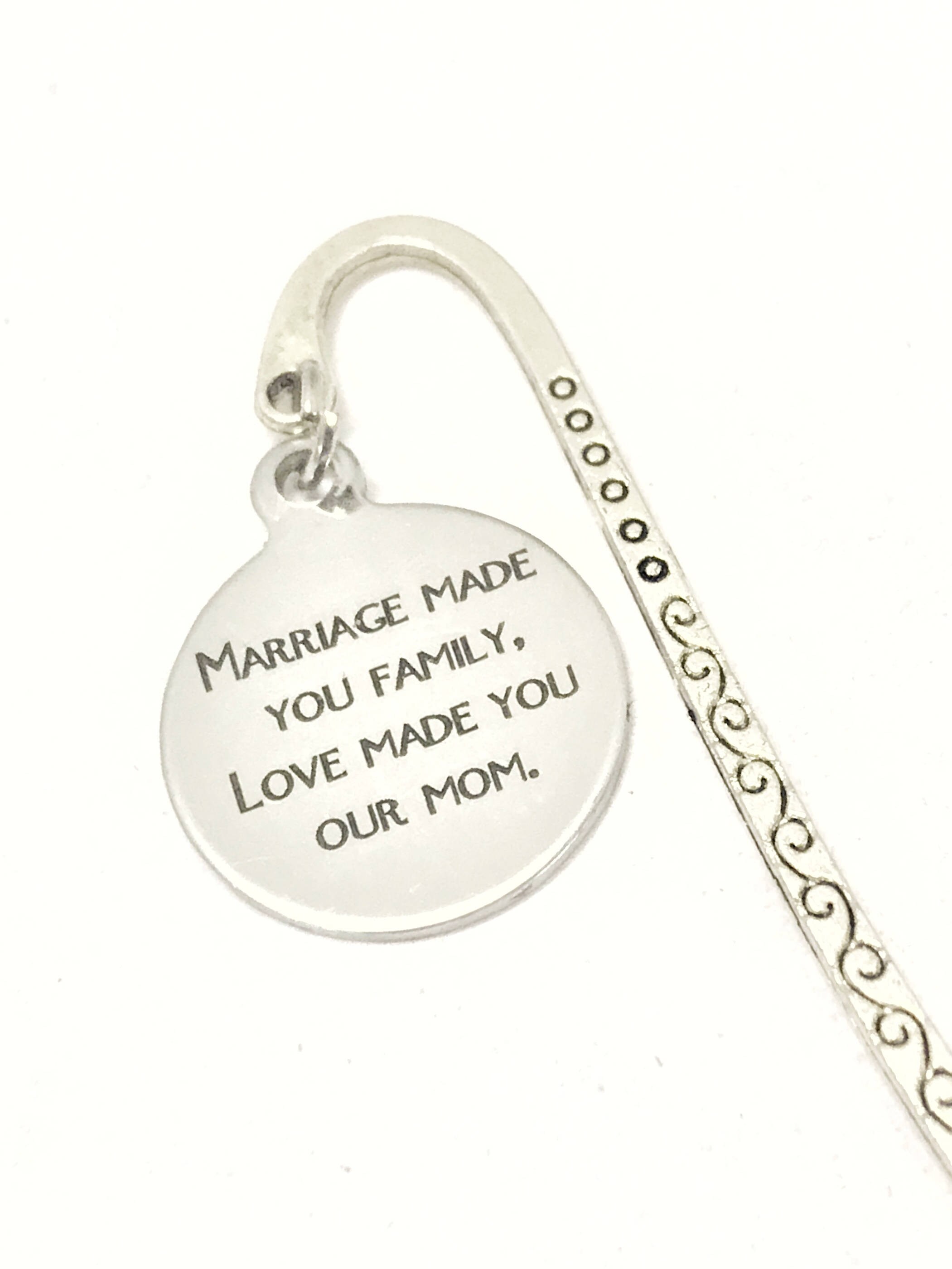 This bookmark would make a great gift for your stepmom. It has a stainless steel laser engraved charm with "Marriage made you family, love made you our mom" on it.