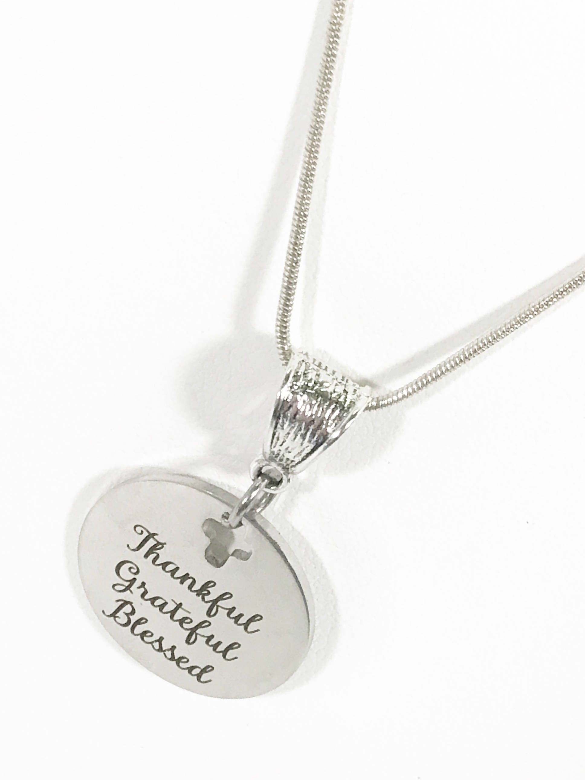 This is a stainless steel laser engraved pendant that has "Thankful Grateful Blessed" on it. This pendant is available on your choice of 16, 18, 20, 22, 24, 26, 28 or 30 inch silver plated snake chain.