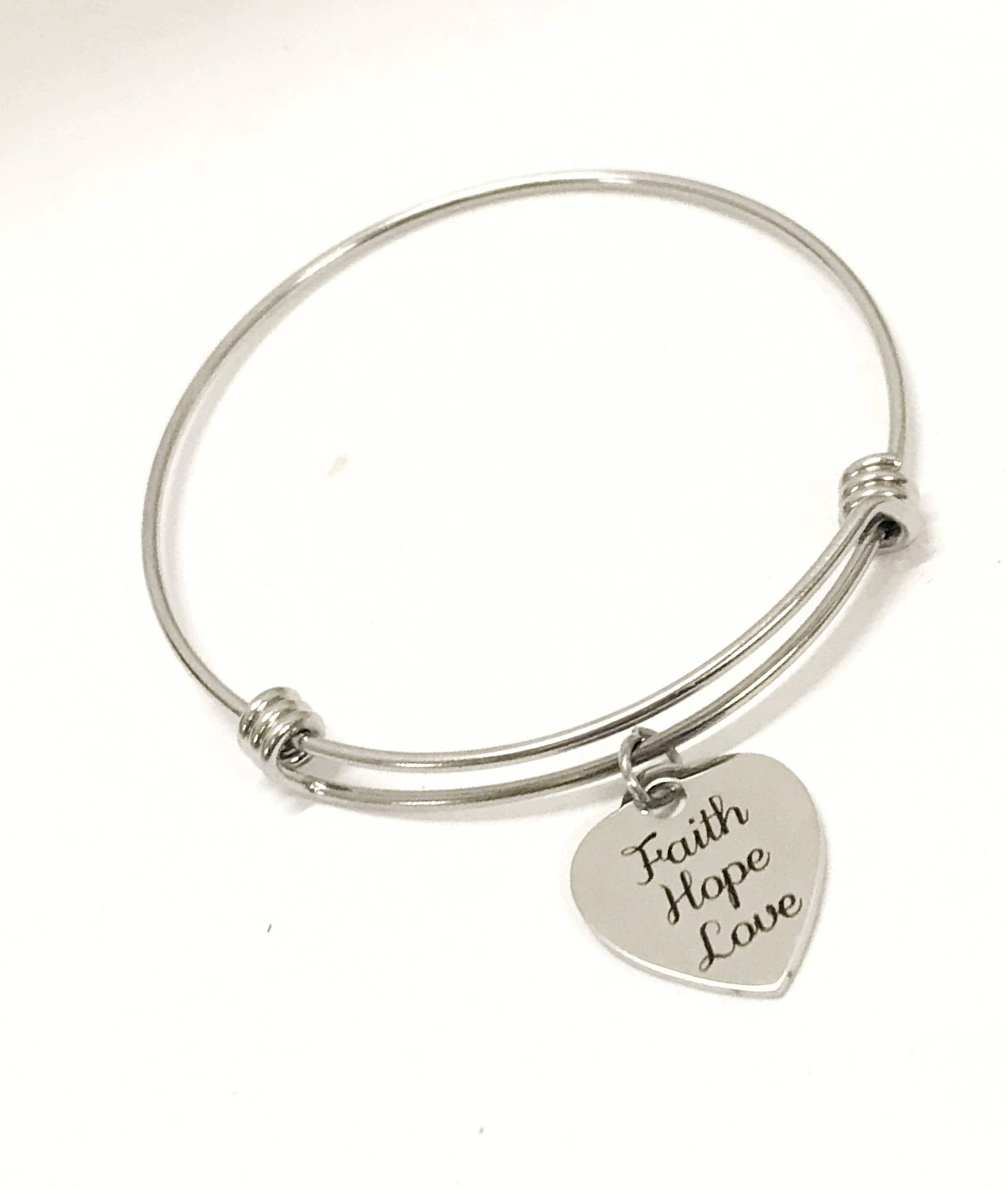 This is a beautiful bangle bracelet with a laser engraved stainless steel charm to represent the 1 Cor 13:13 Bible Verse, "Faith Hope Love".