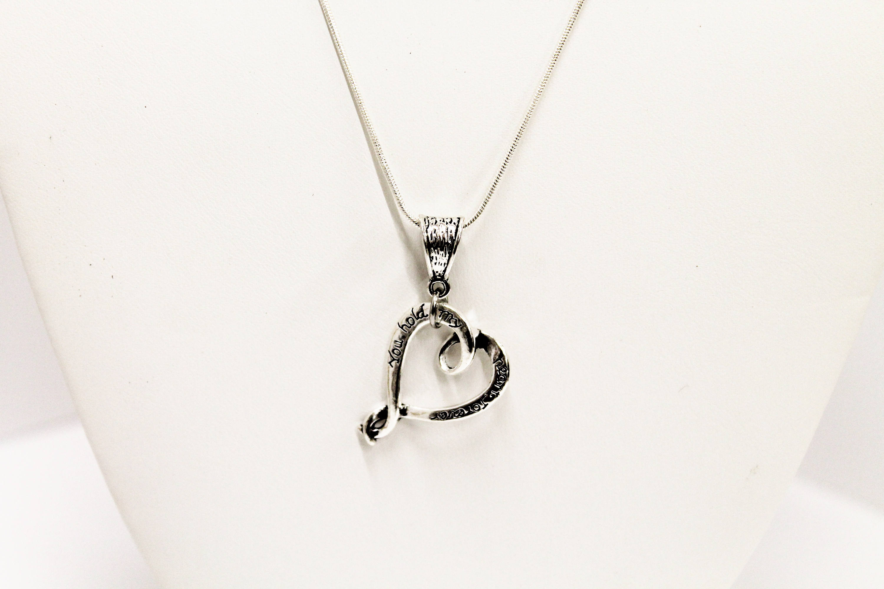 This is a silvertone heart pendant with "You hold my heart forever" on it. This pendant is available on your choice of 16, 18, 20, 22, 24, 26, 28 or 30 inch silver plated snake chain.