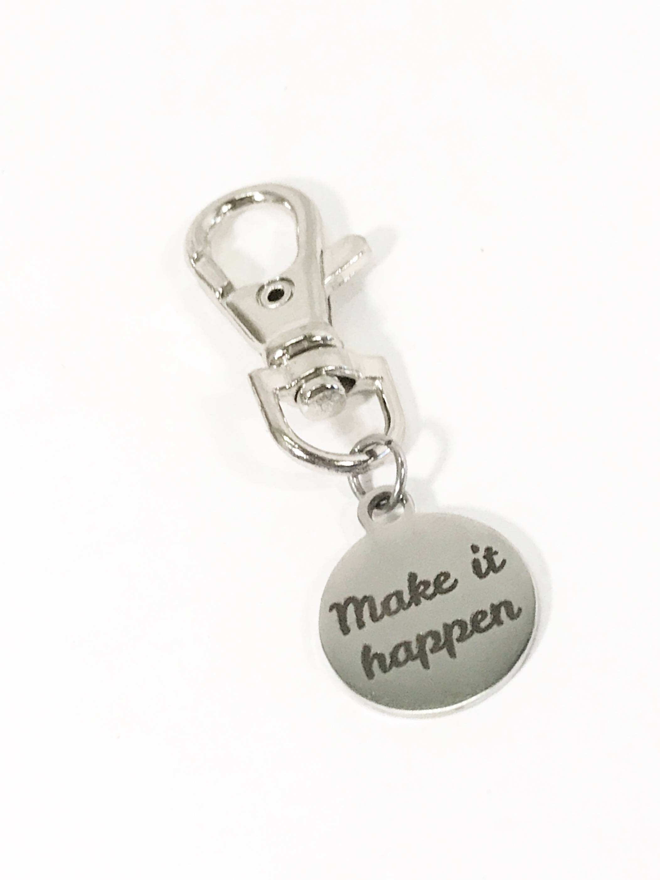 This is a zipper pull which includes a stainless steel laser engraved charm with "Make it happen" on it.
