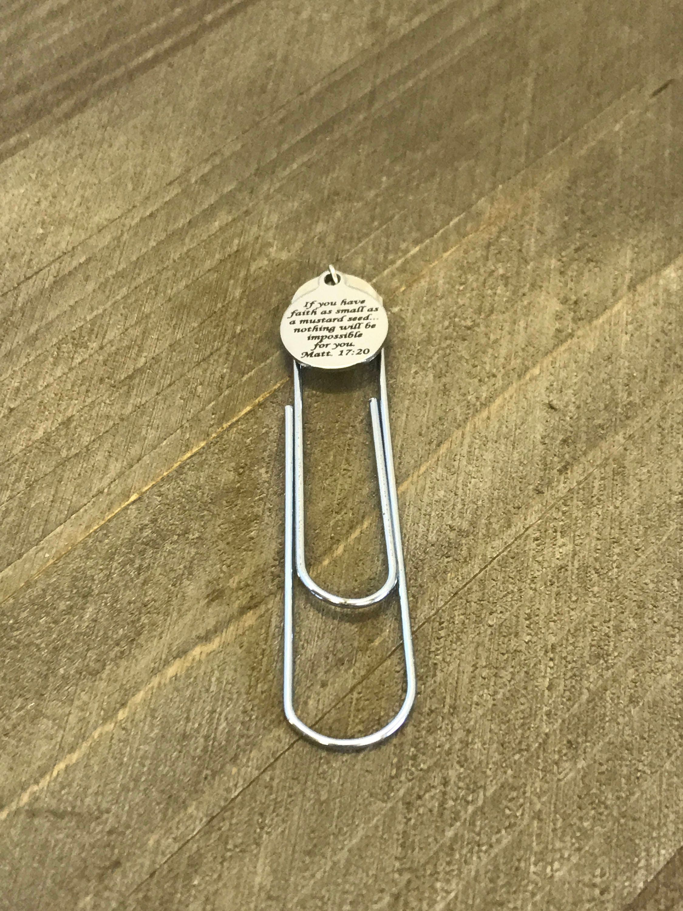 This bookmark has a stainless steel laser engraved charm with the Bible verse of Matthew 17:20 on it. It can be used as a bookmark, page marker, or planner book mark.